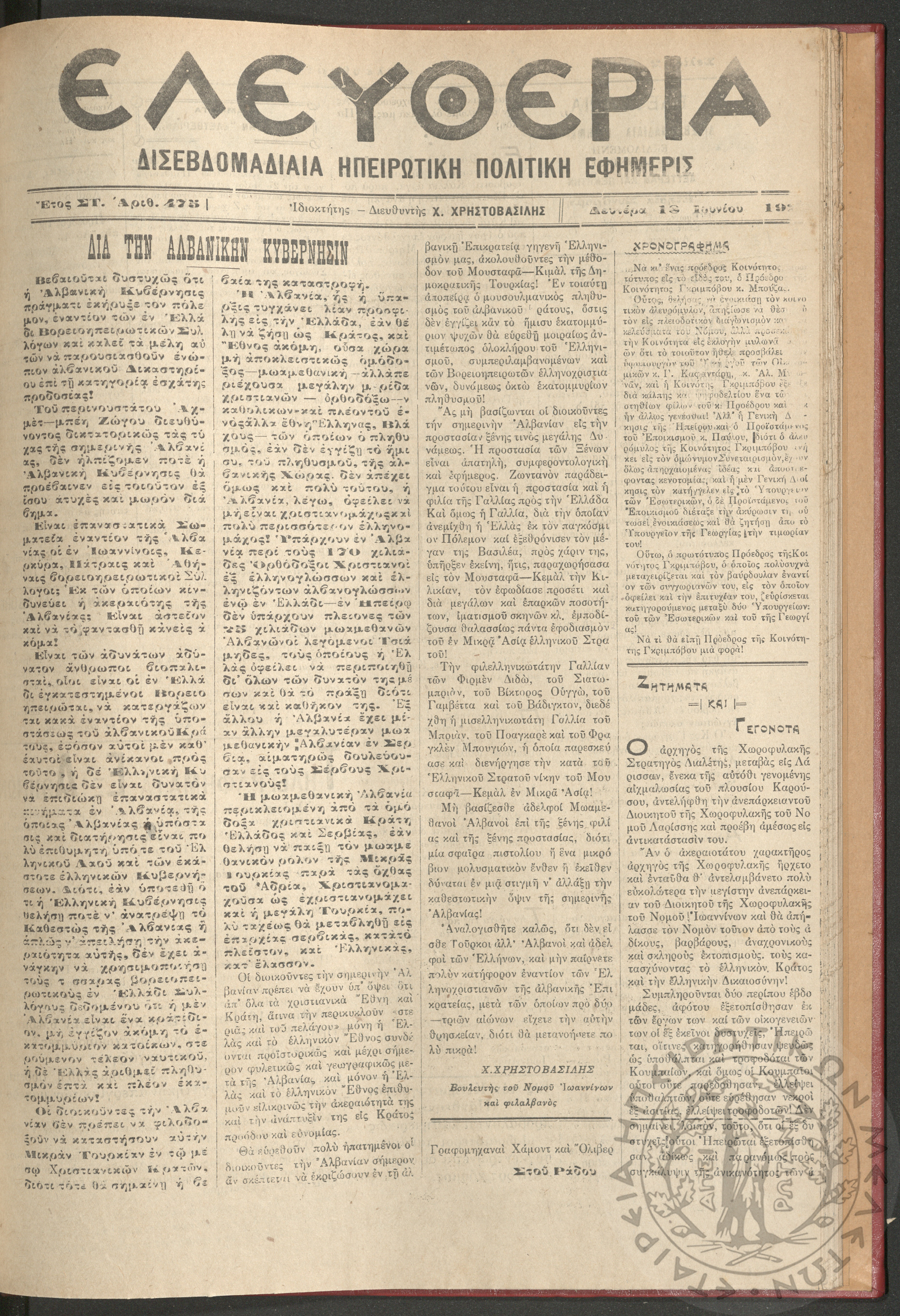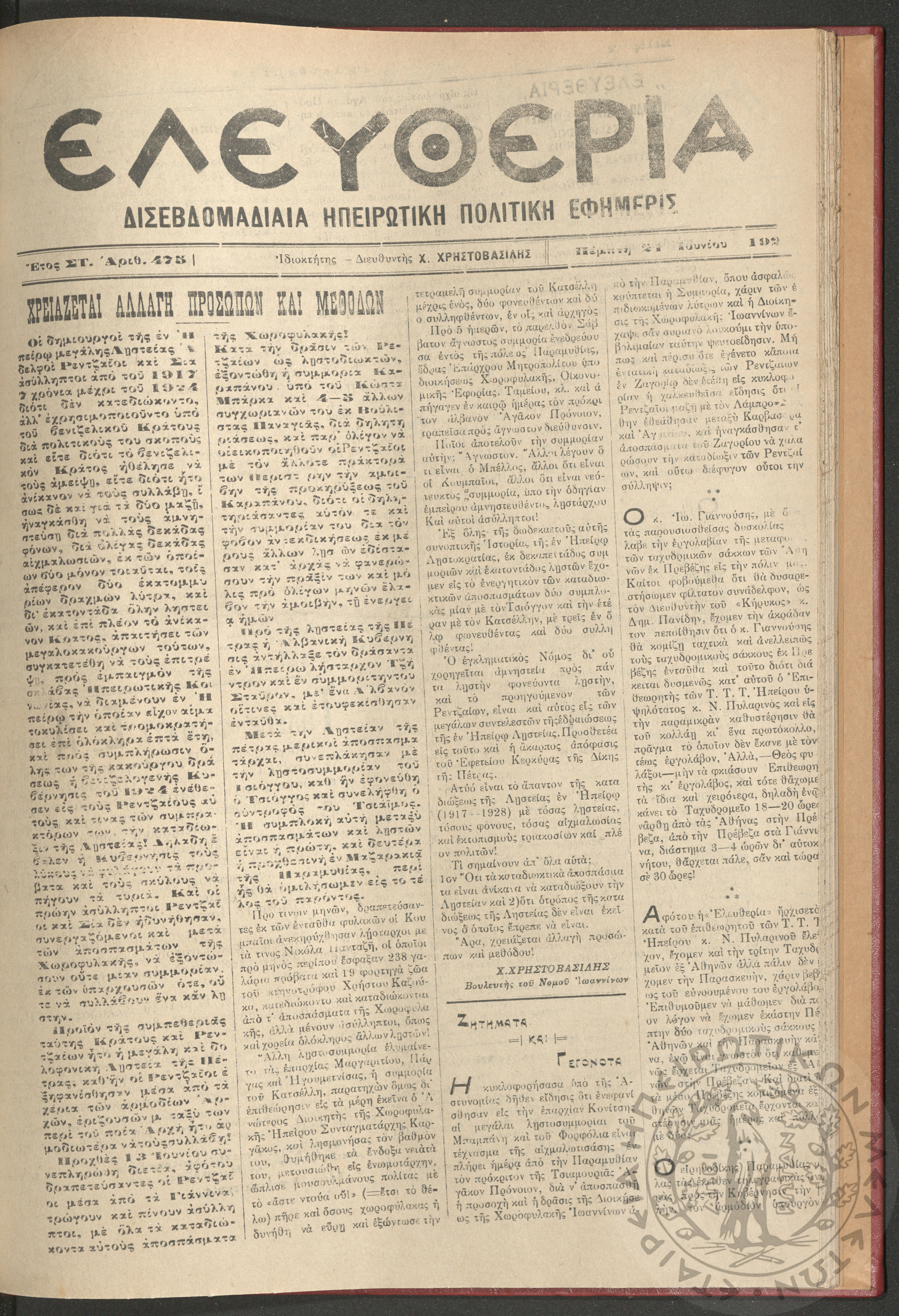 Ελευθερία: δισεβδομαδιαία Ηπειρωτική πολιτική εφημερίς, 1928, φ. 475