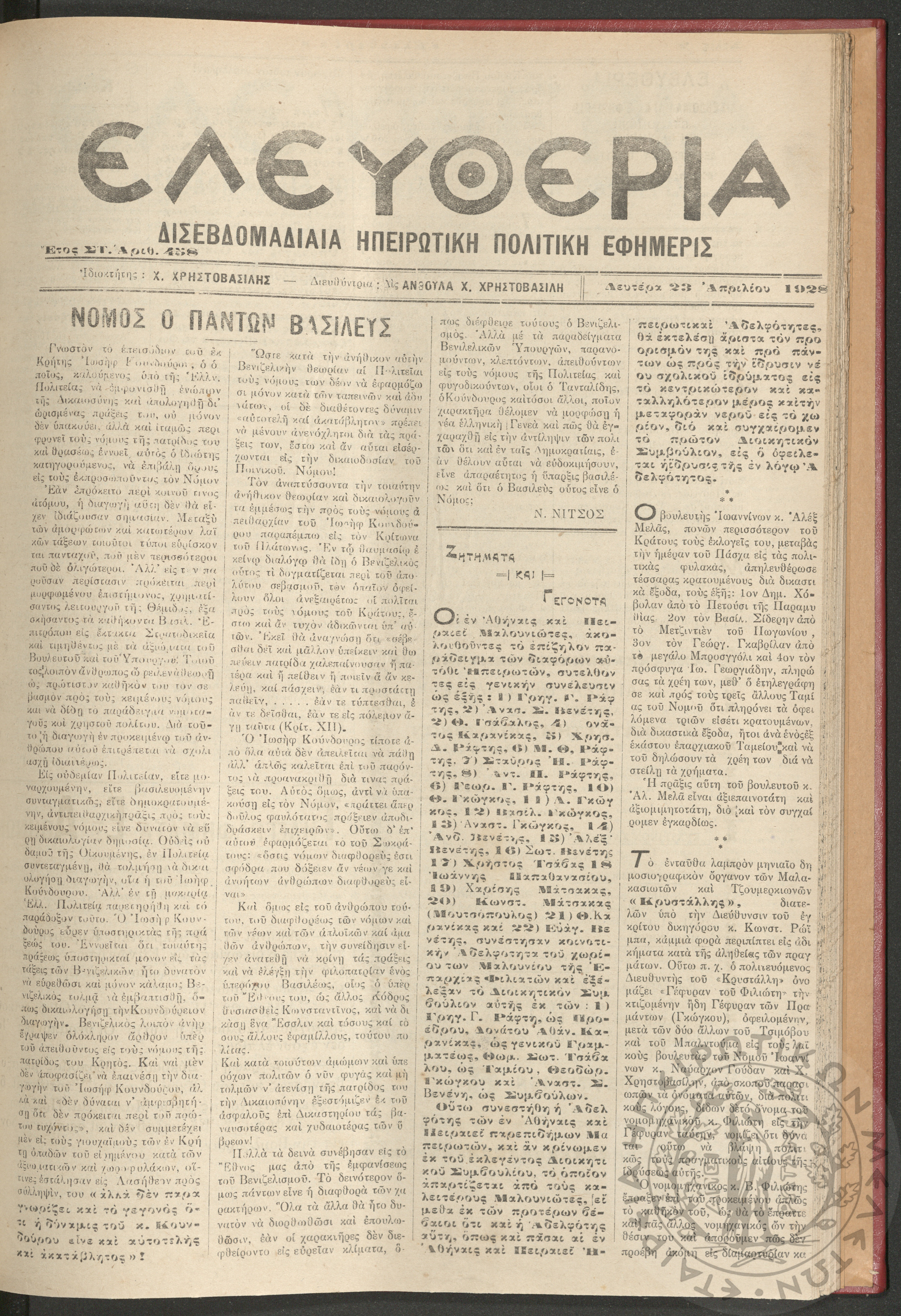Ελευθερία: δισεβδομαδιαία Ηπειρωτική πολιτική εφημερίς, 1928, φ. 458
