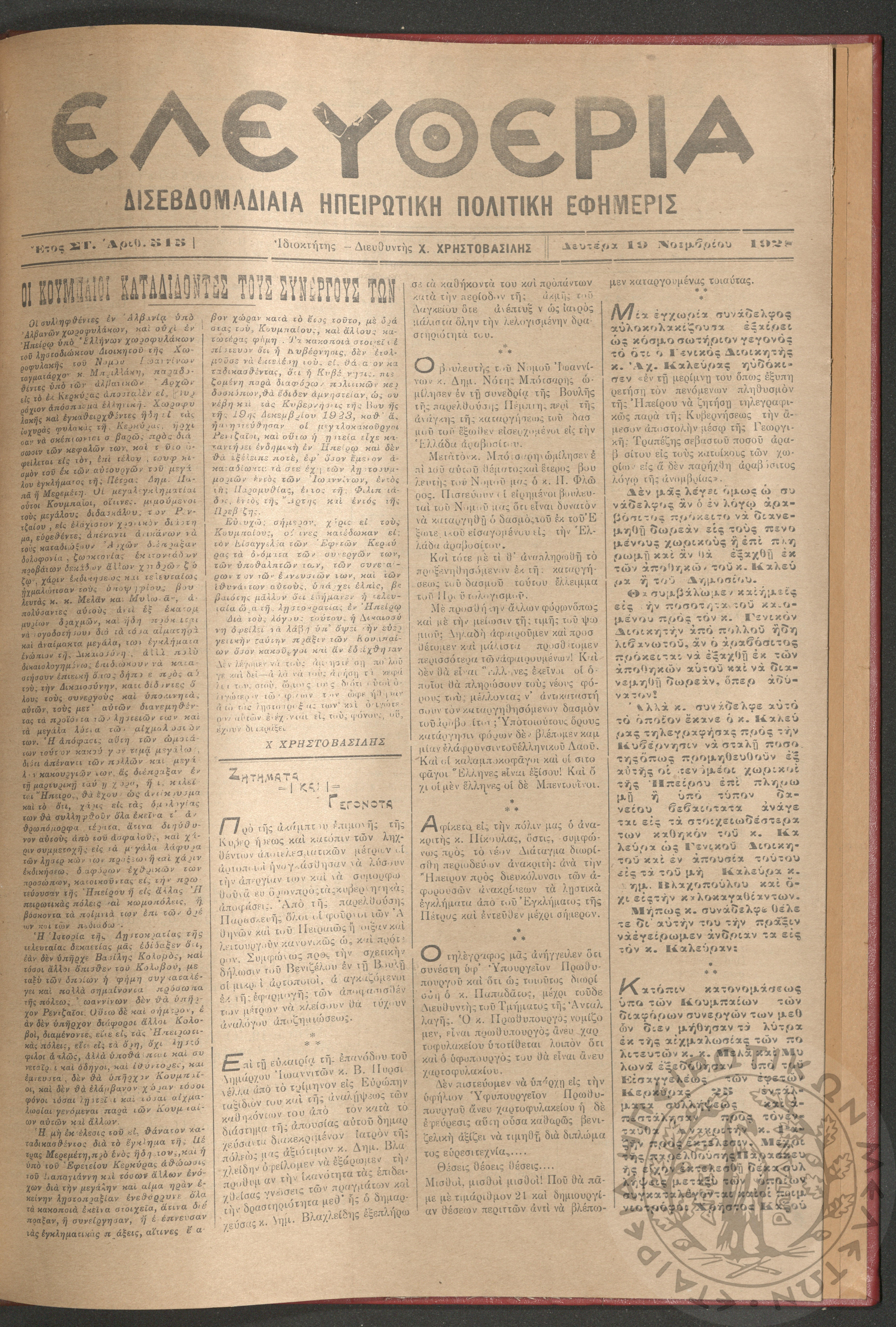 Ελευθερία: δισεβδομαδιαία Ηπειρωτική πολιτική εφημερίς, 1928, φ. 515