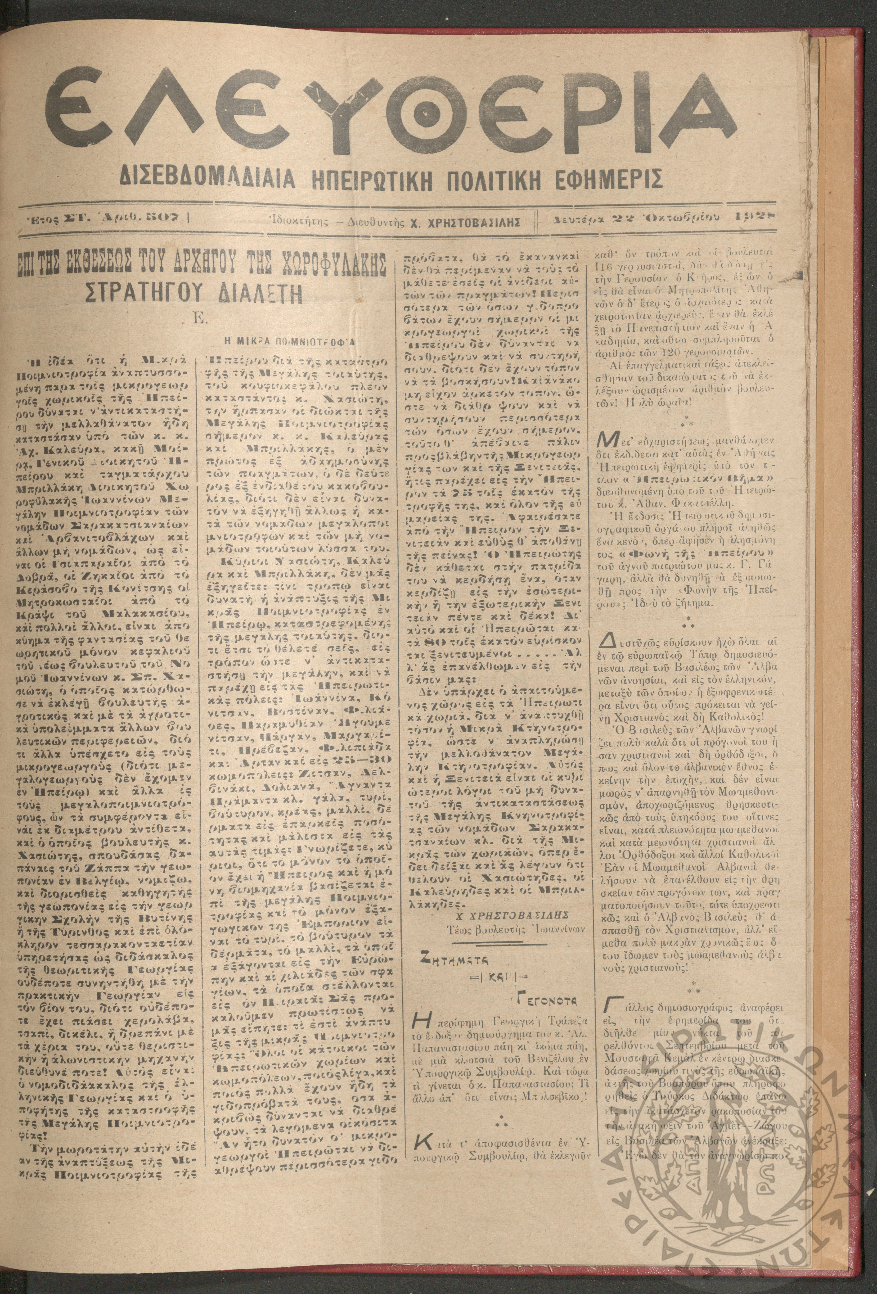 Ελευθερία: δισεβδομαδιαία Ηπειρωτική πολιτική εφημερίς, 1928, φ. 507