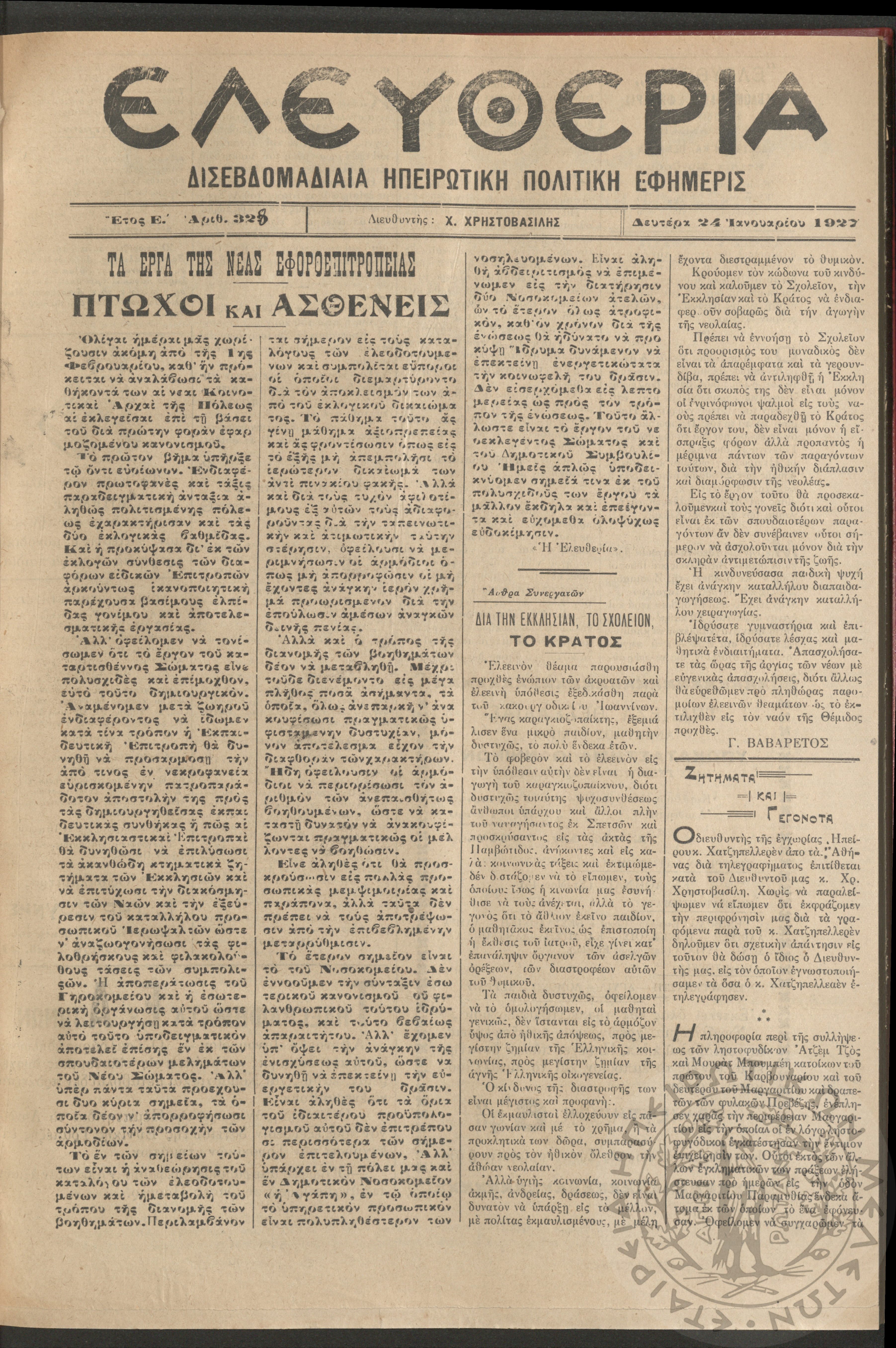 Ελευθερία: δισεβδομαδιαία Ηπειρωτική πολιτική εφημερίς, 1927, φ. 328