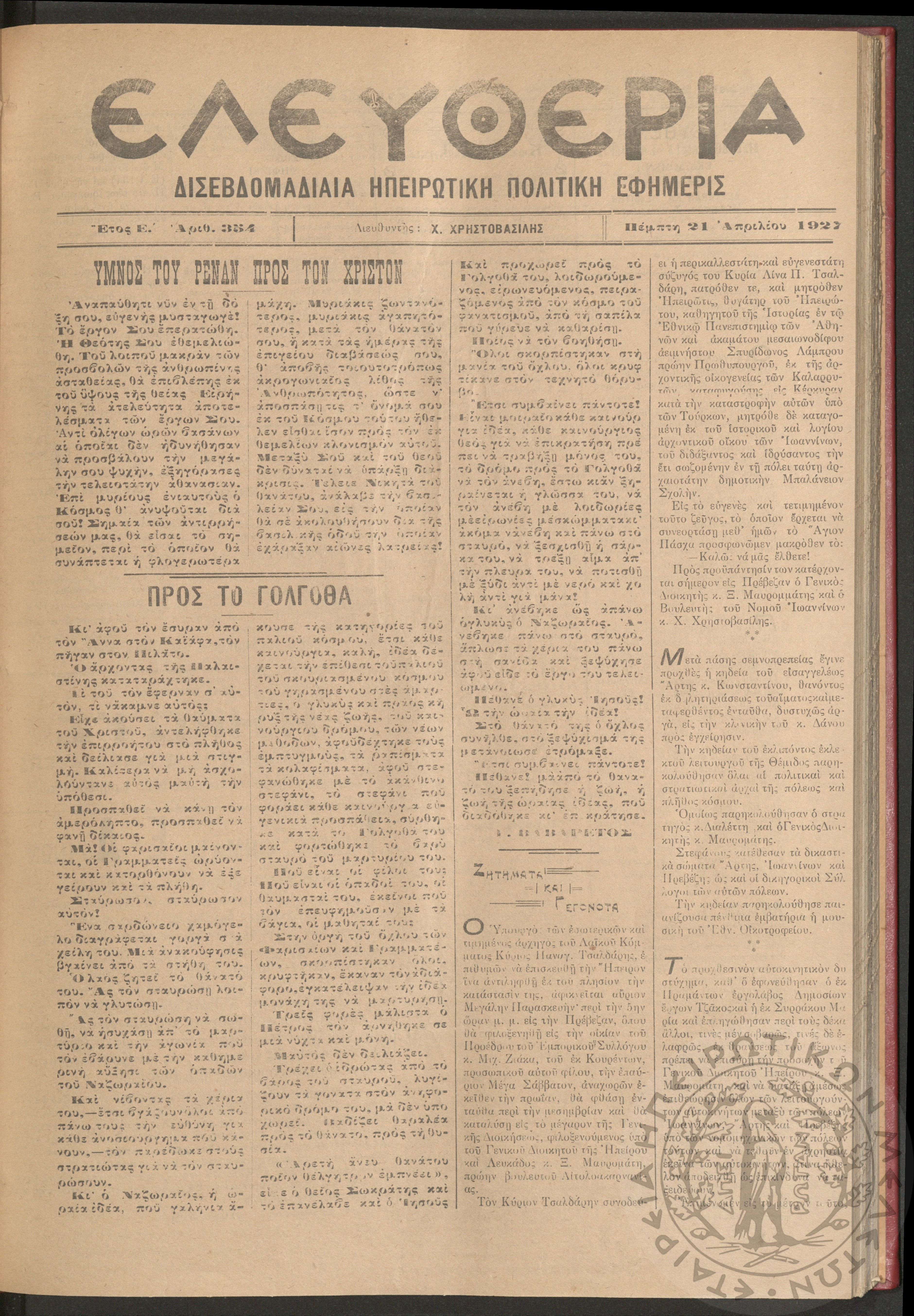Ελευθερία: δισεβδομαδιαία Ηπειρωτική πολιτική εφημερίς, 1927, φ. 354