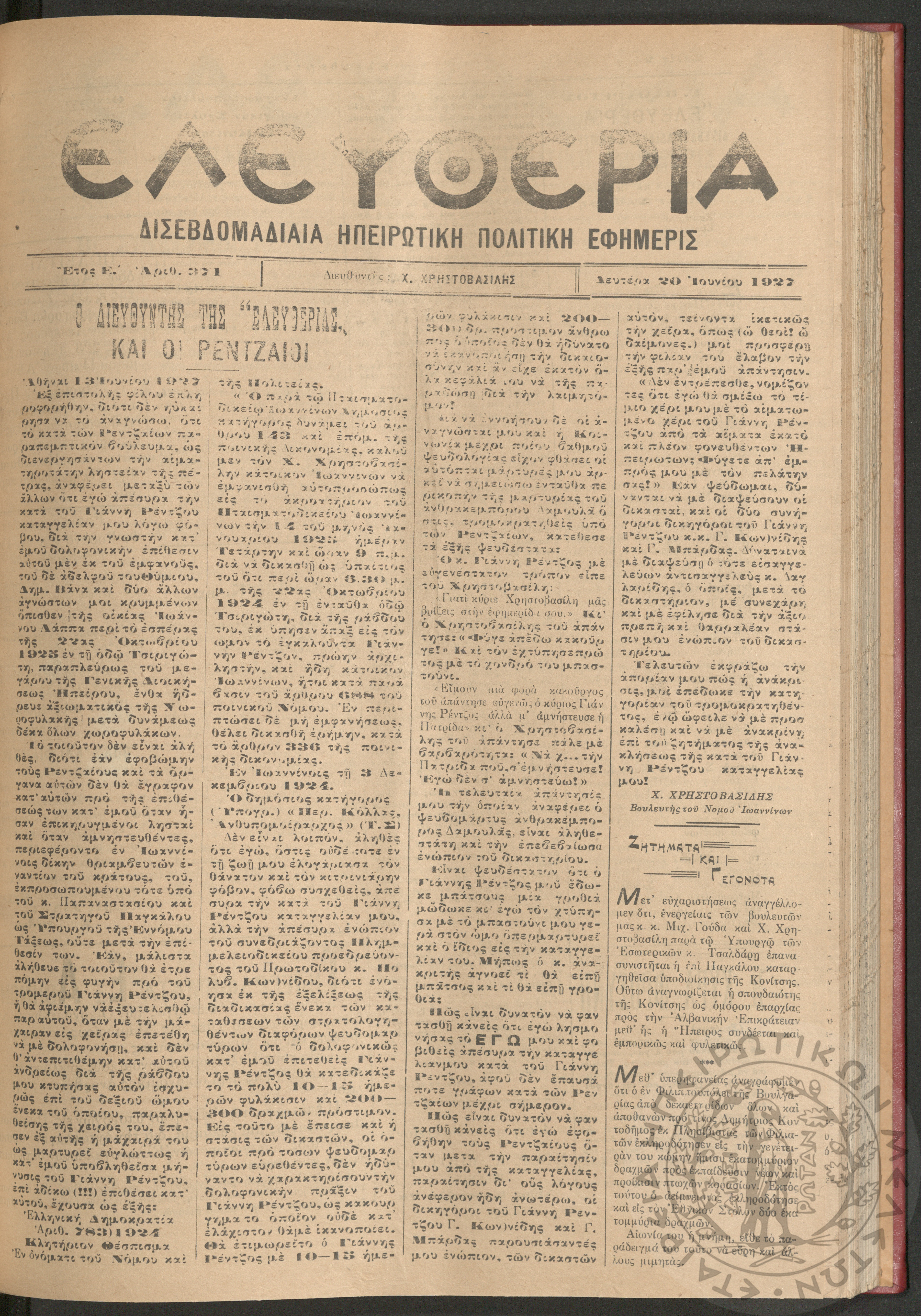 Ελευθερία: δισεβδομαδιαία Ηπειρωτική πολιτική εφημερίς, 1927, φ. 371