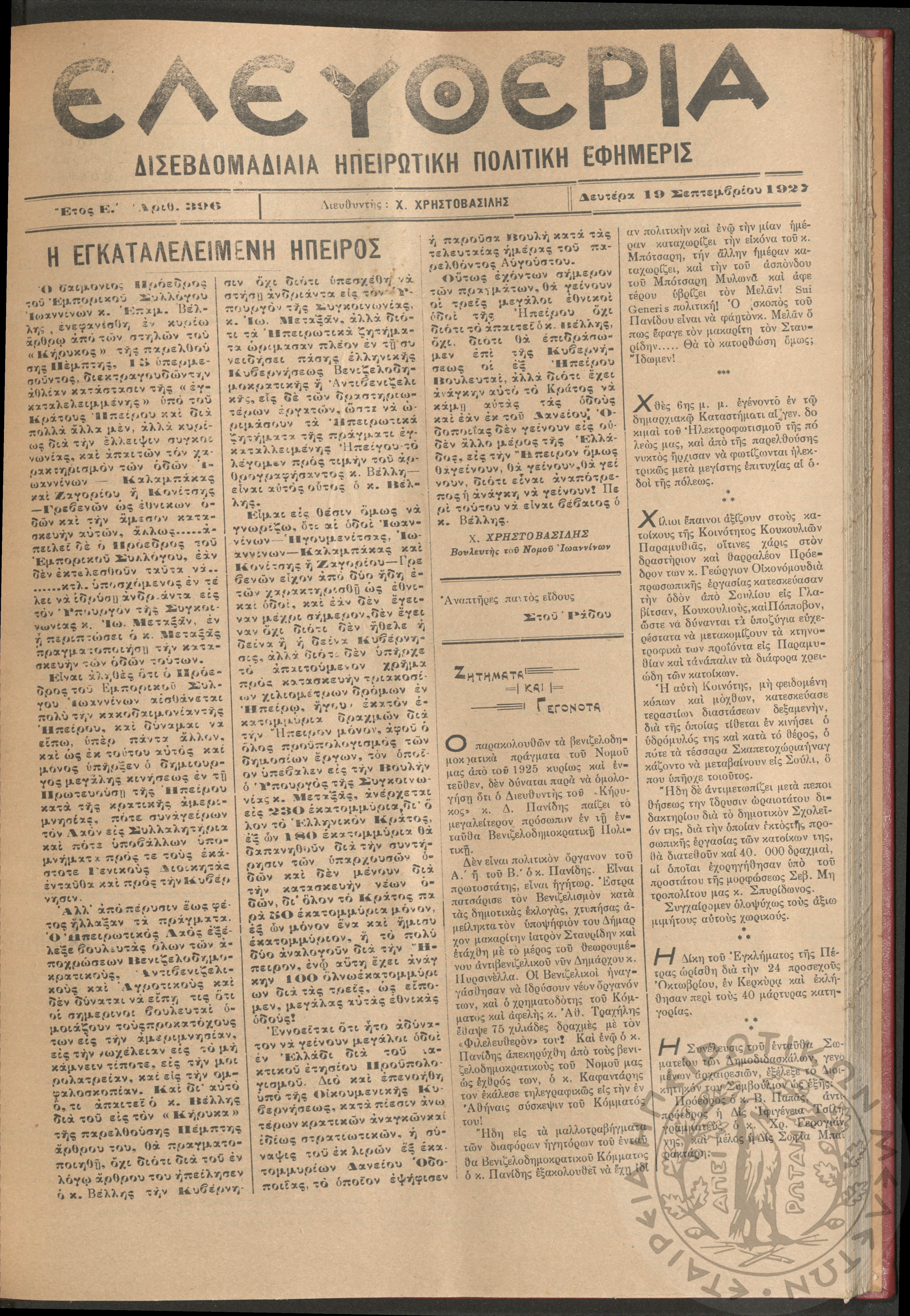 Ελευθερία: δισεβδομαδιαία Ηπειρωτική πολιτική εφημερίς, 1927, φ. 396