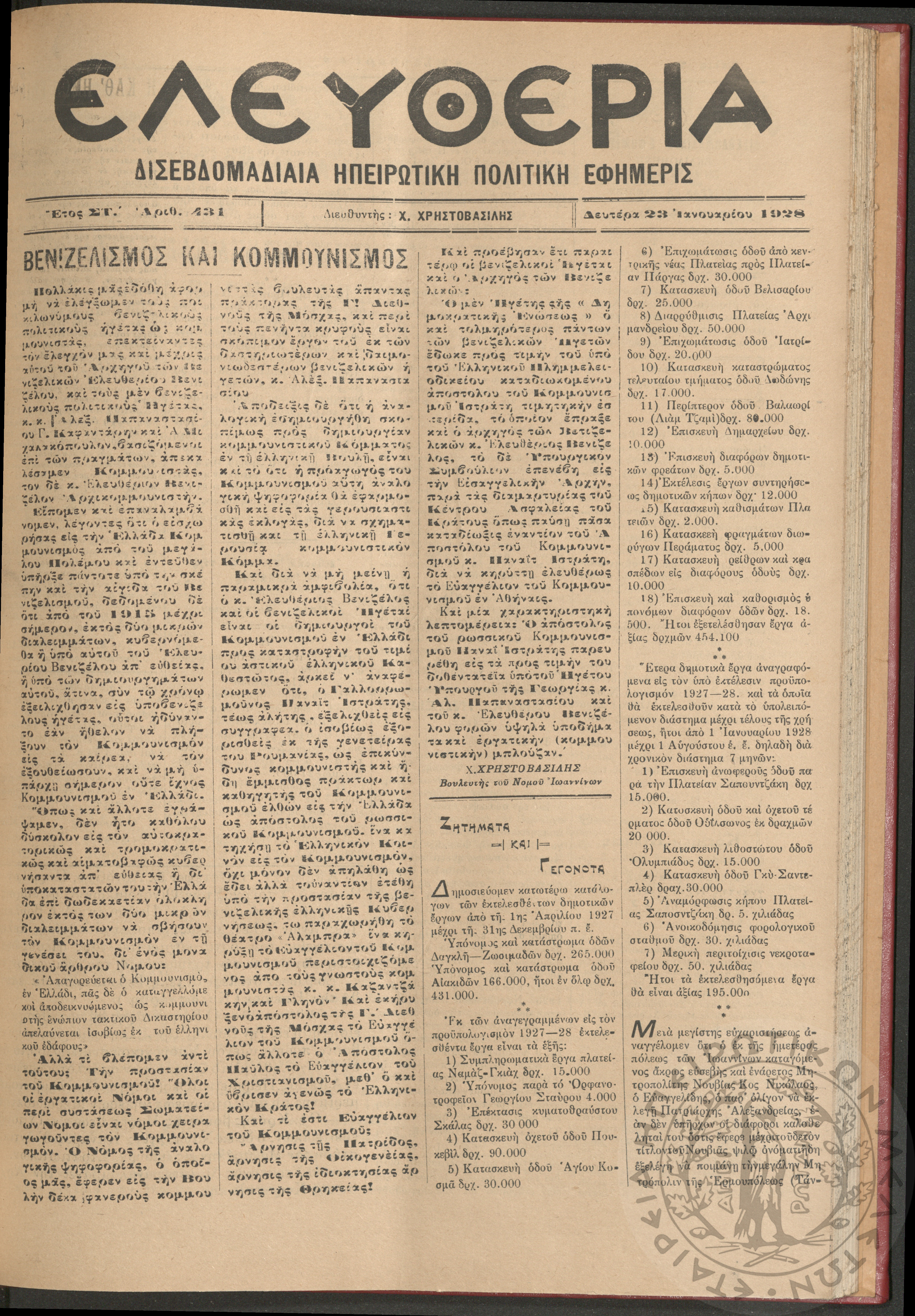 Ελευθερία: δισεβδομαδιαία Ηπειρωτική πολιτική εφημερίς, 1928, φ. 431