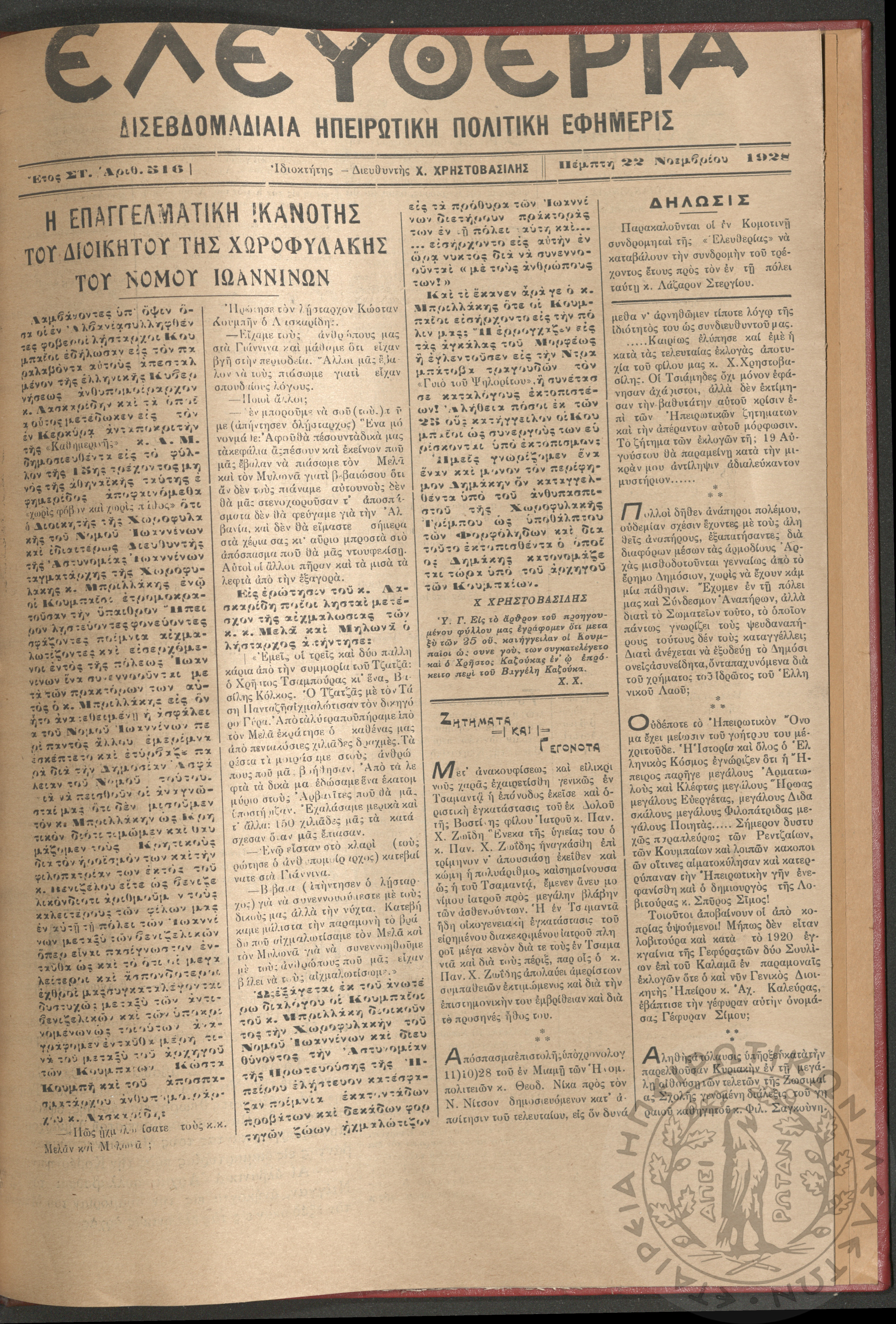 Ελευθερία: δισεβδομαδιαία Ηπειρωτική πολιτική εφημερίς, 1928, φ. 516