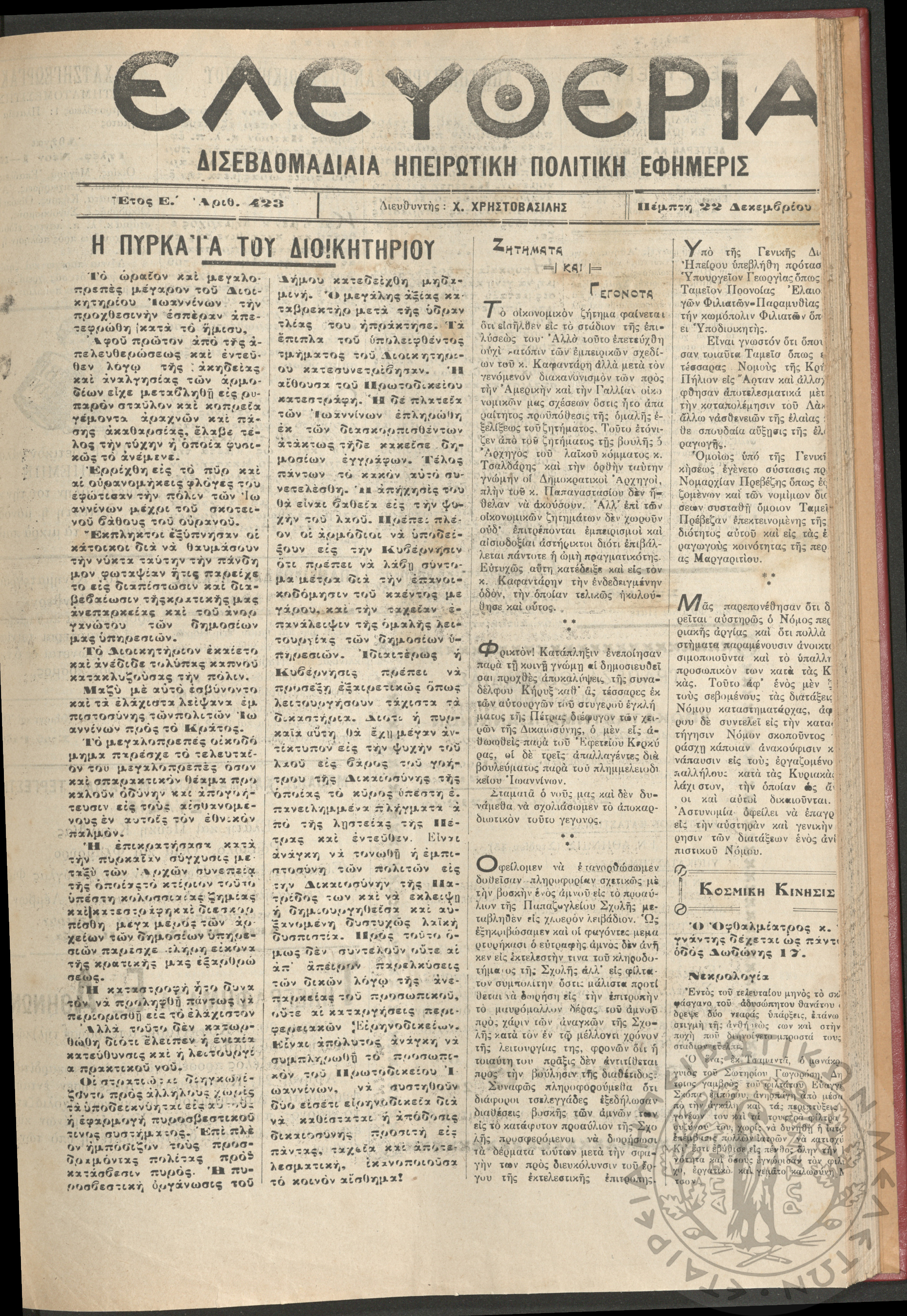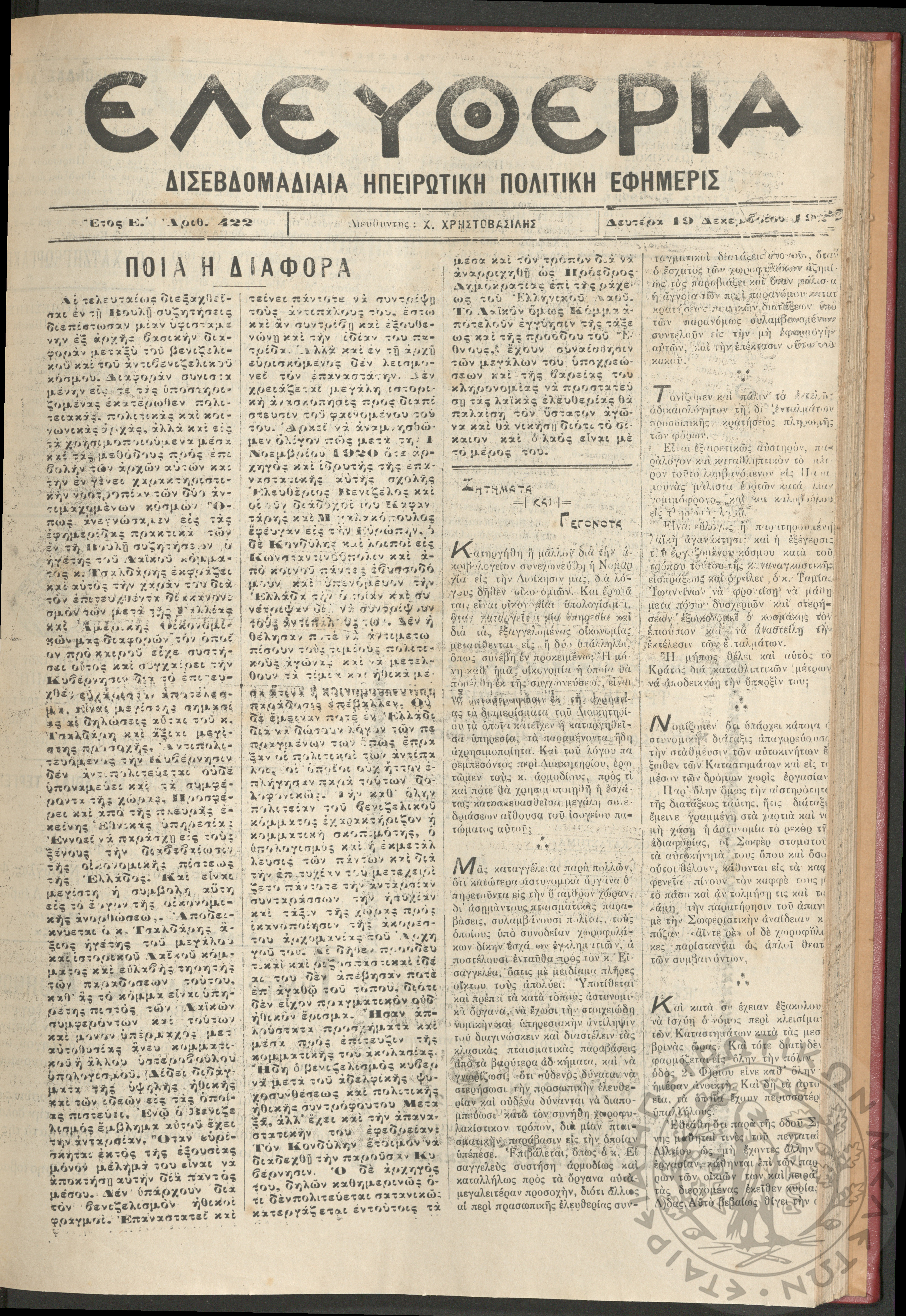 Ελευθερία: δισεβδομαδιαία Ηπειρωτική πολιτική εφημερίς, 1927, φ. 422
