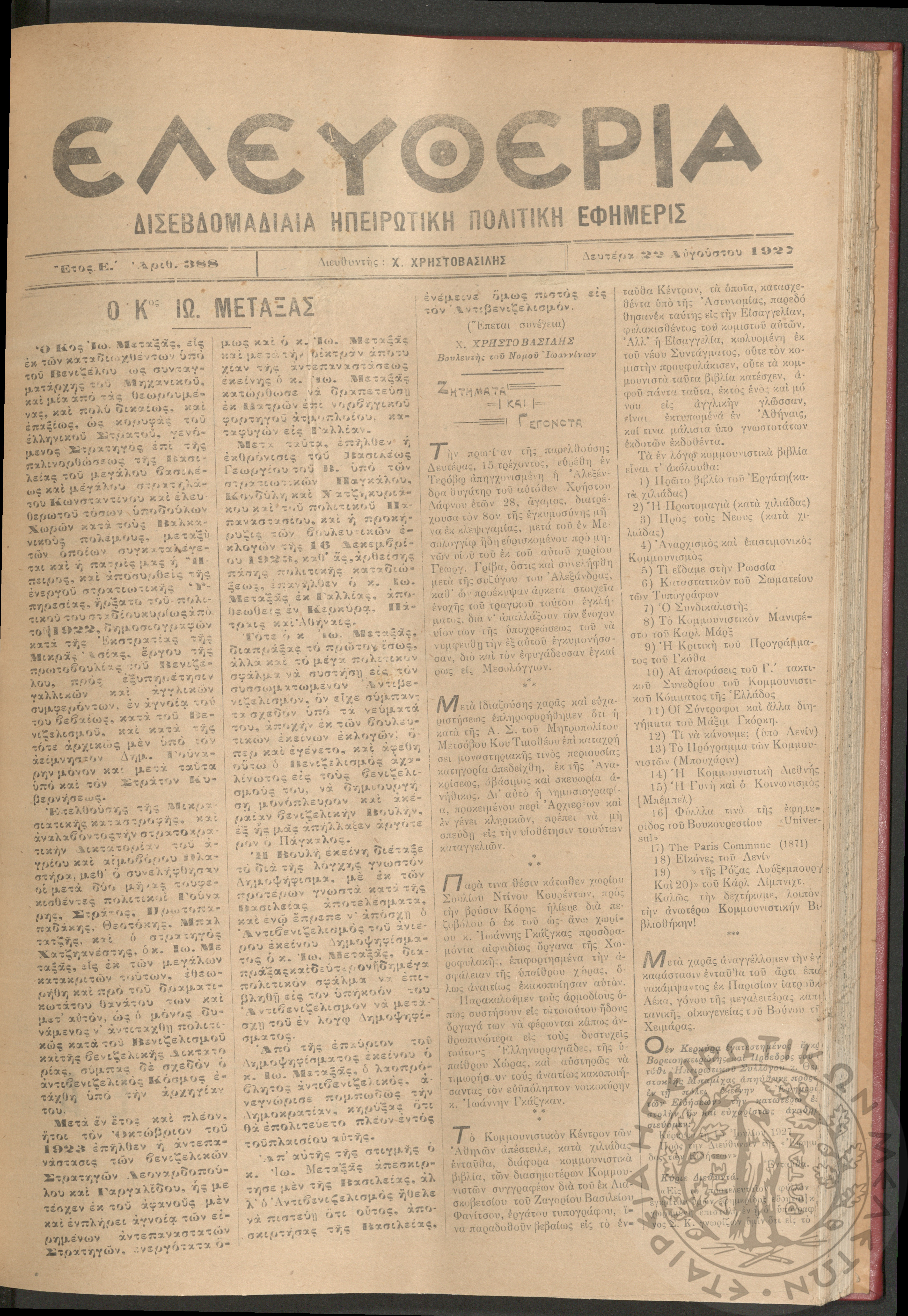 Ελευθερία: δισεβδομαδιαία Ηπειρωτική πολιτική εφημερίς, 1927, φ. 388