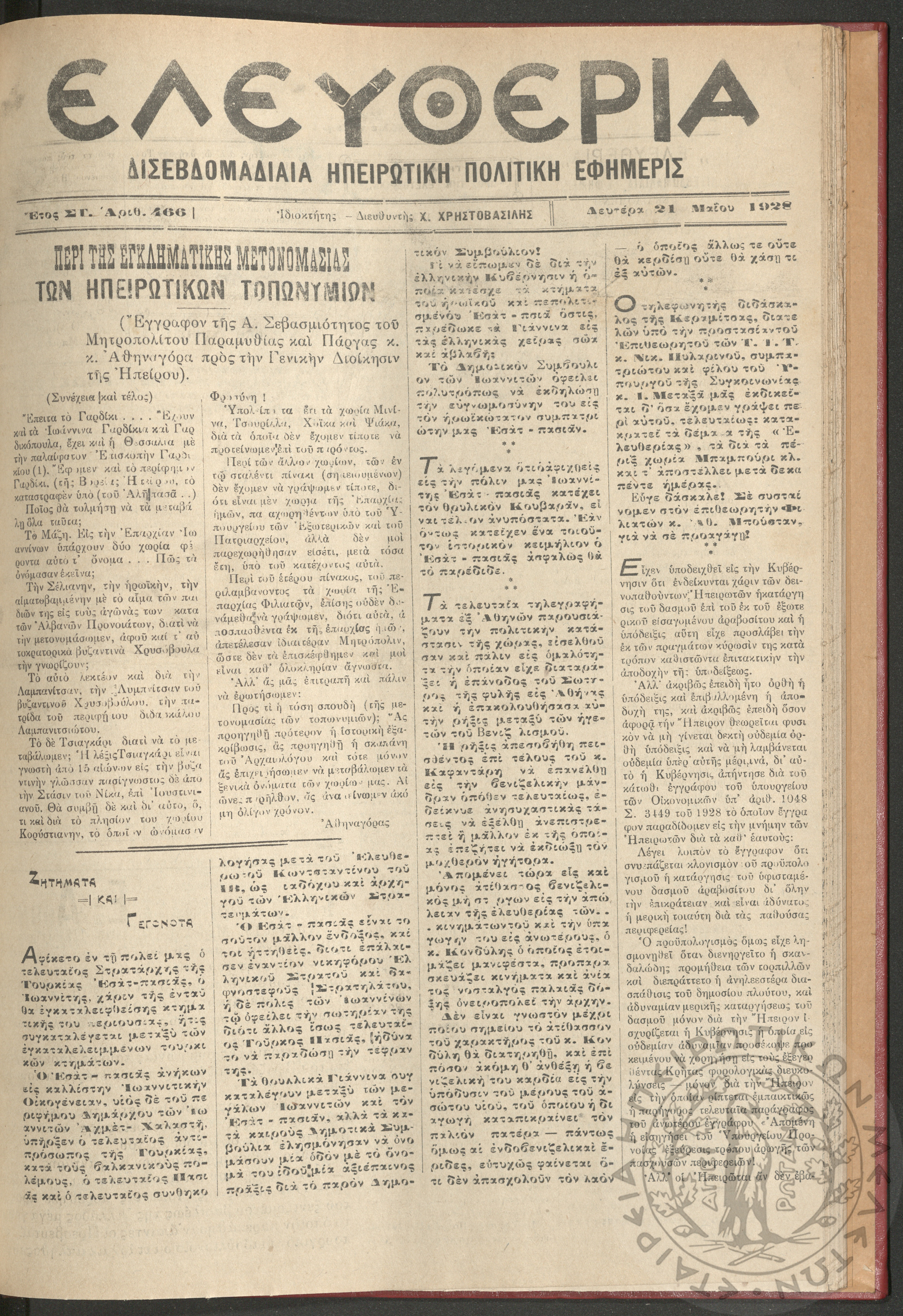 Ελευθερία: δισεβδομαδιαία Ηπειρωτική πολιτική εφημερίς, 1928, φ. 466