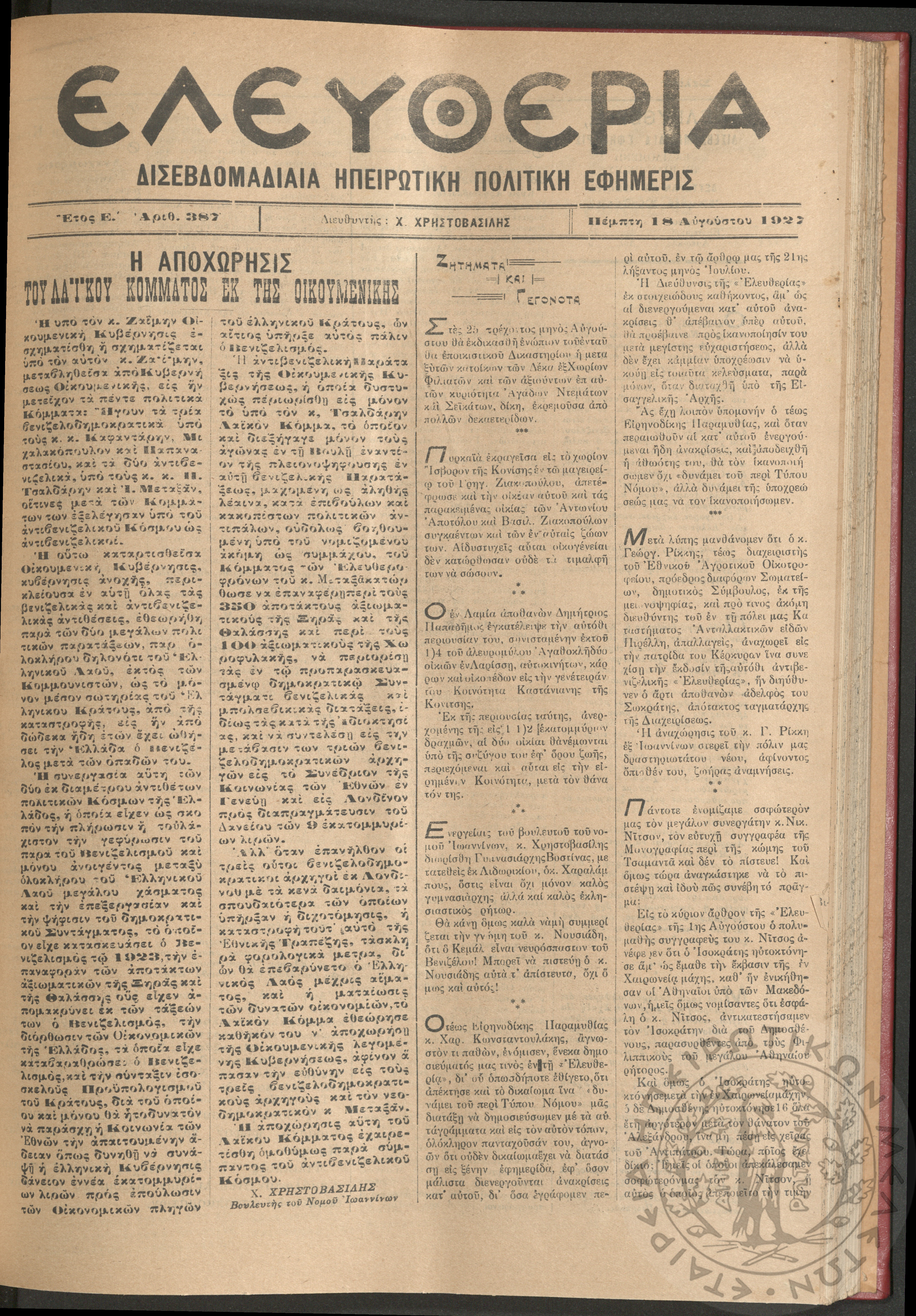 Ελευθερία: δισεβδομαδιαία Ηπειρωτική πολιτική εφημερίς, 1927, φ. 387