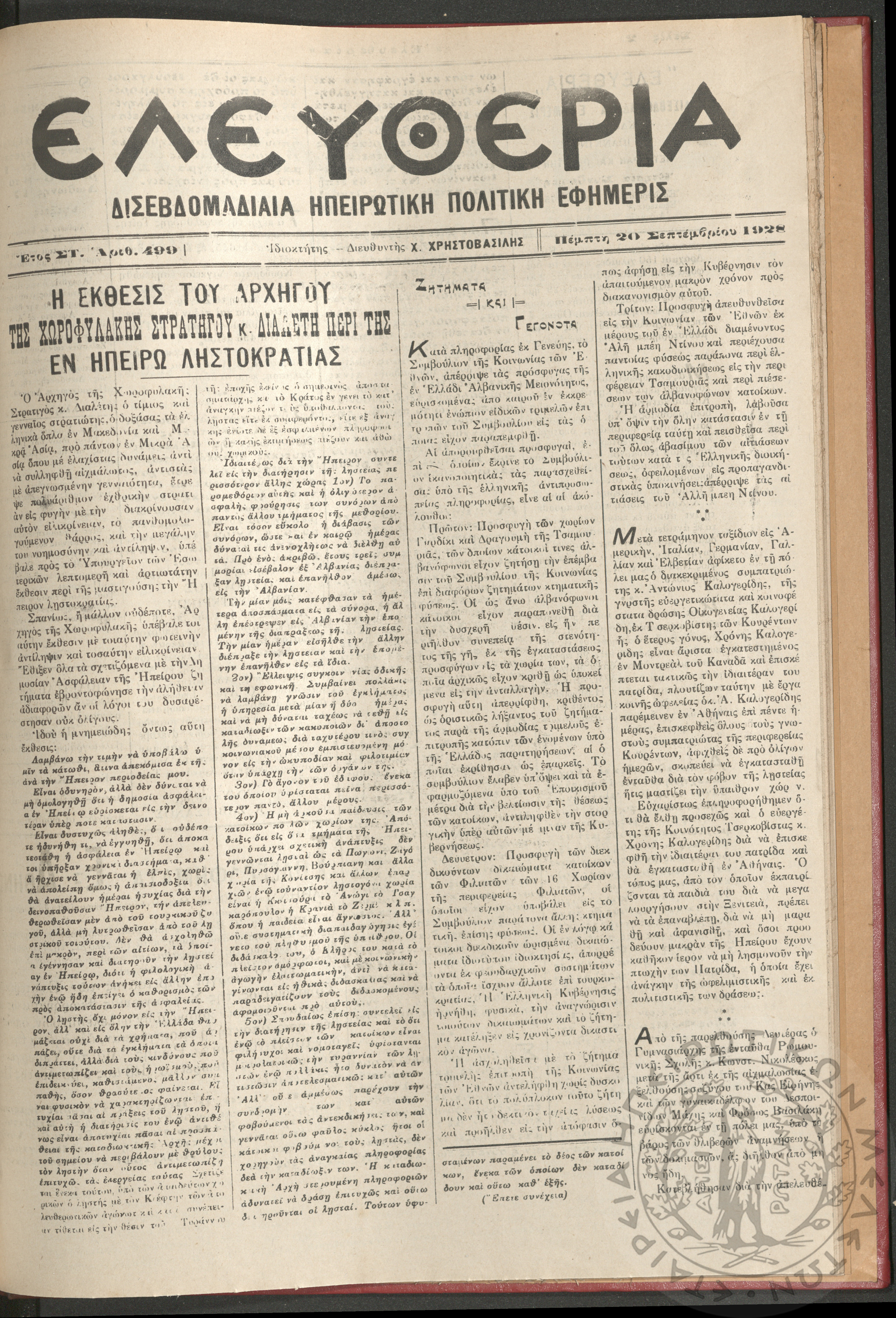 Ελευθερία: δισεβδομαδιαία Ηπειρωτική πολιτική εφημερίς, 1928, φ. 499