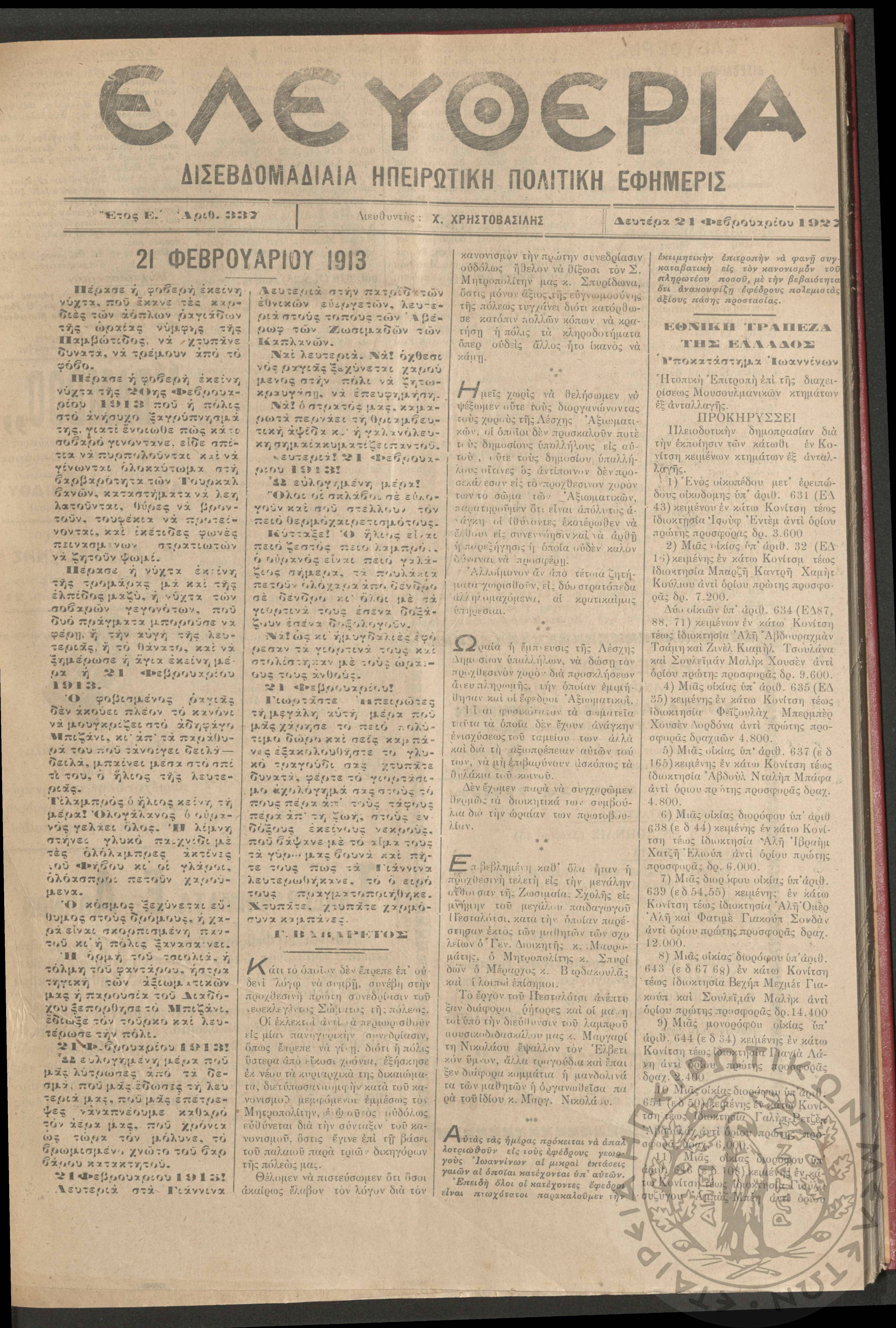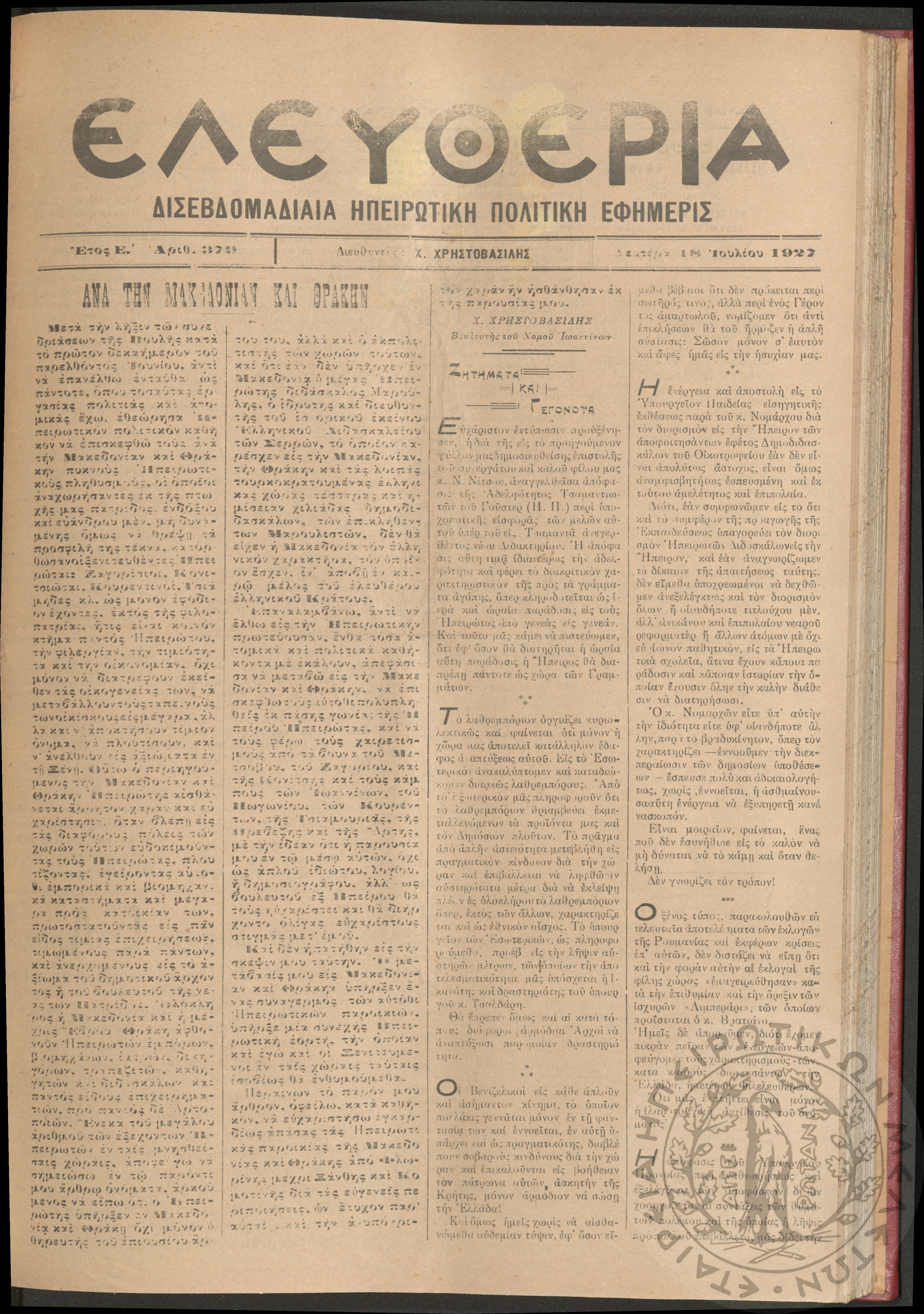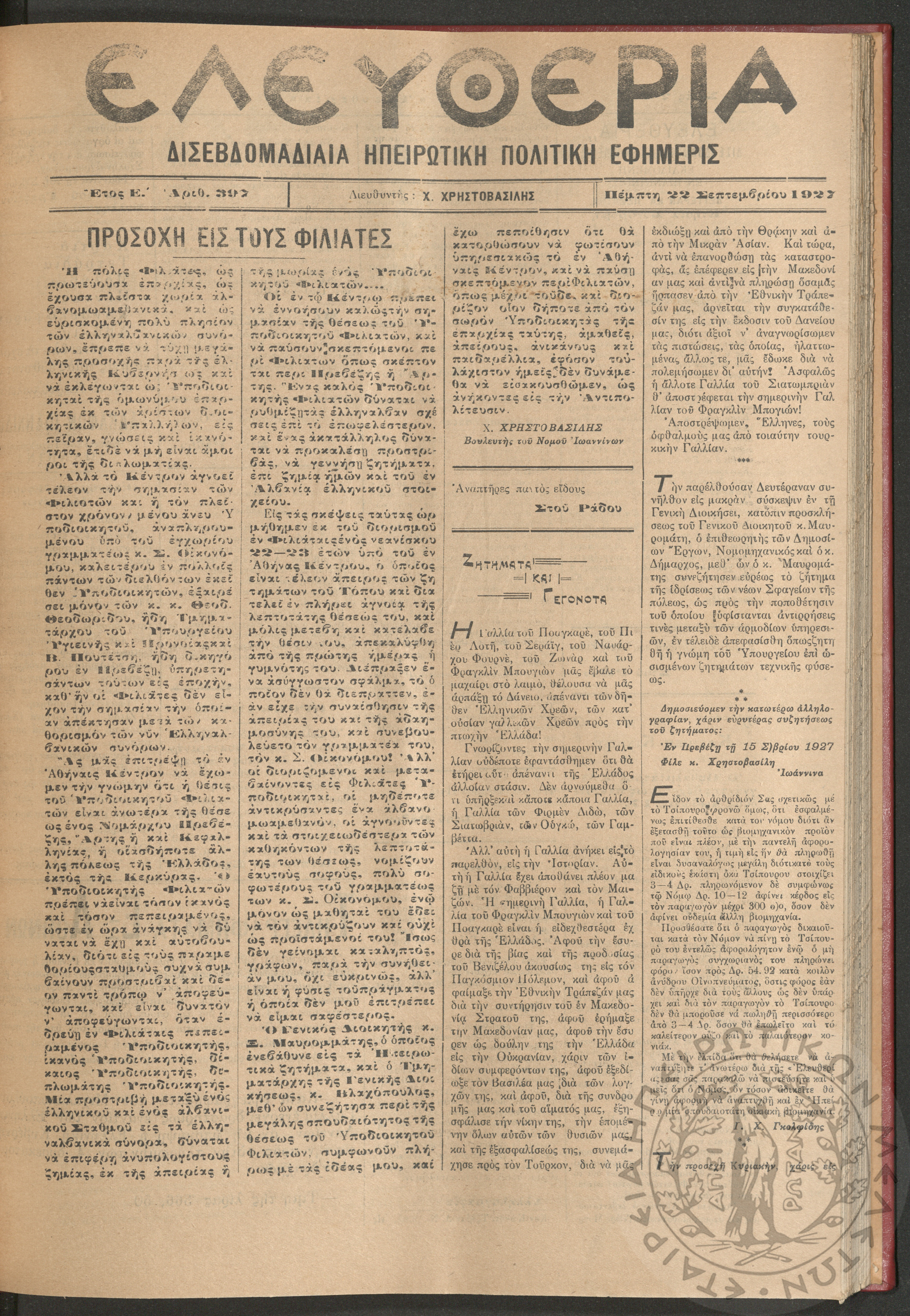 Ελευθερία: δισεβδομαδιαία Ηπειρωτική πολιτική εφημερίς, 1927, φ. 337