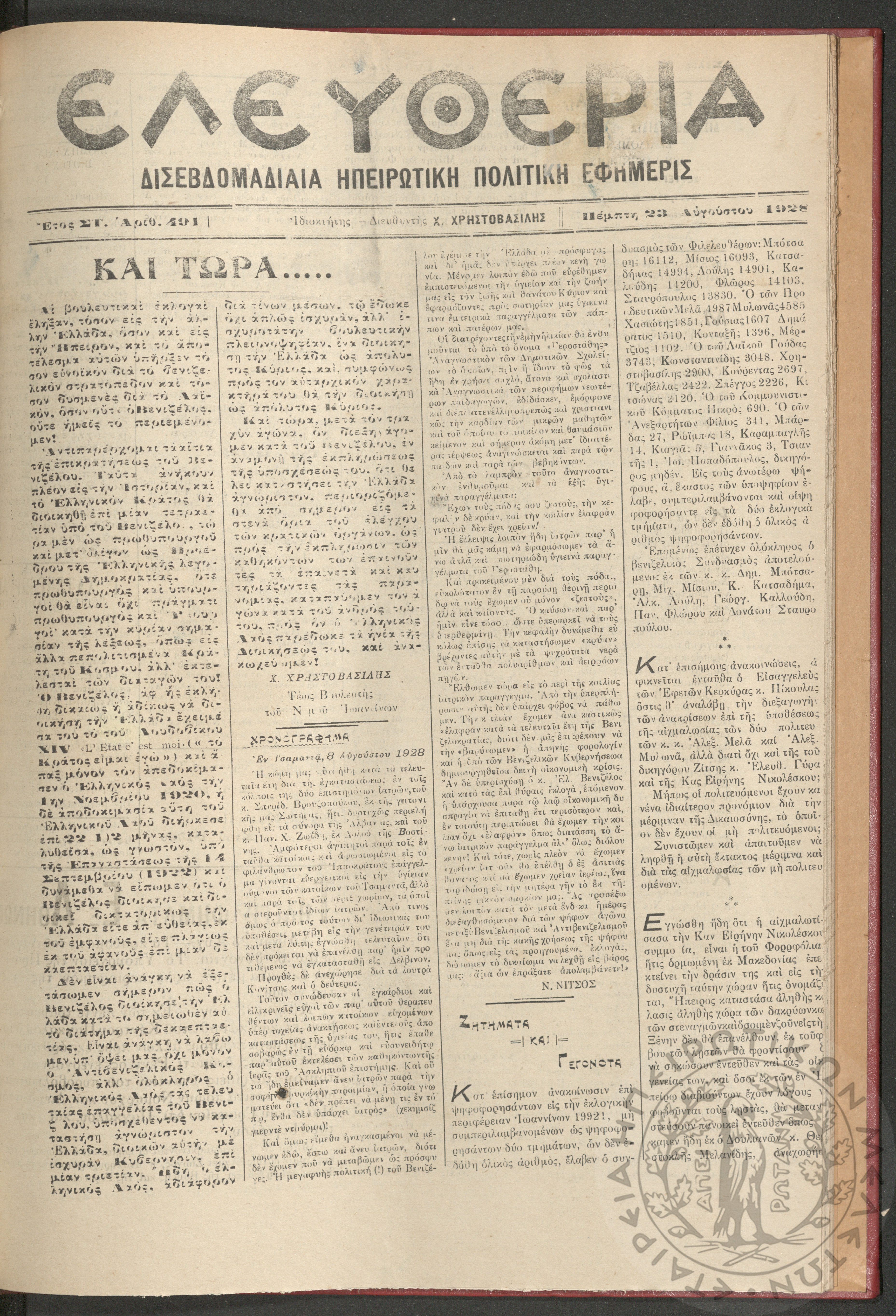 Ελευθερία: δισεβδομαδιαία Ηπειρωτική πολιτική εφημερίς, 1928, φ. 491