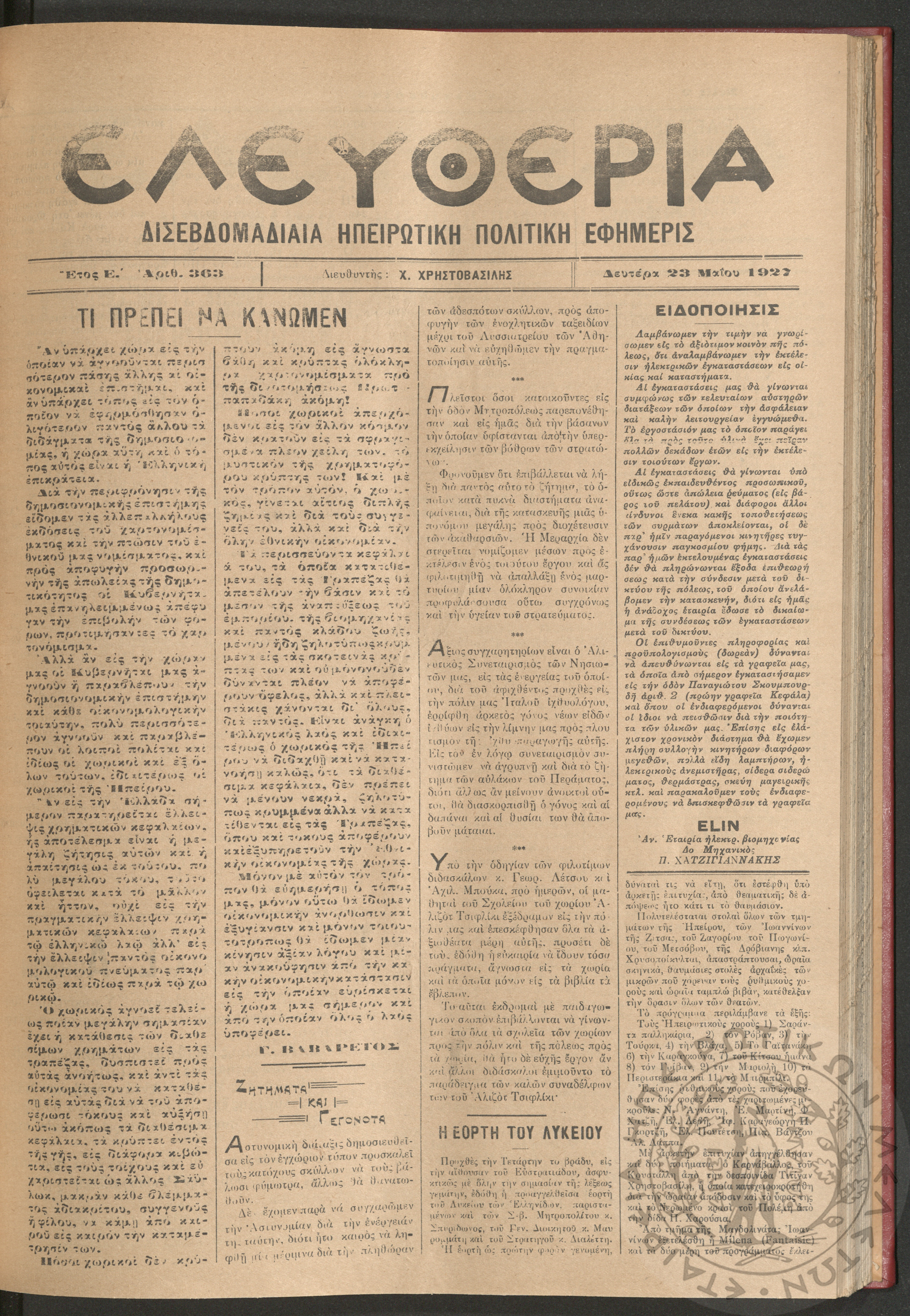 Ελευθερία: δισεβδομαδιαία Ηπειρωτική πολιτική εφημερίς, 1927, φ. 363