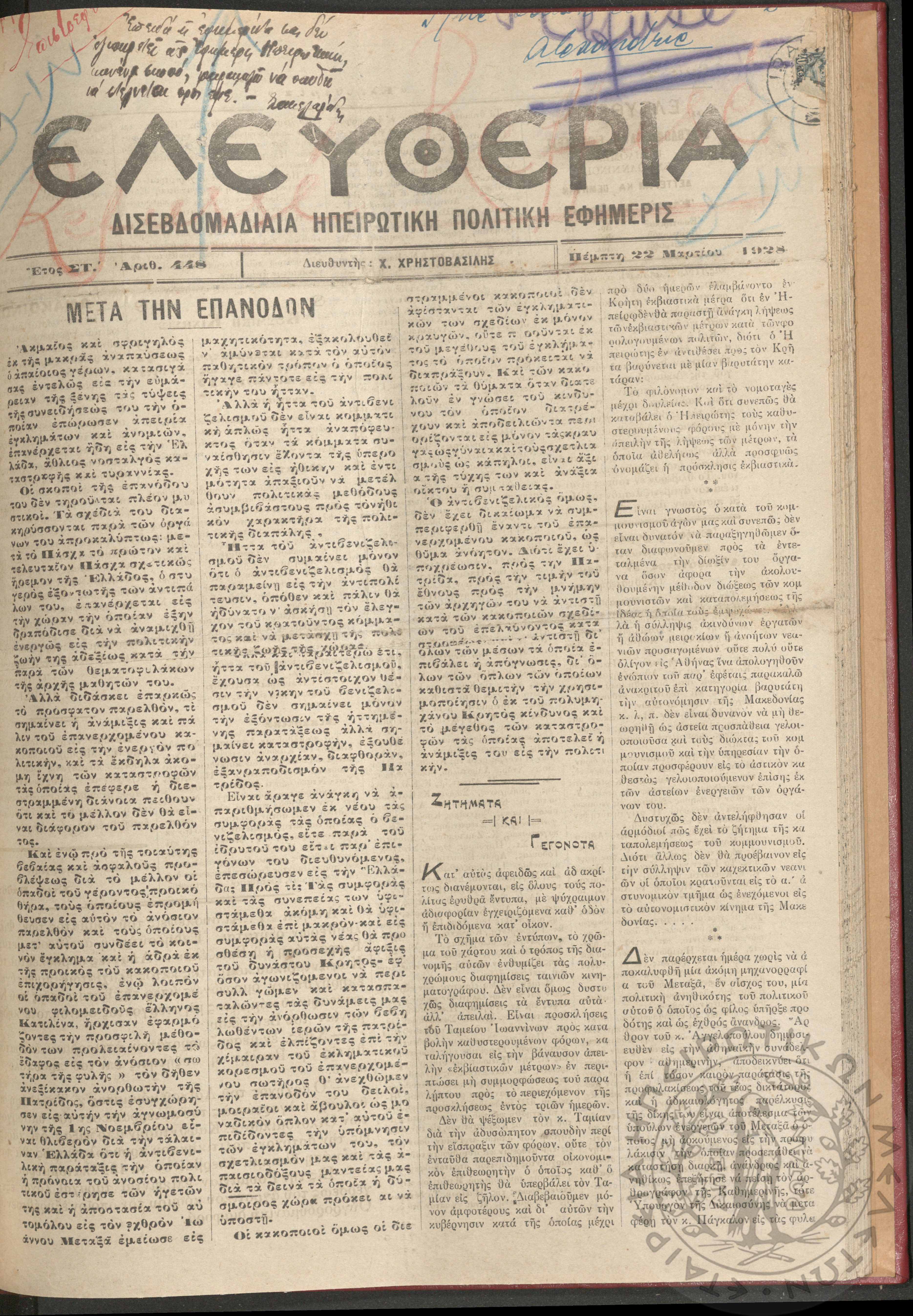 Ελευθερία: δισεβδομαδιαία Ηπειρωτική πολιτική εφημερίς, 1928, φ. 448
