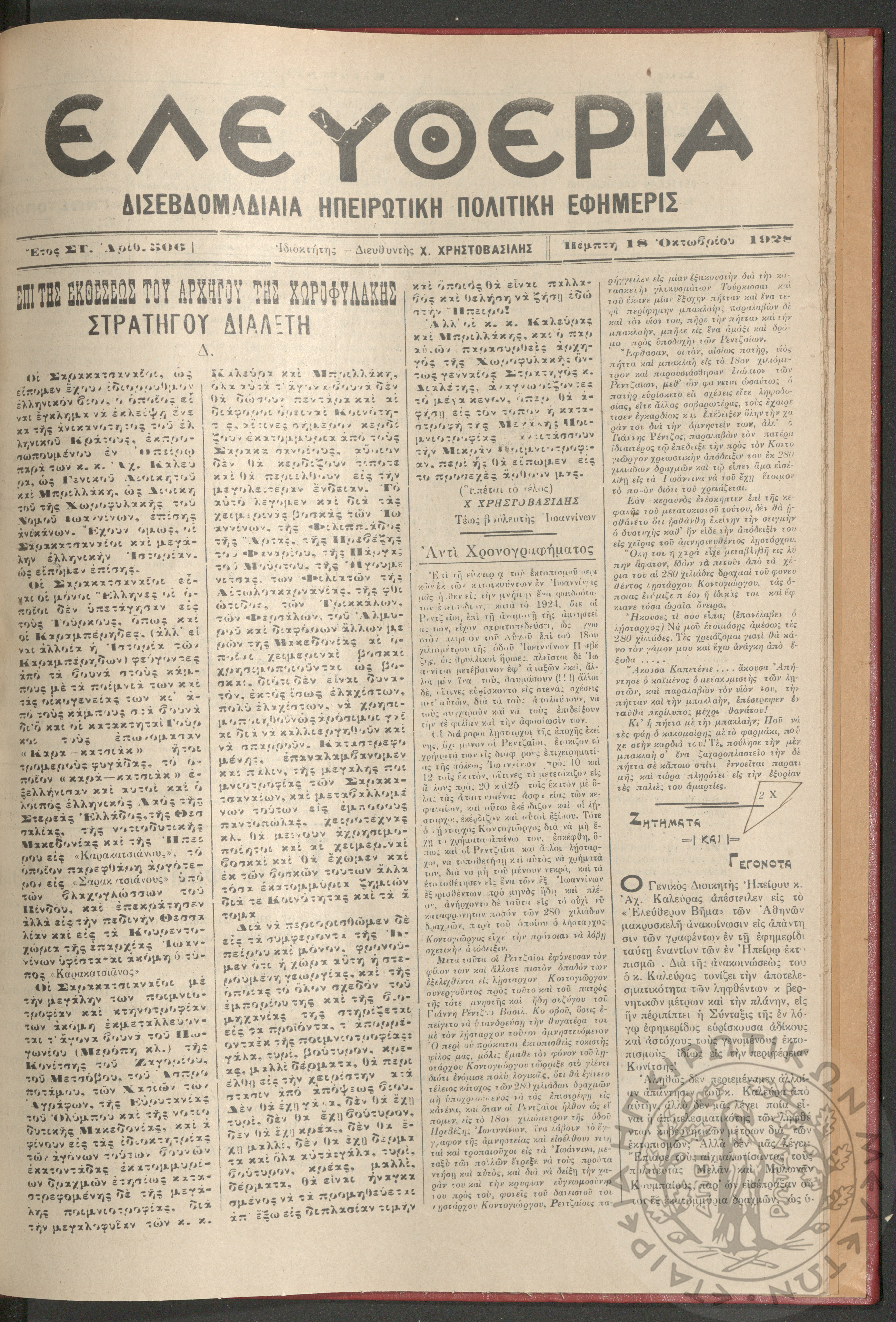 Ελευθερία: δισεβδομαδιαία Ηπειρωτική πολιτική εφημερίς, 1928, φ. 506