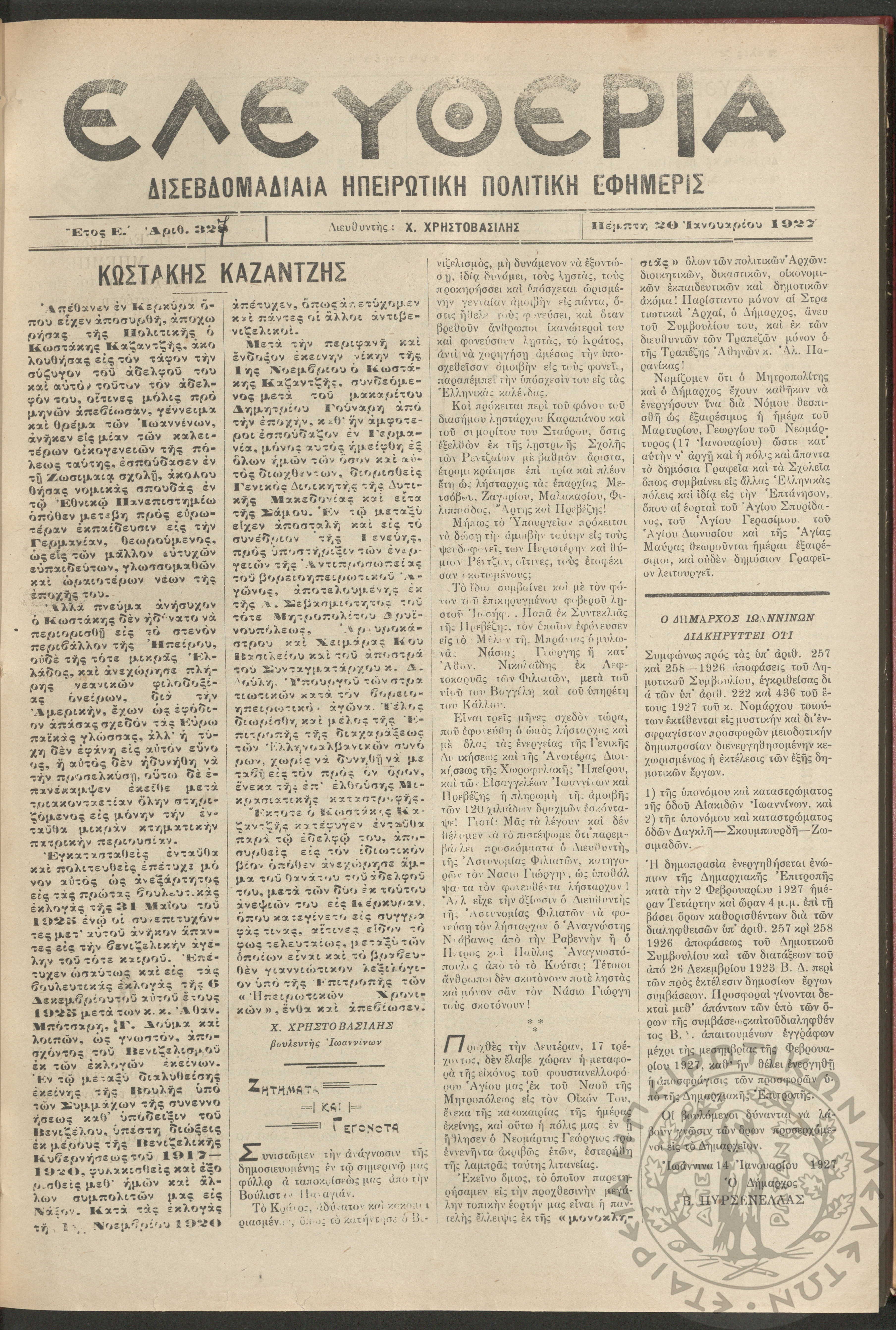 Ελευθερία: δισεβδομαδιαία Ηπειρωτική πολιτική εφημερίς, 1927, φ. 327