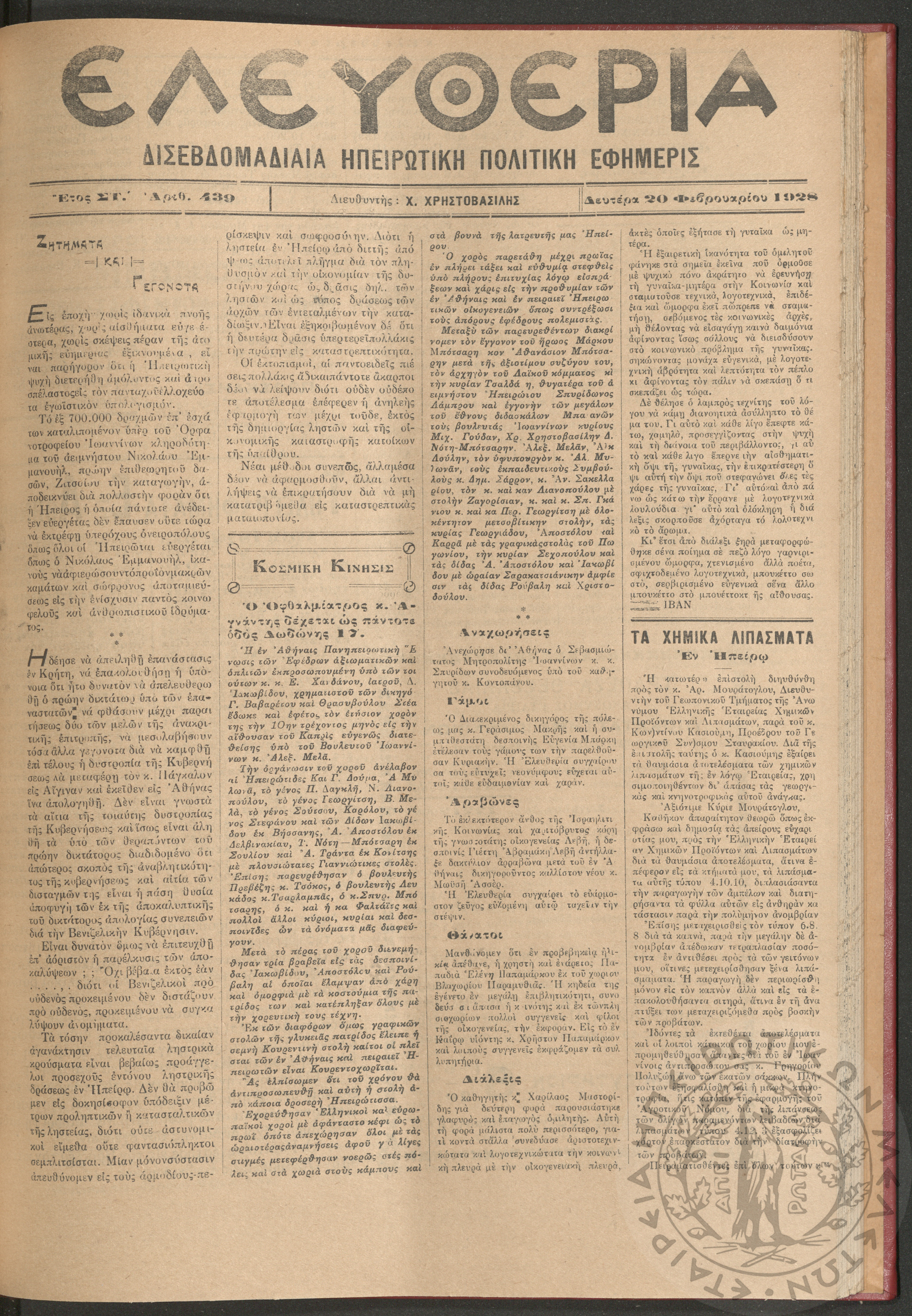 Ελευθερία: δισεβδομαδιαία Ηπειρωτική πολιτική εφημερίς, 1928, φ. 439