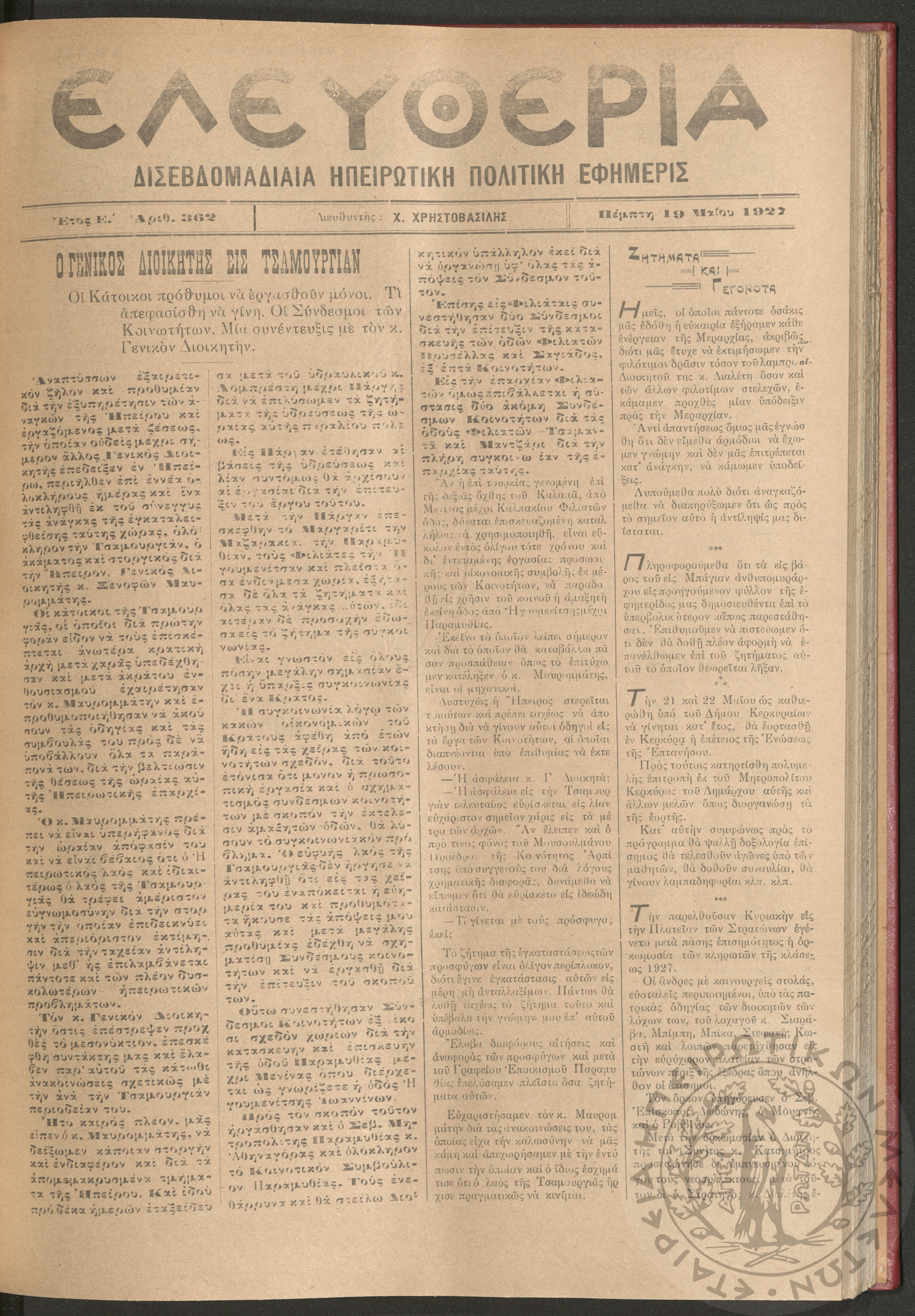 Ελευθερία: δισεβδομαδιαία Ηπειρωτική πολιτική εφημερίς, 1927, φ. 362