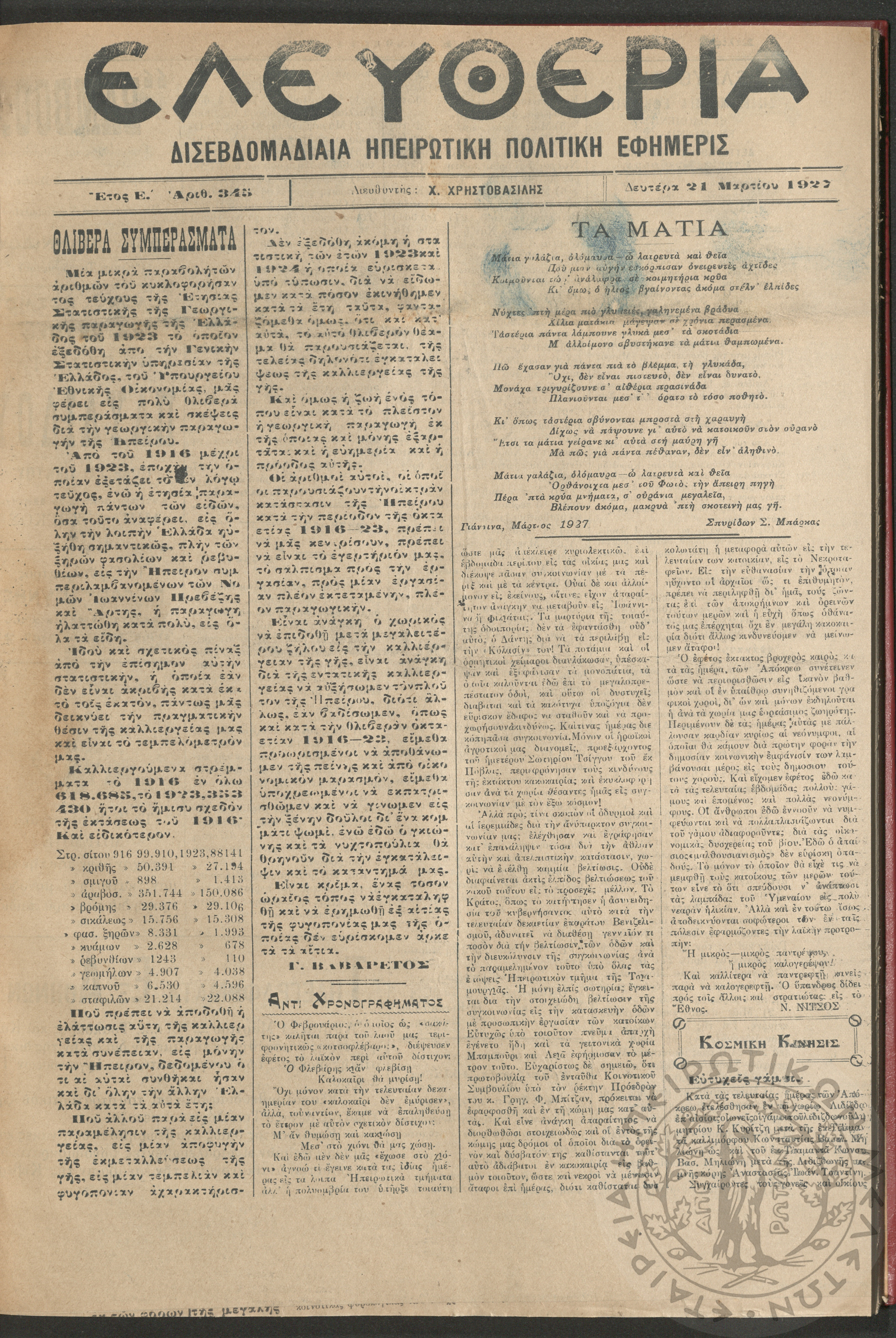 Ελευθερία: δισεβδομαδιαία Ηπειρωτική πολιτική εφημερίς, 1927, φ. 345