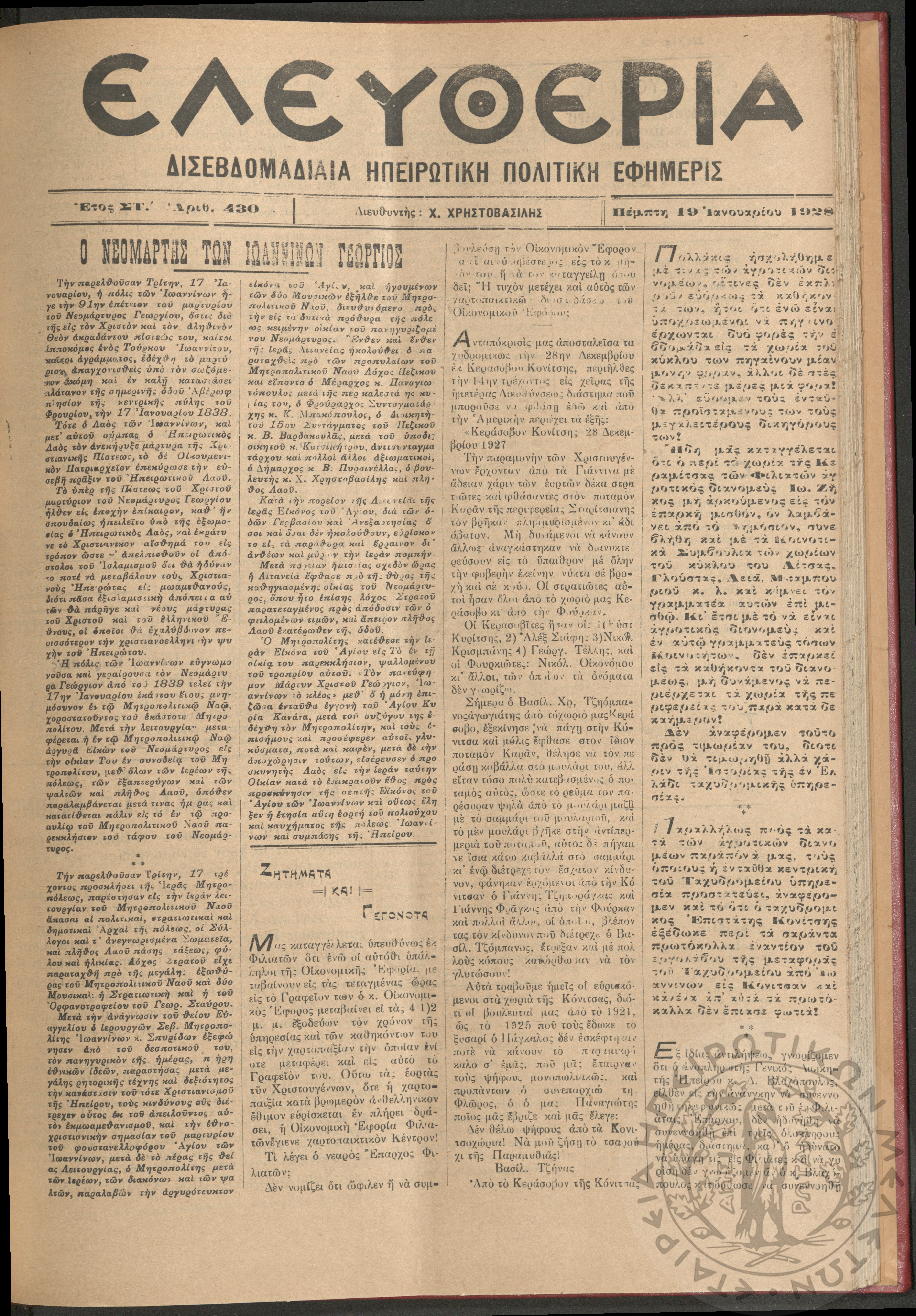Ελευθερία: δισεβδομαδιαία Ηπειρωτική πολιτική εφημερίς, 1928, φ. 430