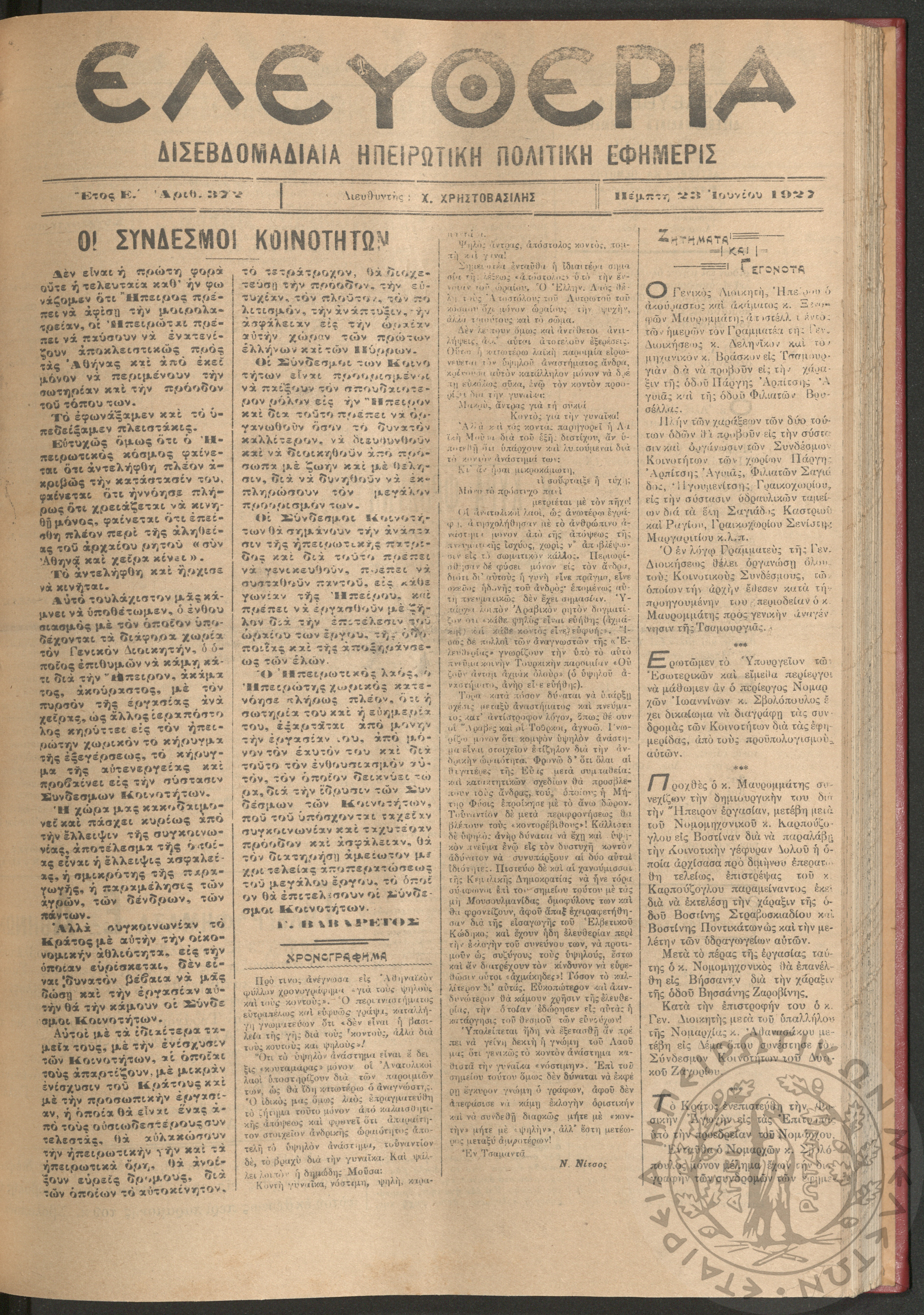 Ελευθερία: δισεβδομαδιαία Ηπειρωτική πολιτική εφημερίς, 1927, φ. 379
