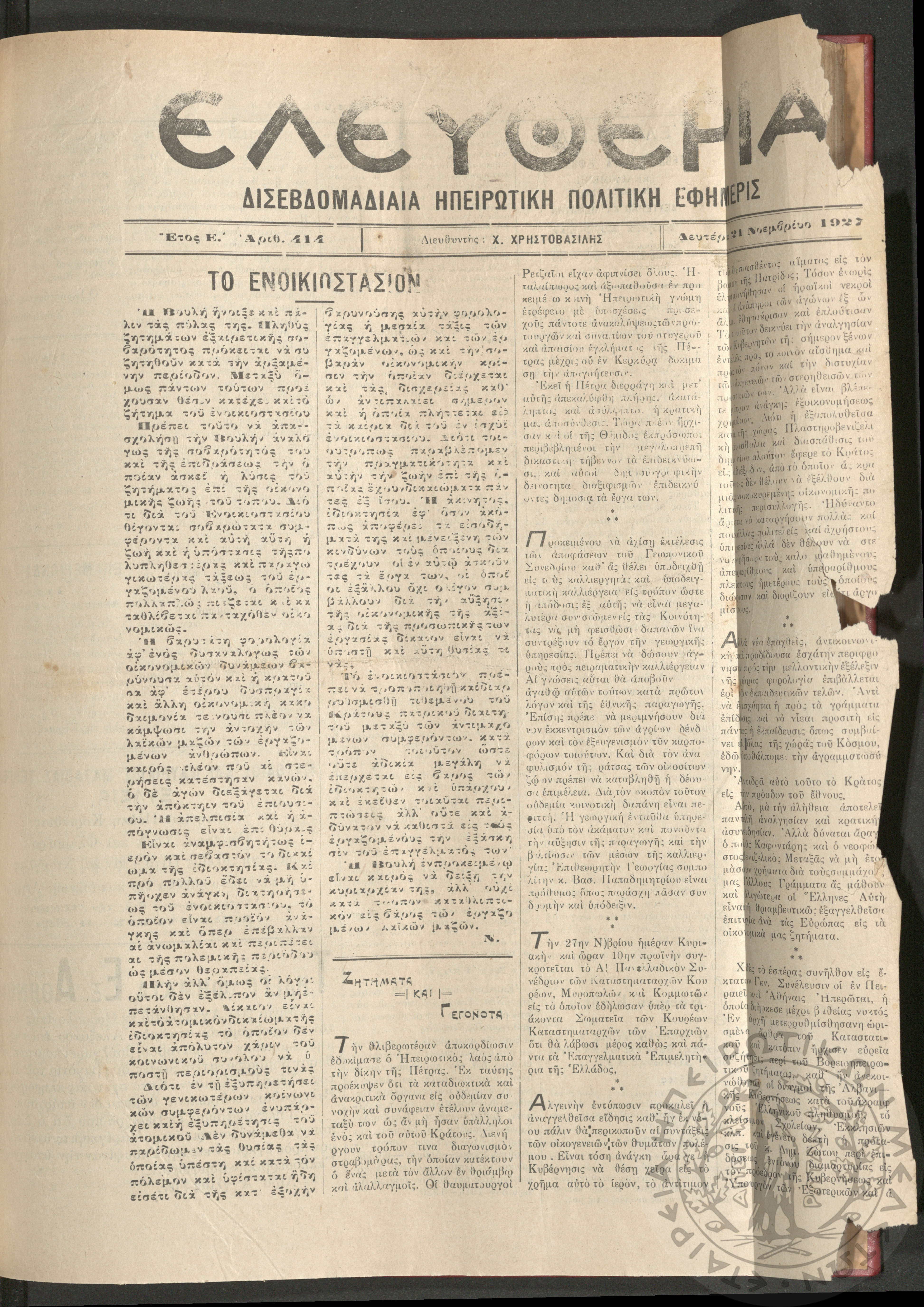 Ελευθερία: δισεβδομαδιαία Ηπειρωτική πολιτική εφημερίς, 1927, φ. 414