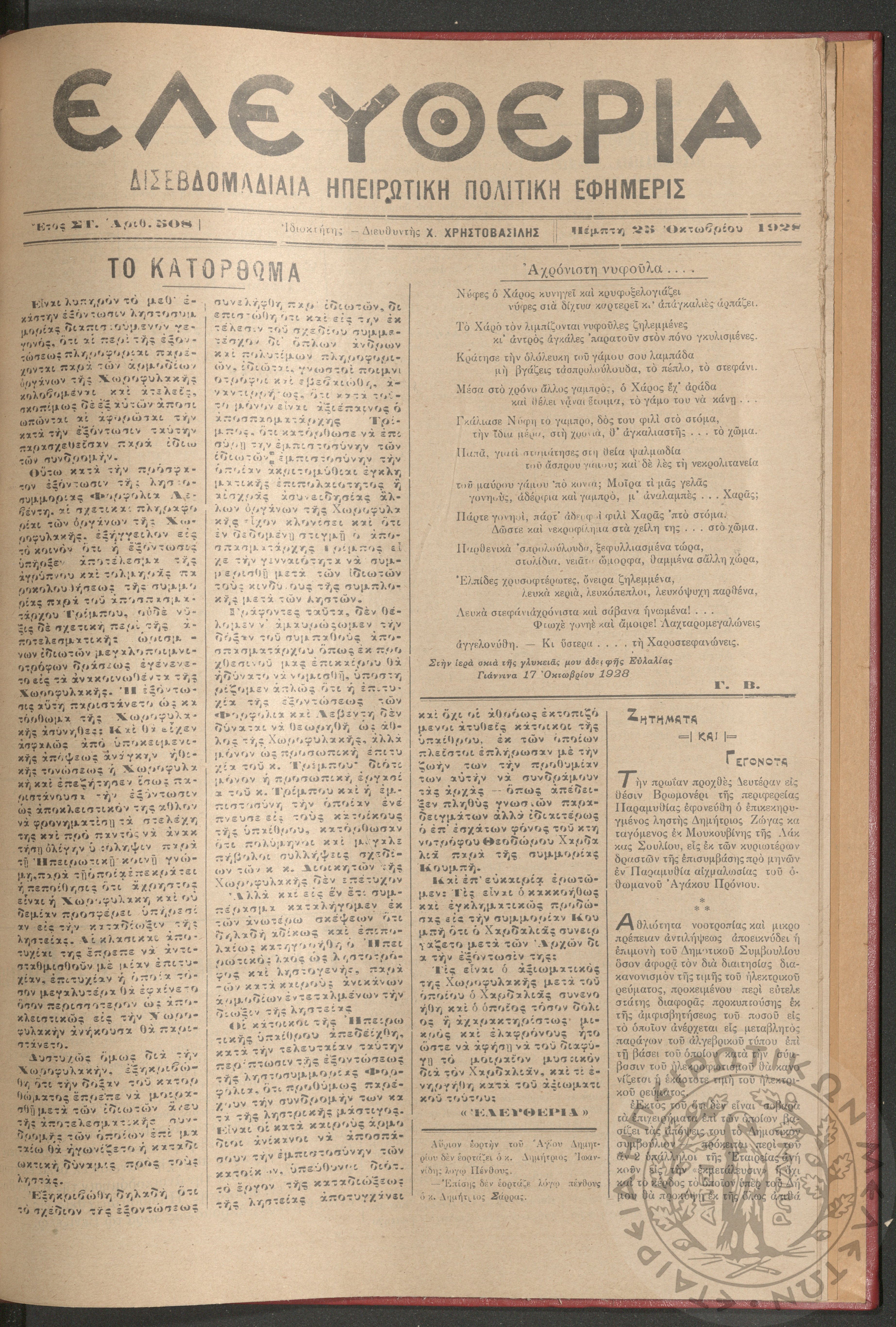 Ελευθερία: δισεβδομαδιαία Ηπειρωτική πολιτική εφημερίς, 1928, φ. 508