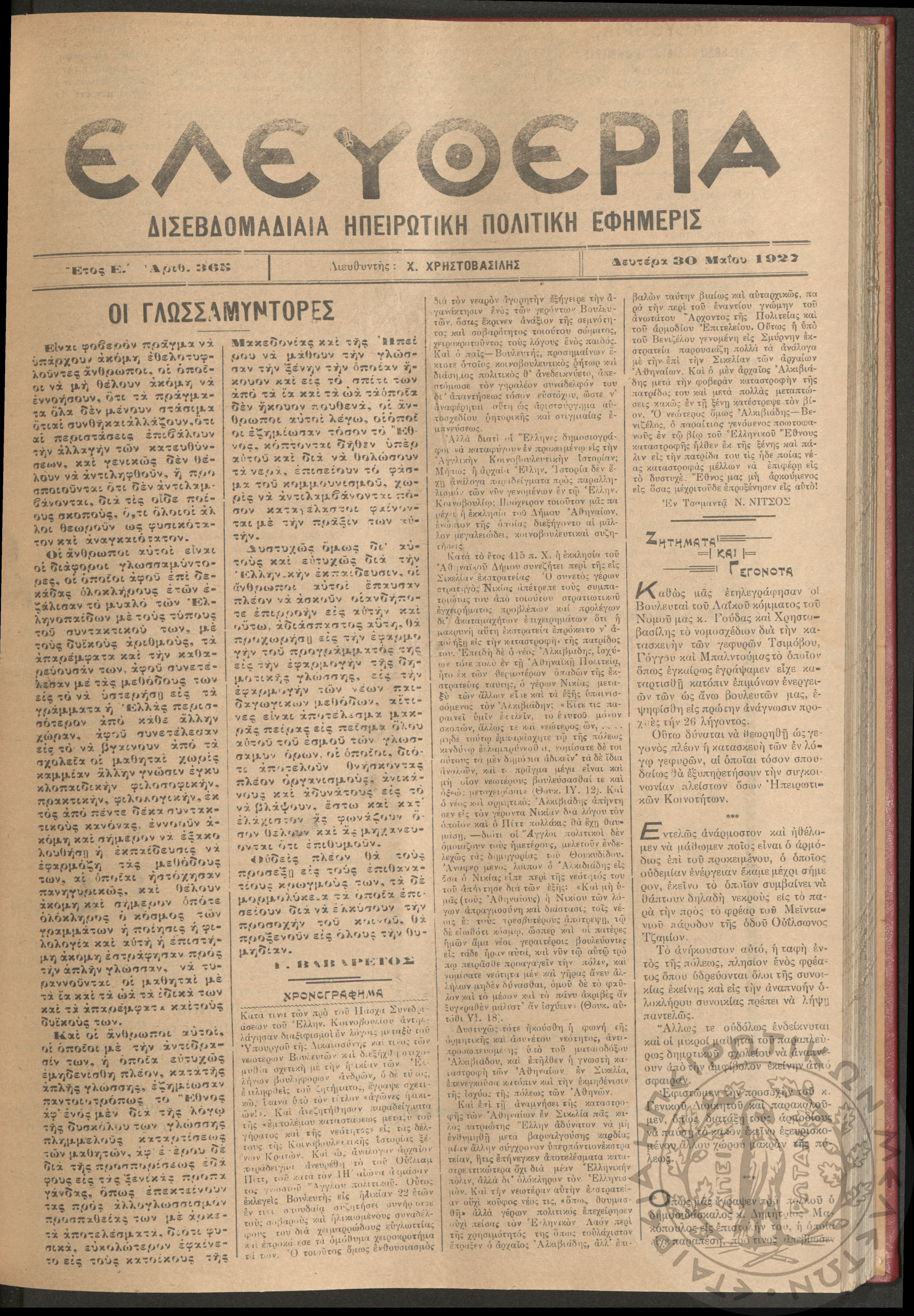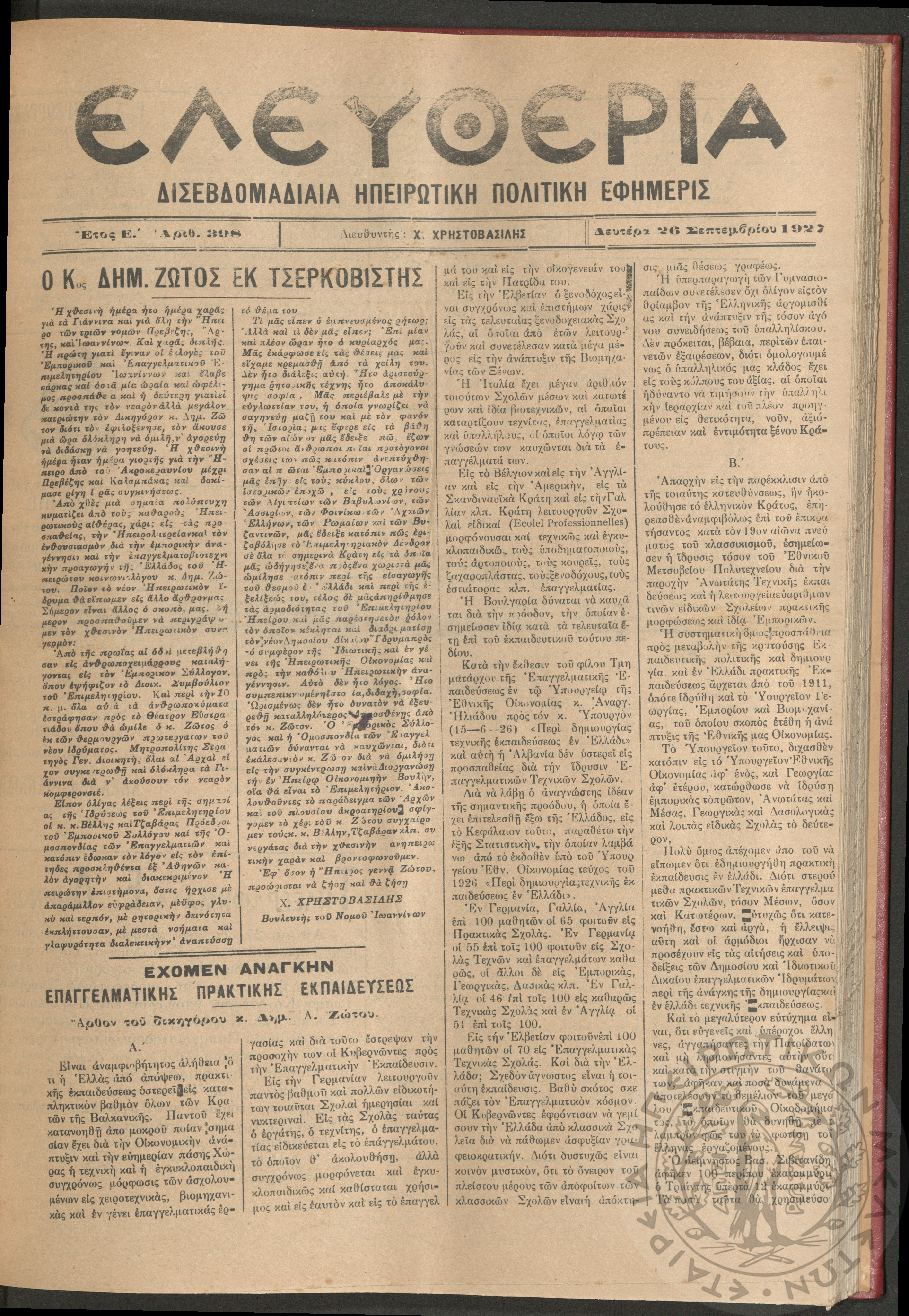 Ελευθερία: δισεβδομαδιαία Ηπειρωτική πολιτική εφημερίς, 1927, φ. 406