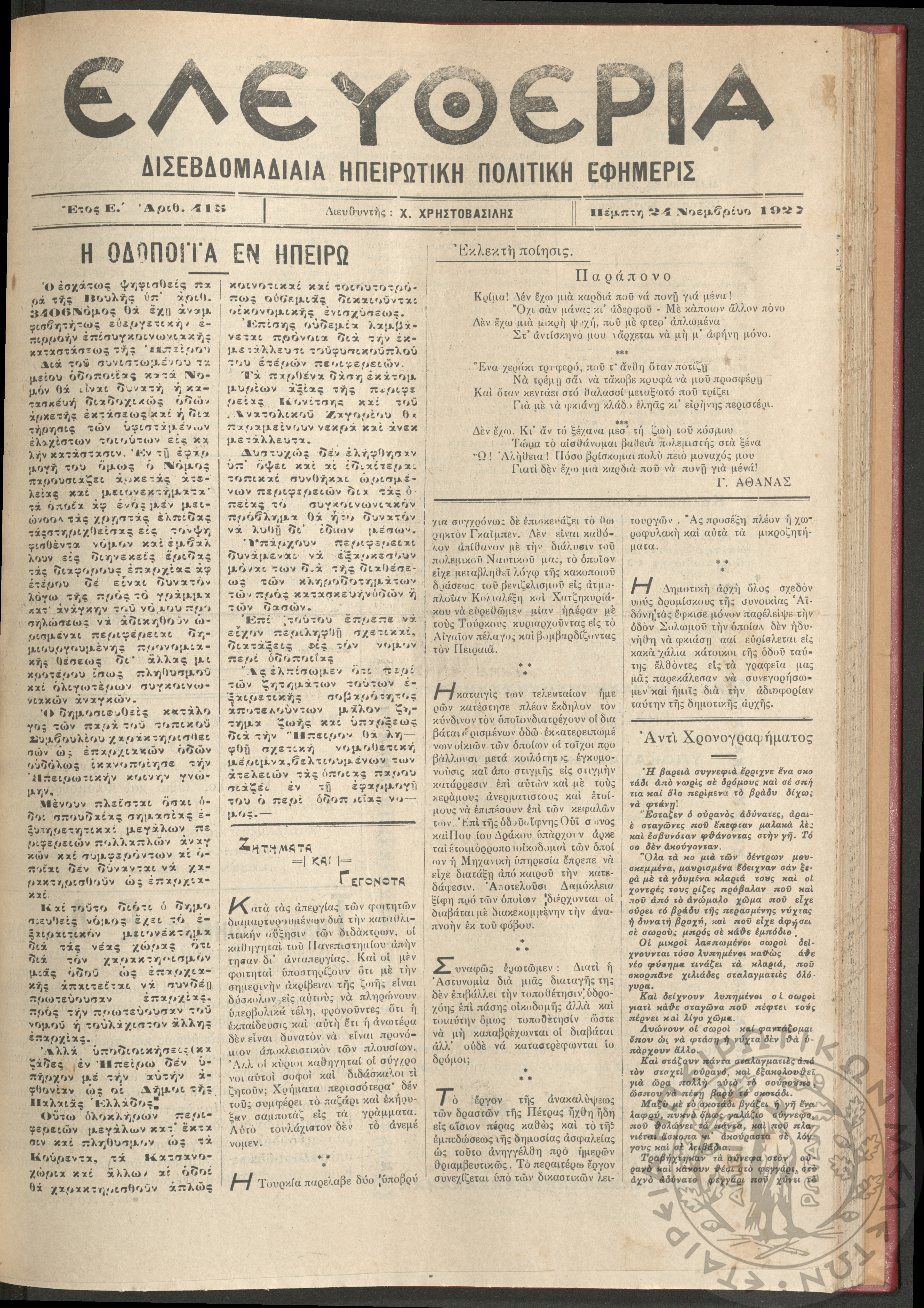 Ελευθερία: δισεβδομαδιαία Ηπειρωτική πολιτική εφημερίς, 1927, φ. 415