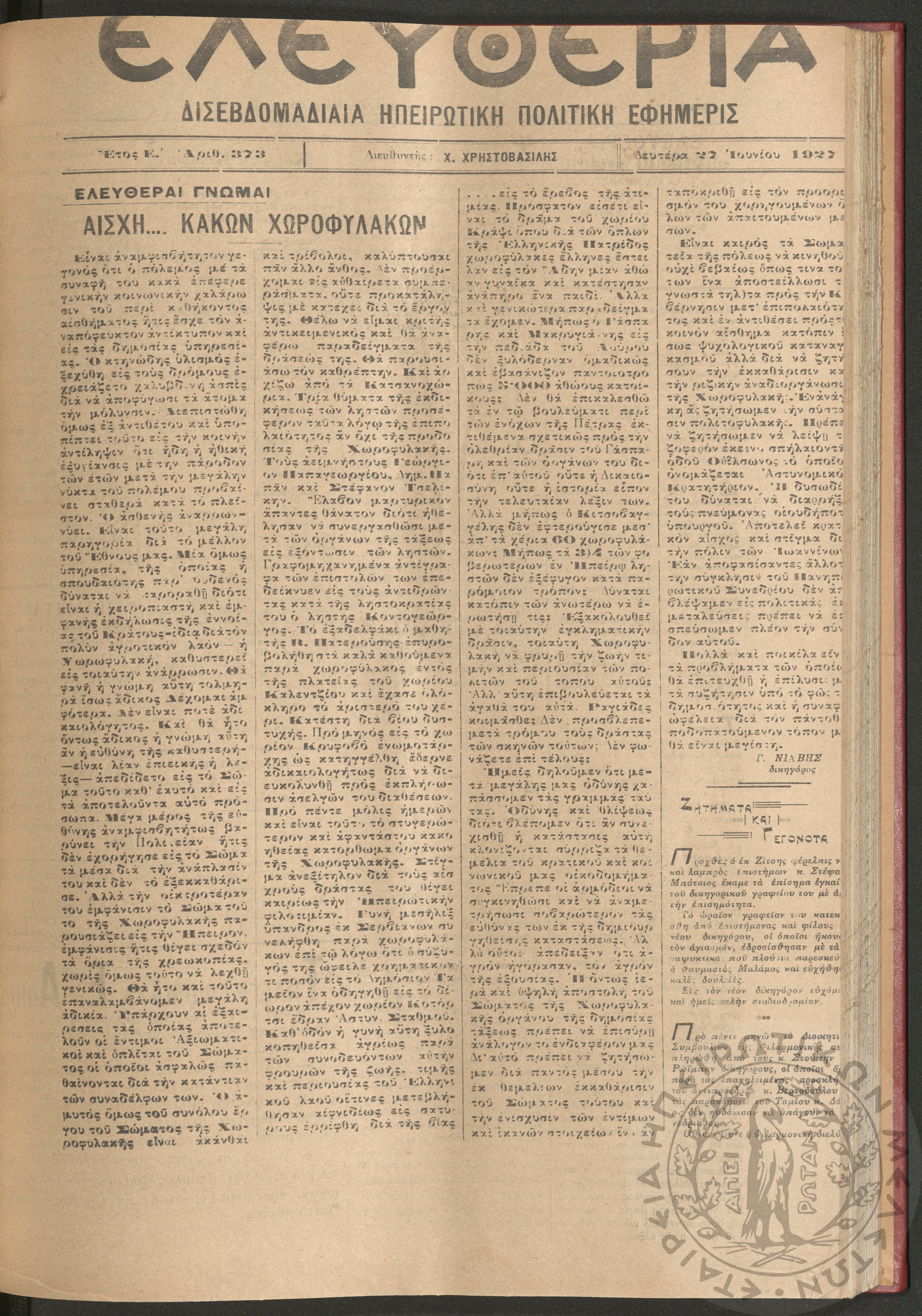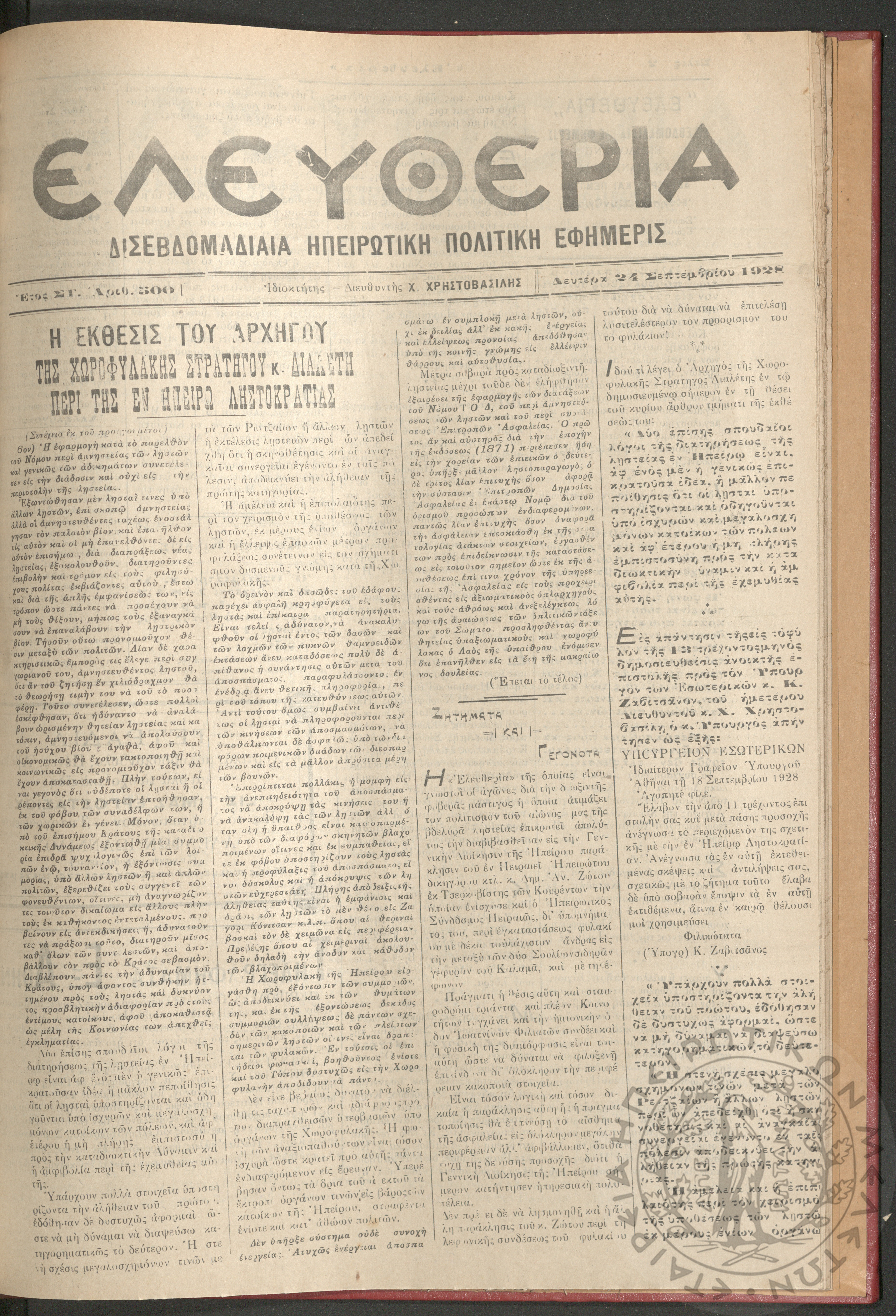 Ελευθερία: δισεβδομαδιαία Ηπειρωτική πολιτική εφημερίς, 1928, φ. 500