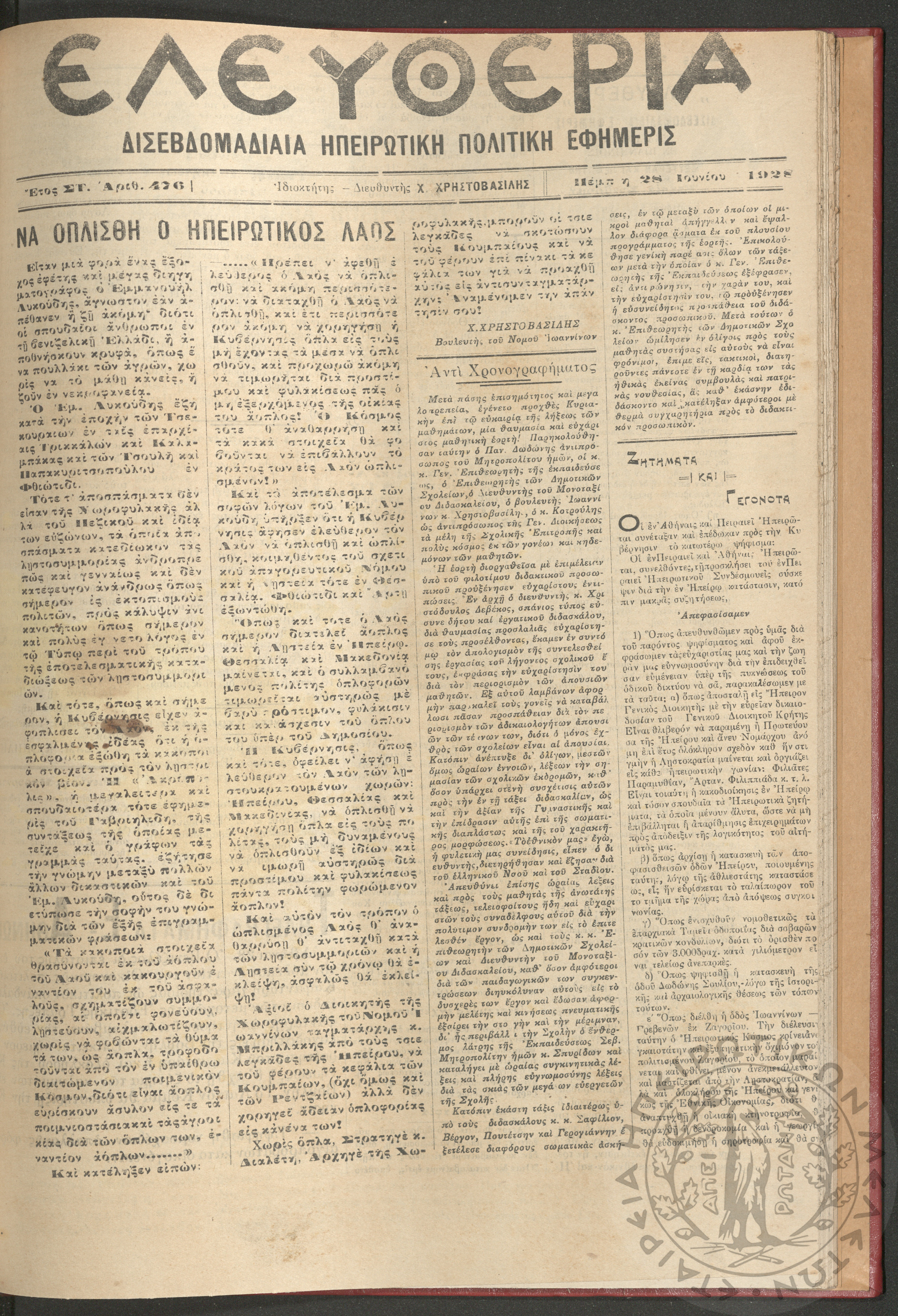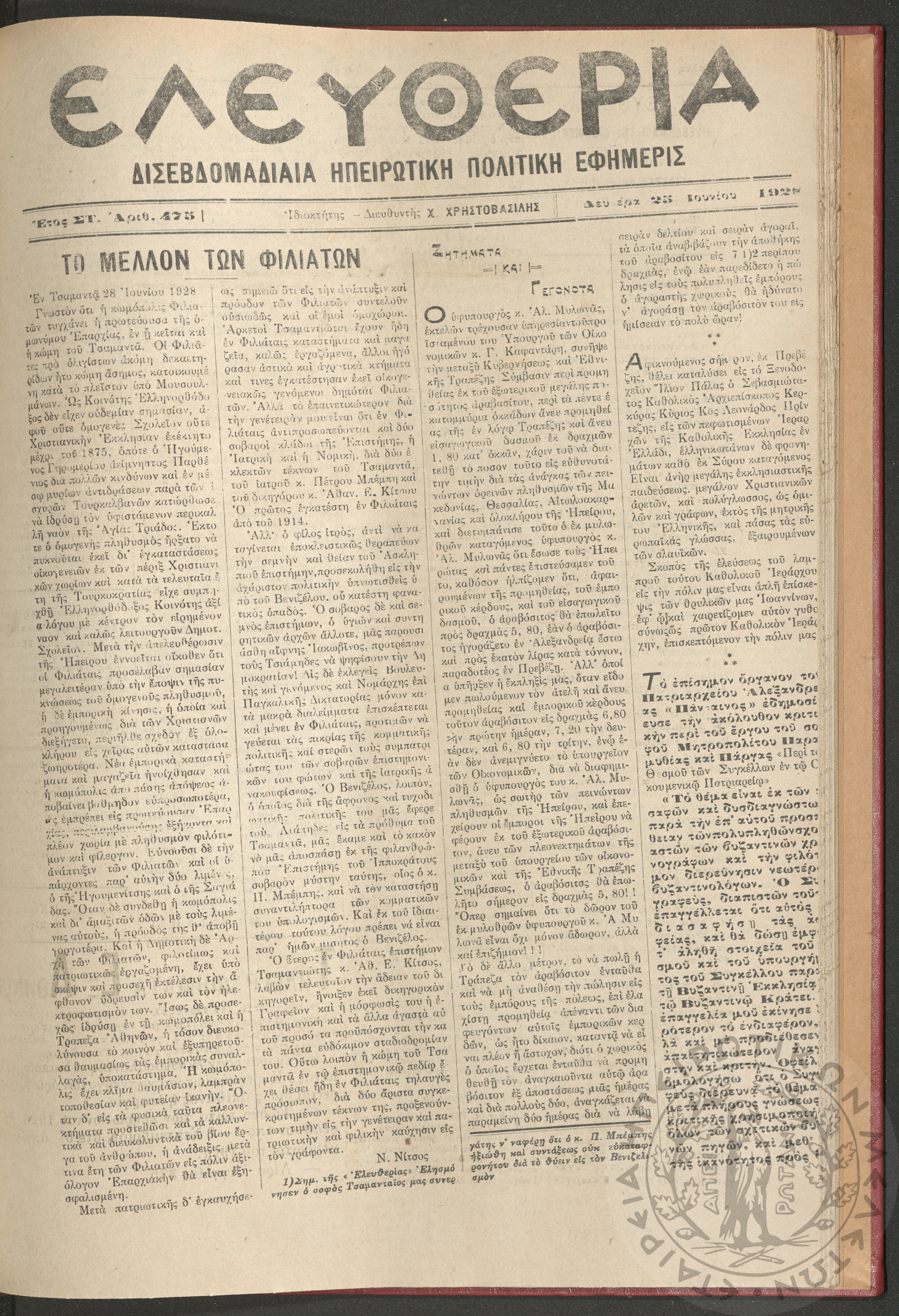 Ελευθερία: δισεβδομαδιαία Ηπειρωτική πολιτική εφημερίς, 1928, φ. 475
