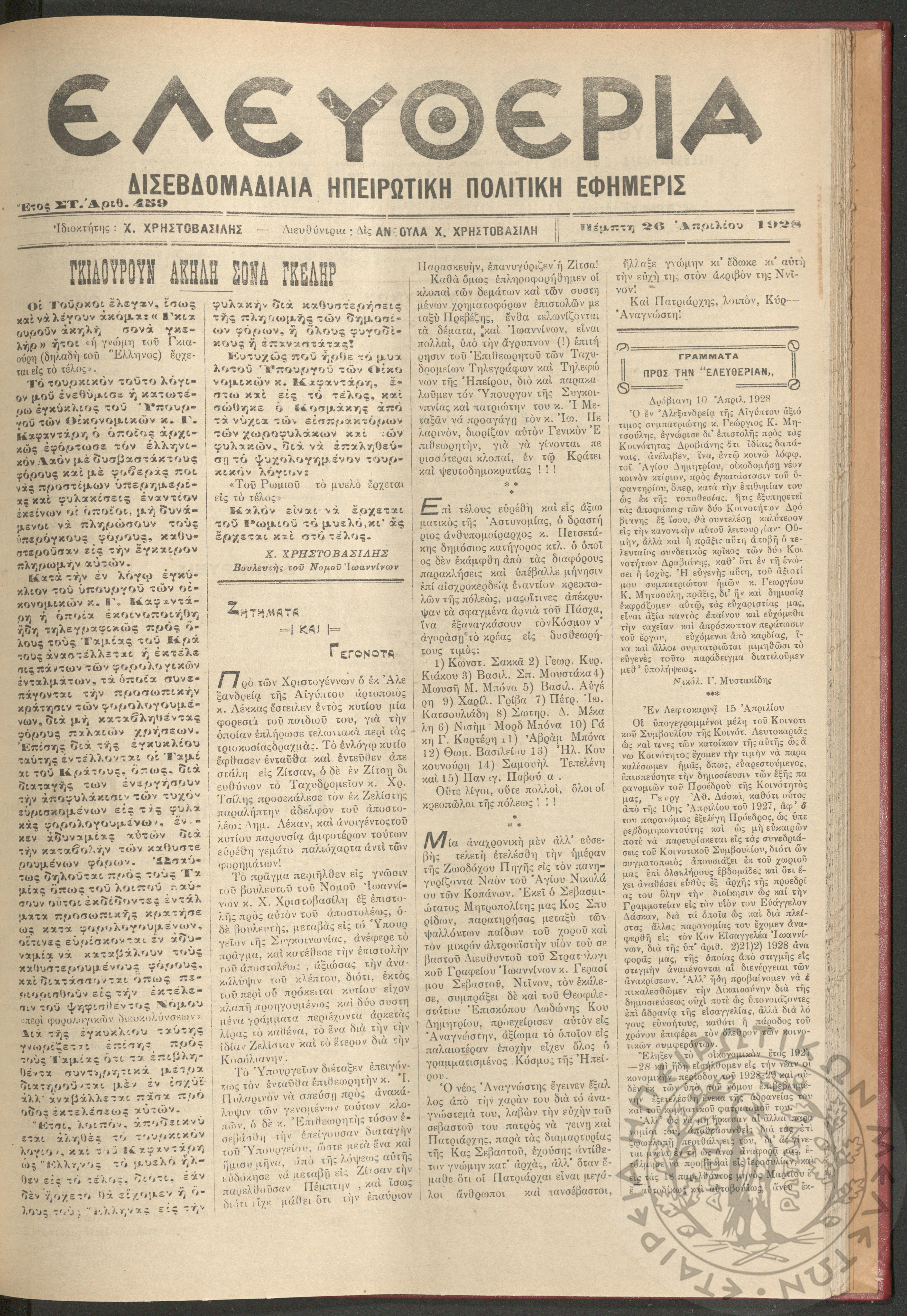 Ελευθερία: δισεβδομαδιαία Ηπειρωτική πολιτική εφημερίς, 1928, φ. 459
