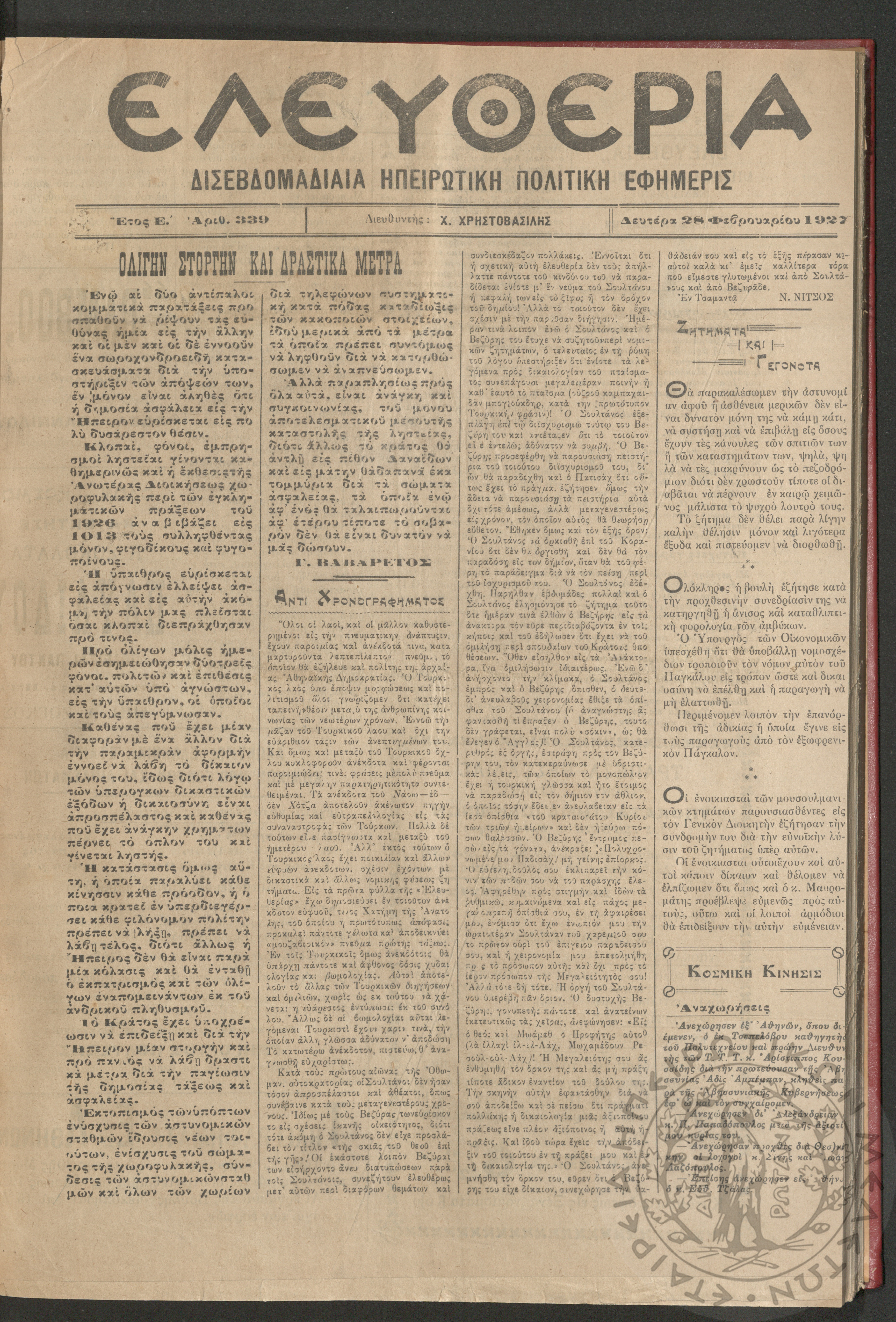 Ελευθερία: δισεβδομαδιαία Ηπειρωτική πολιτική εφημερίς, 1927, φ. 389