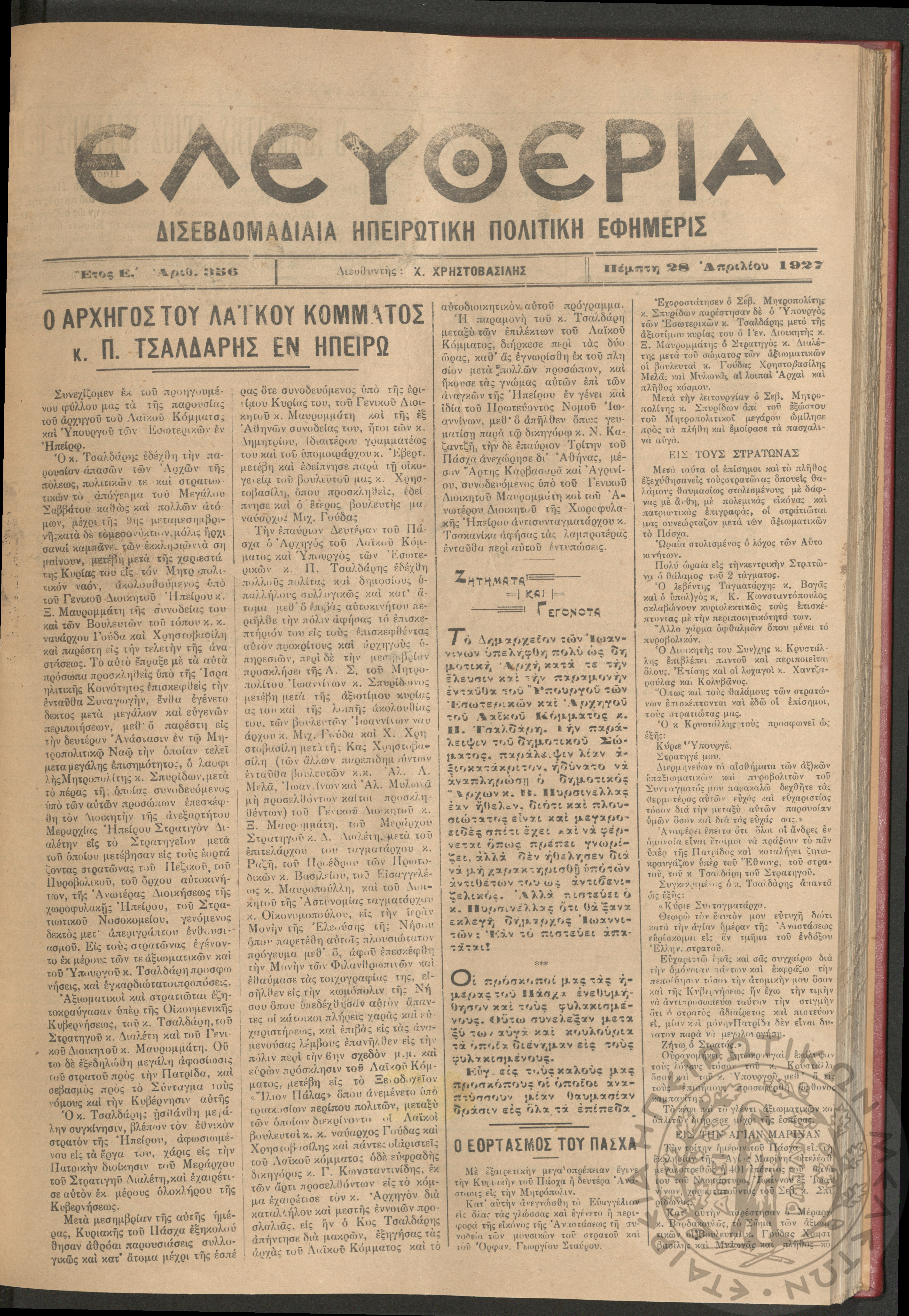 Ελευθερία: δισεβδομαδιαία Ηπειρωτική πολιτική εφημερίς, 1927, φ. 399