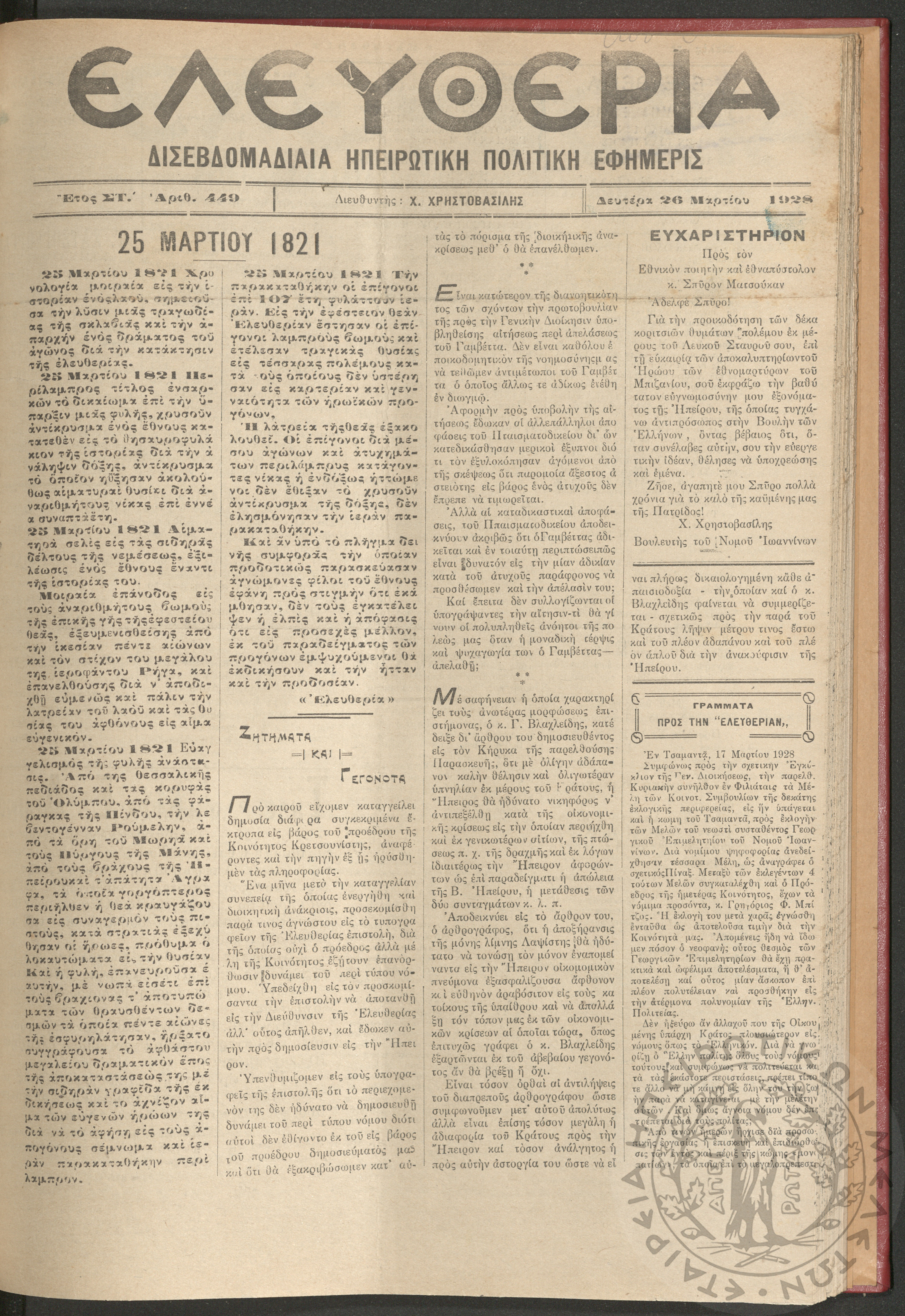 Ελευθερία: δισεβδομαδιαία Ηπειρωτική πολιτική εφημερίς, 1928, φ. 449