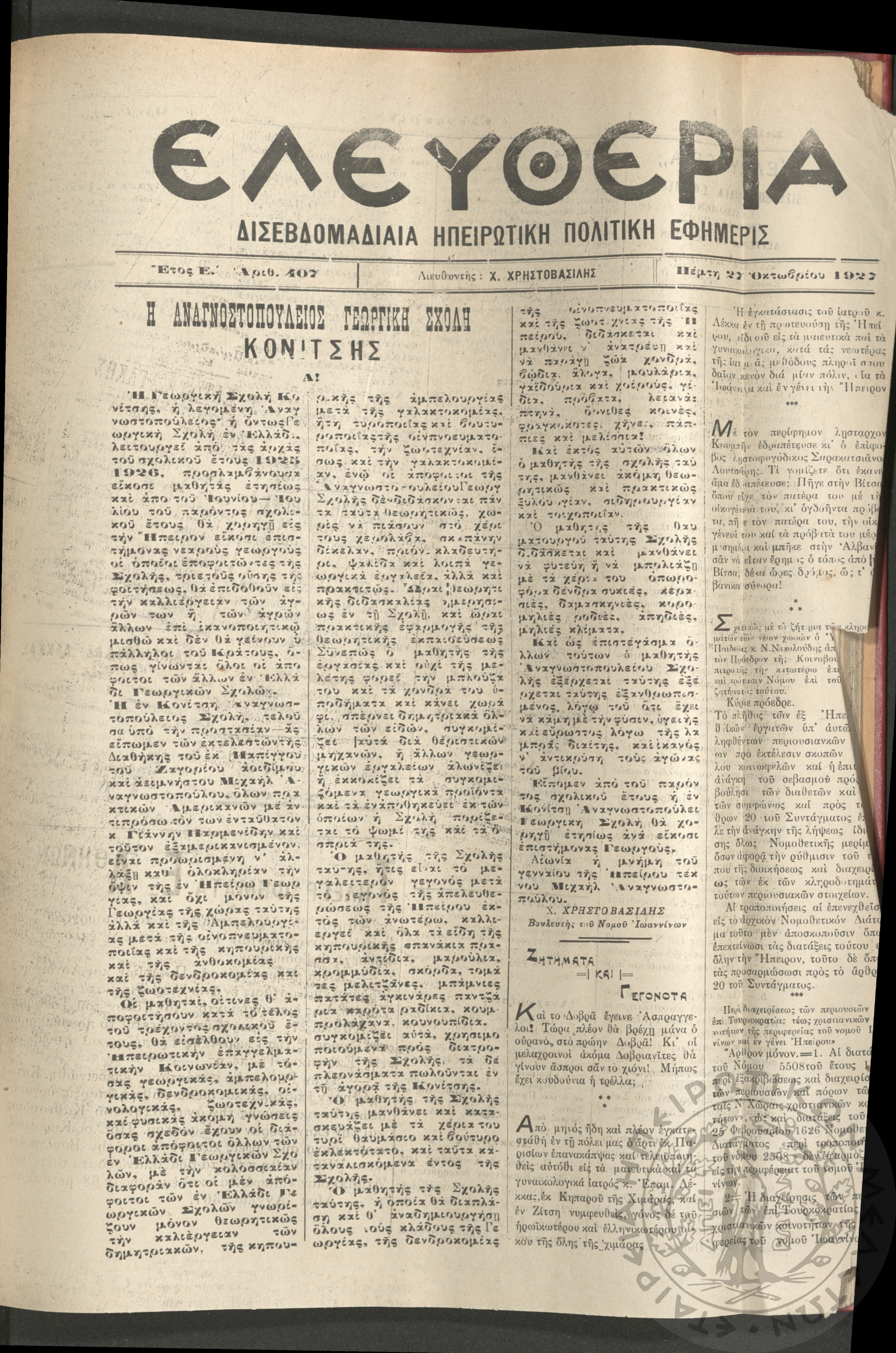 Ελευθερία: δισεβδομαδιαία Ηπειρωτική πολιτική εφημερίς, 1927, φ. 407