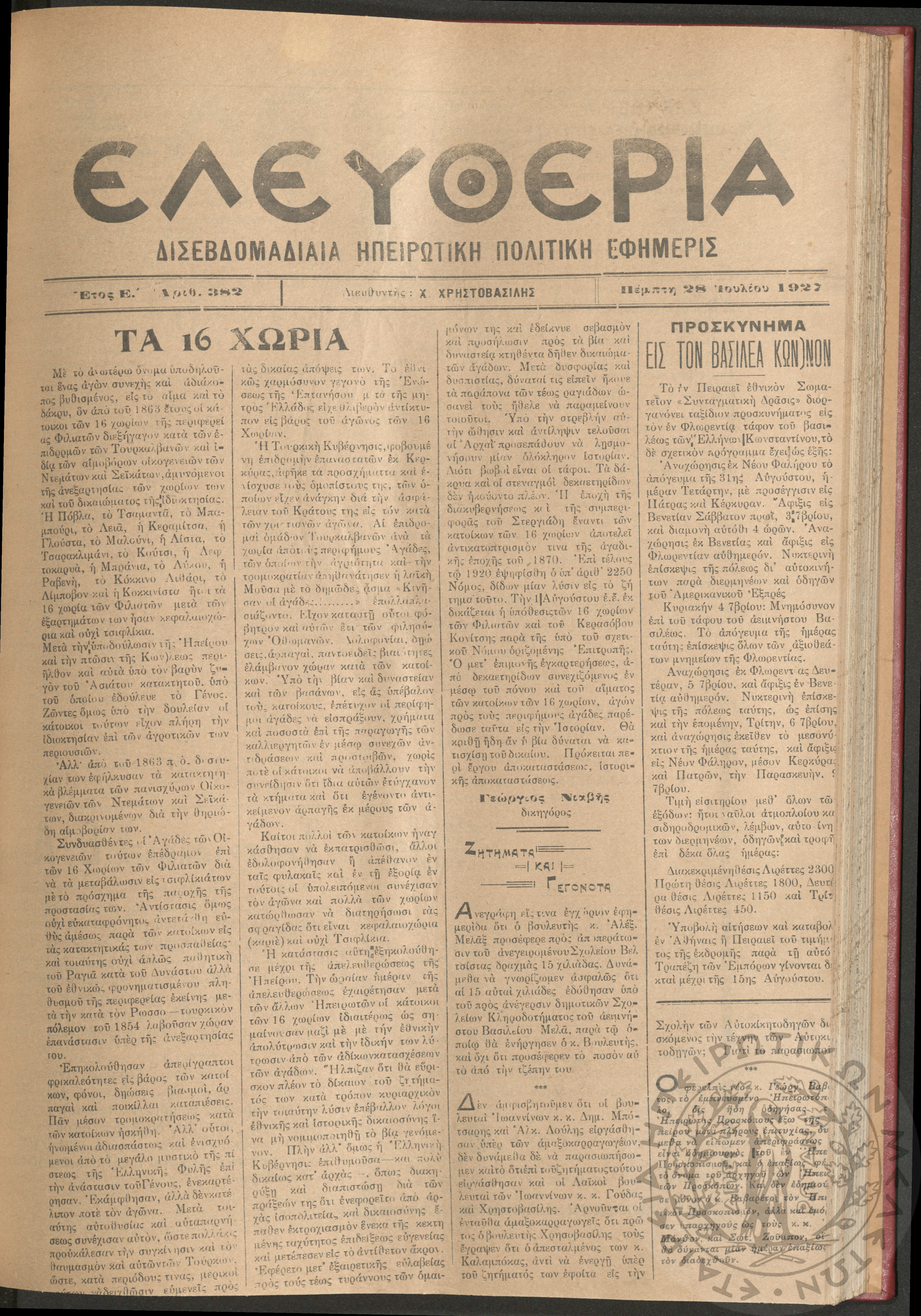 Ελευθερία: δισεβδομαδιαία Ηπειρωτική πολιτική εφημερίς, 1927, φ. 382