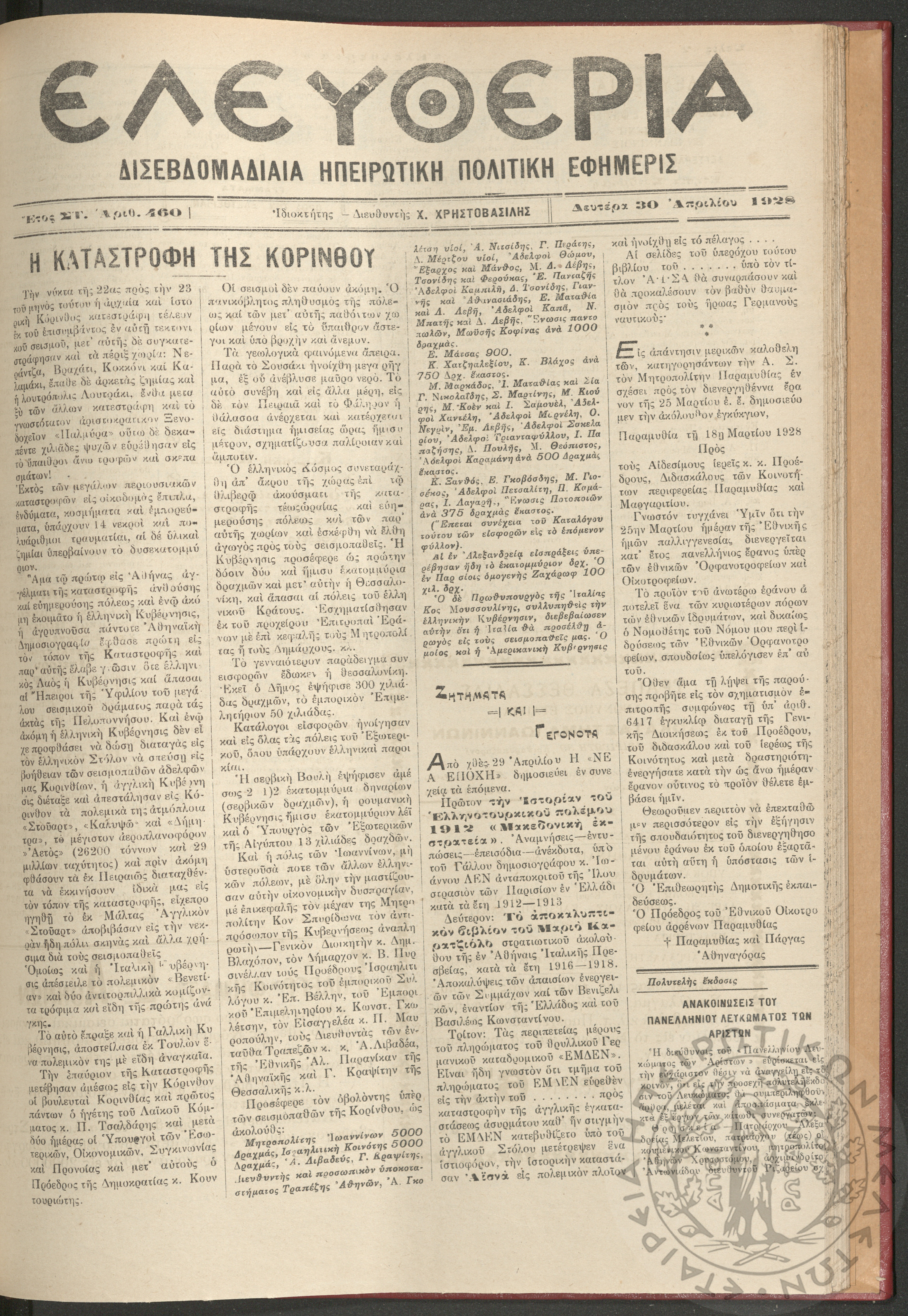 Ελευθερία: δισεβδομαδιαία Ηπειρωτική πολιτική εφημερίς, 1928, φ. 460