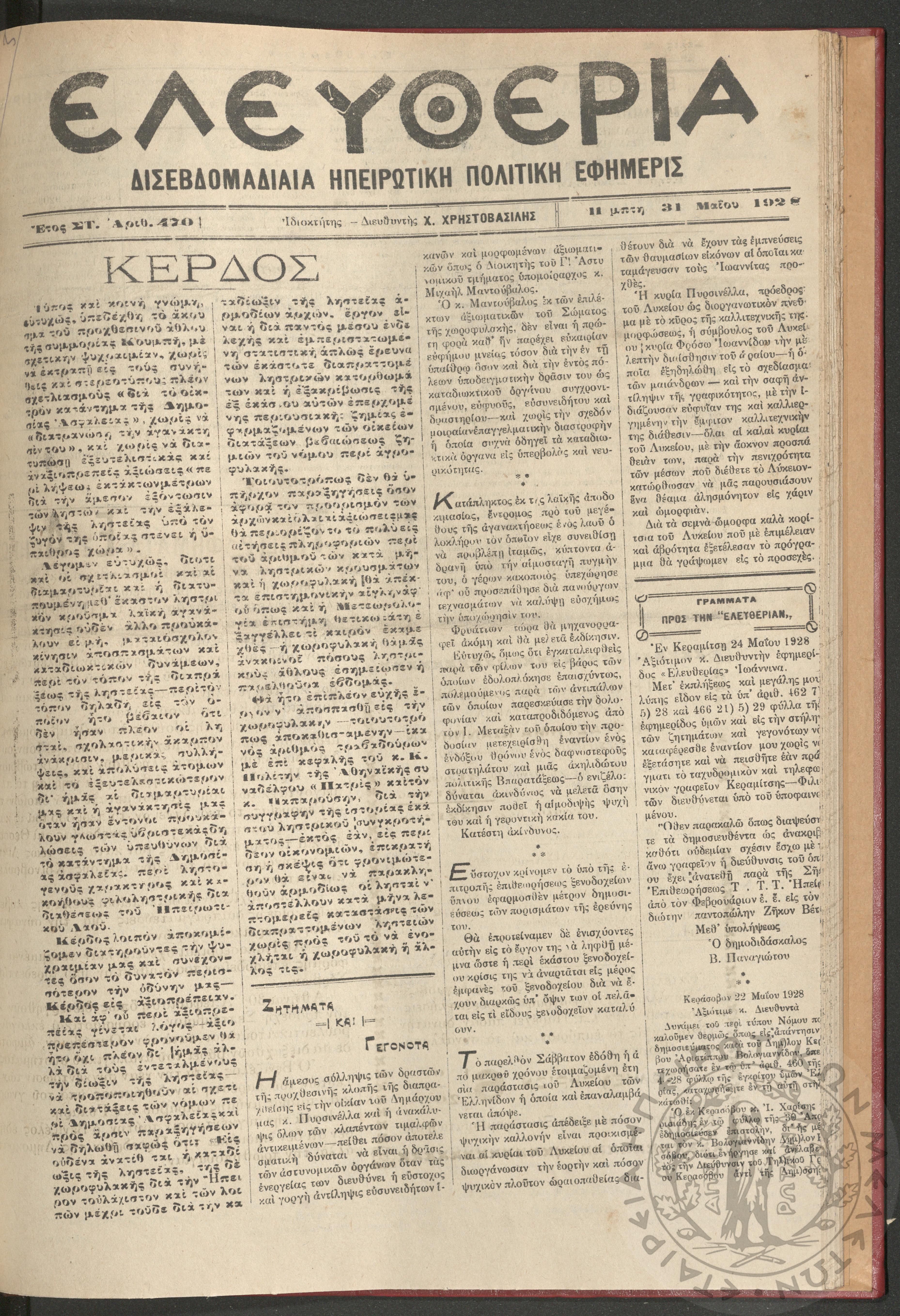 Ελευθερία: δισεβδομαδιαία Ηπειρωτική πολιτική εφημερίς, 1928, φ. 470