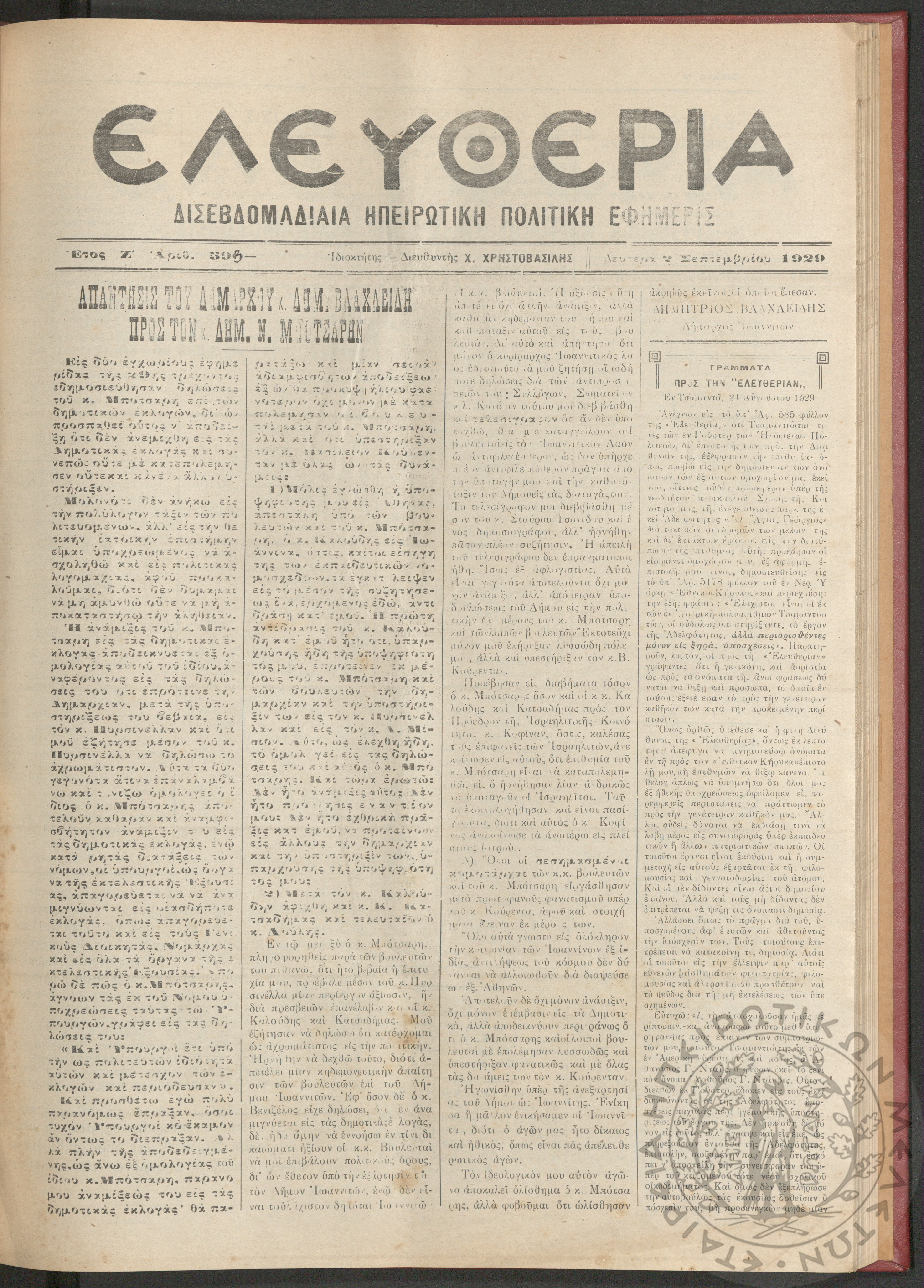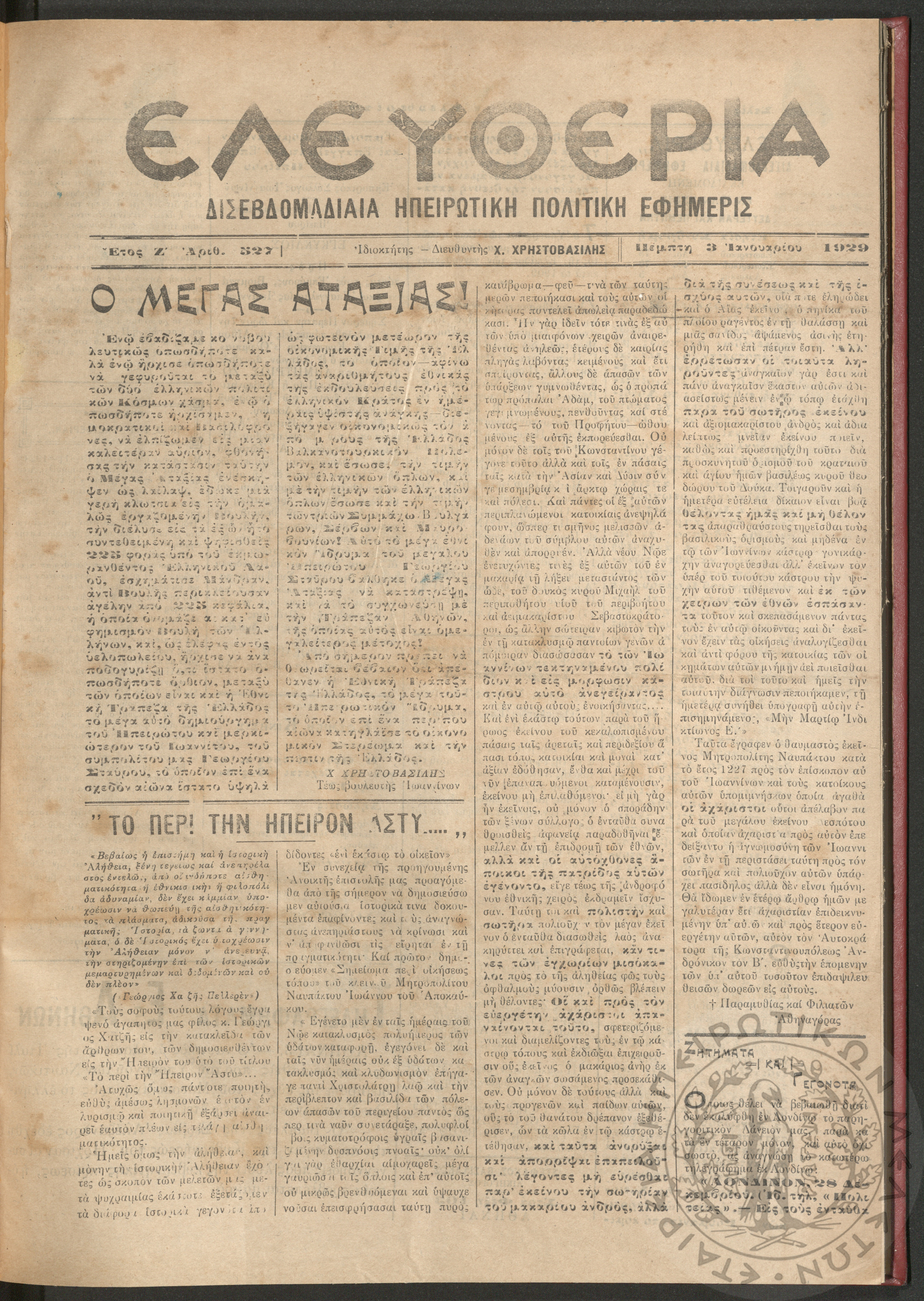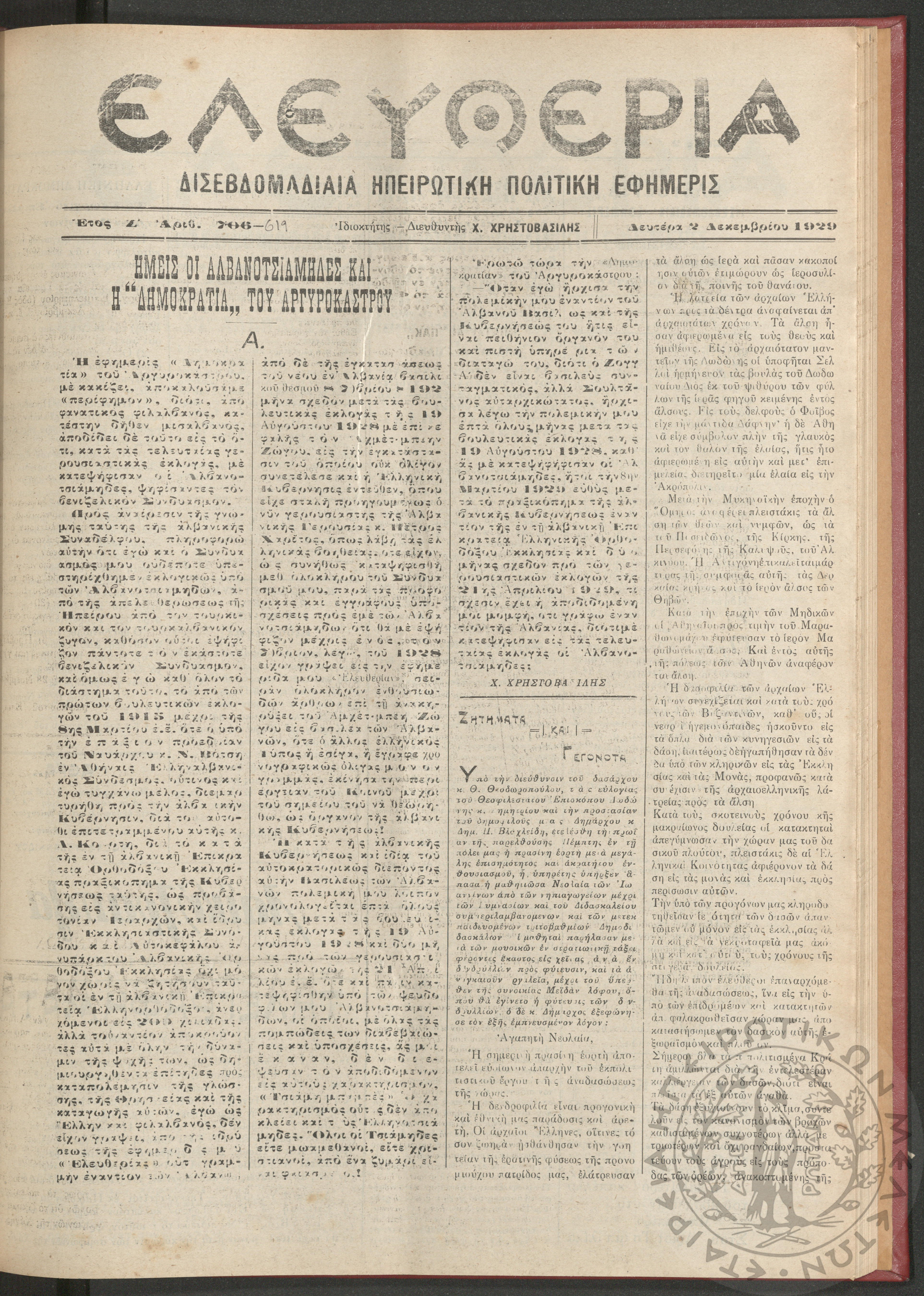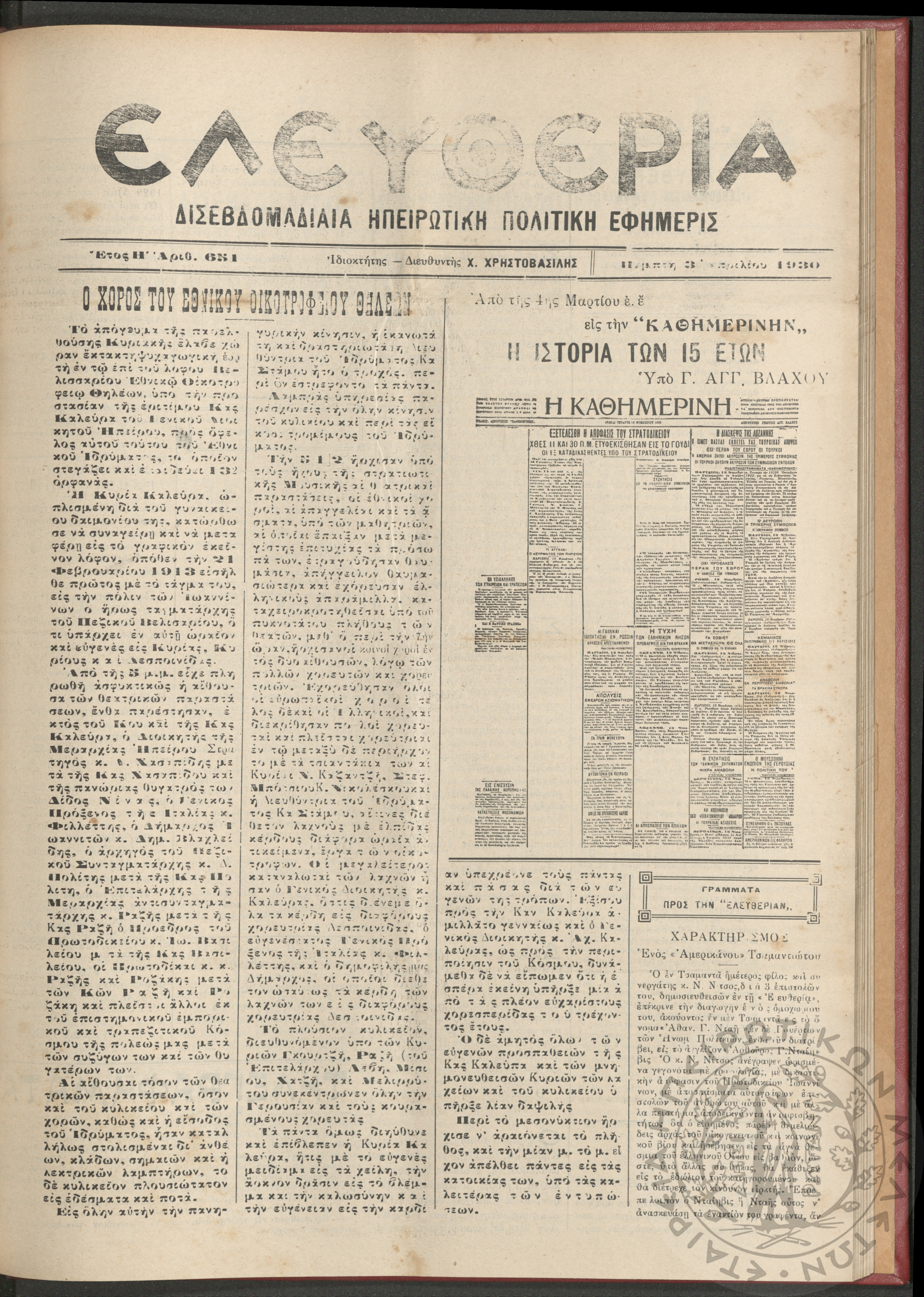 Ελευθερία: δισεβδομαδιαία Ηπειρωτική πολιτική εφημερίς, 1929, φ. 619