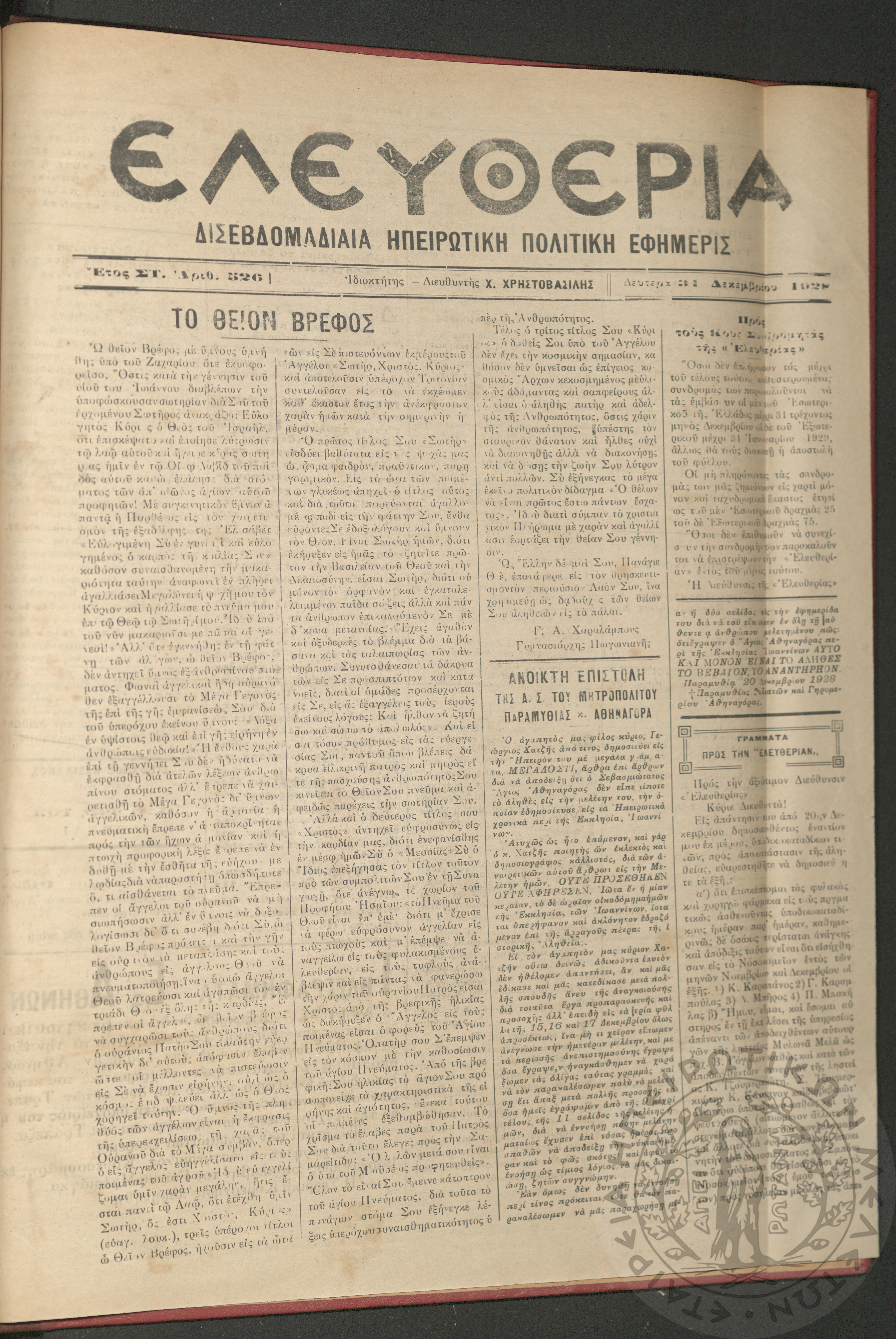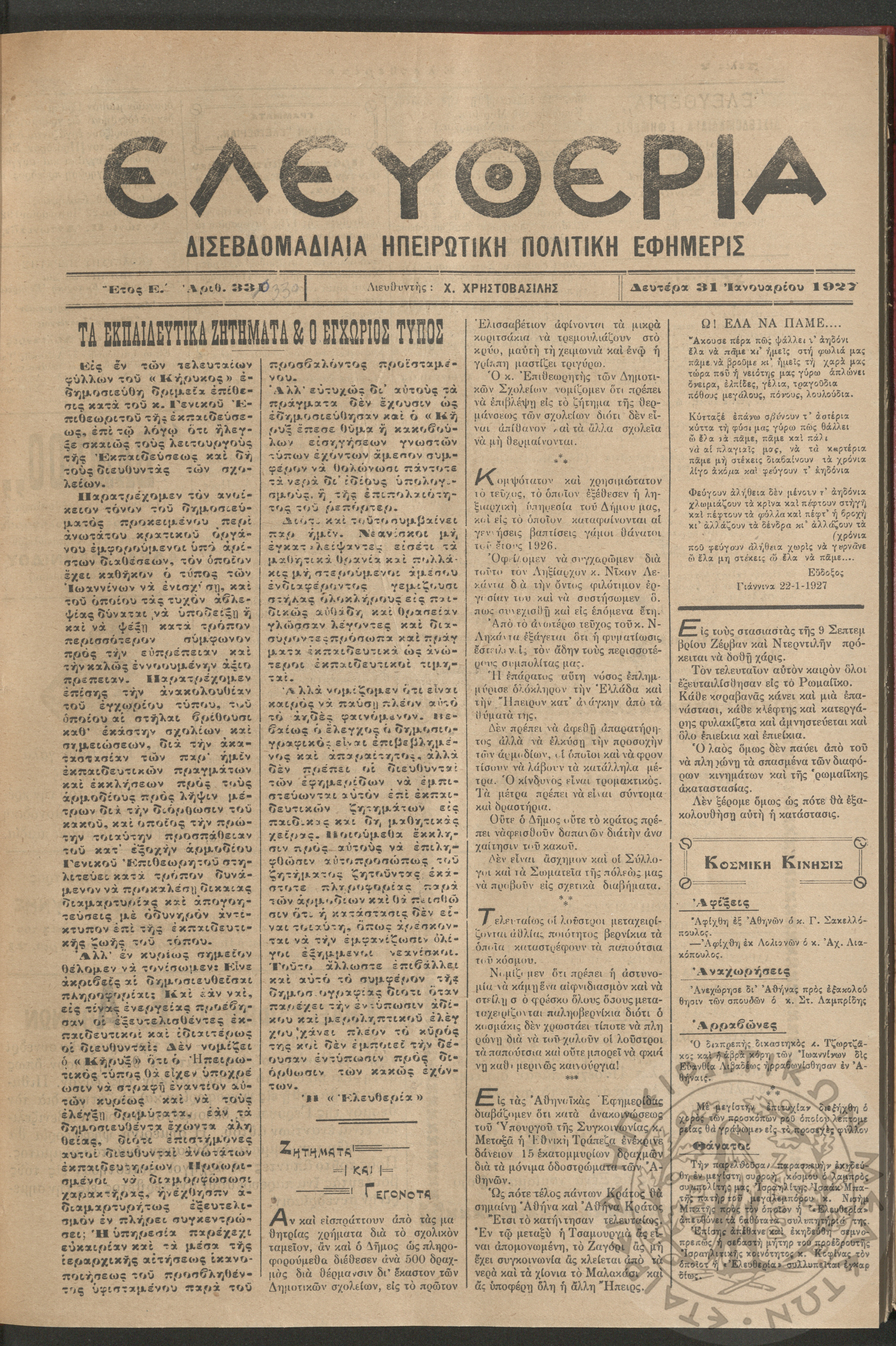 Ελευθερία: δισεβδομαδιαία Ηπειρωτική πολιτική εφημερίς, 1927, φ. 330