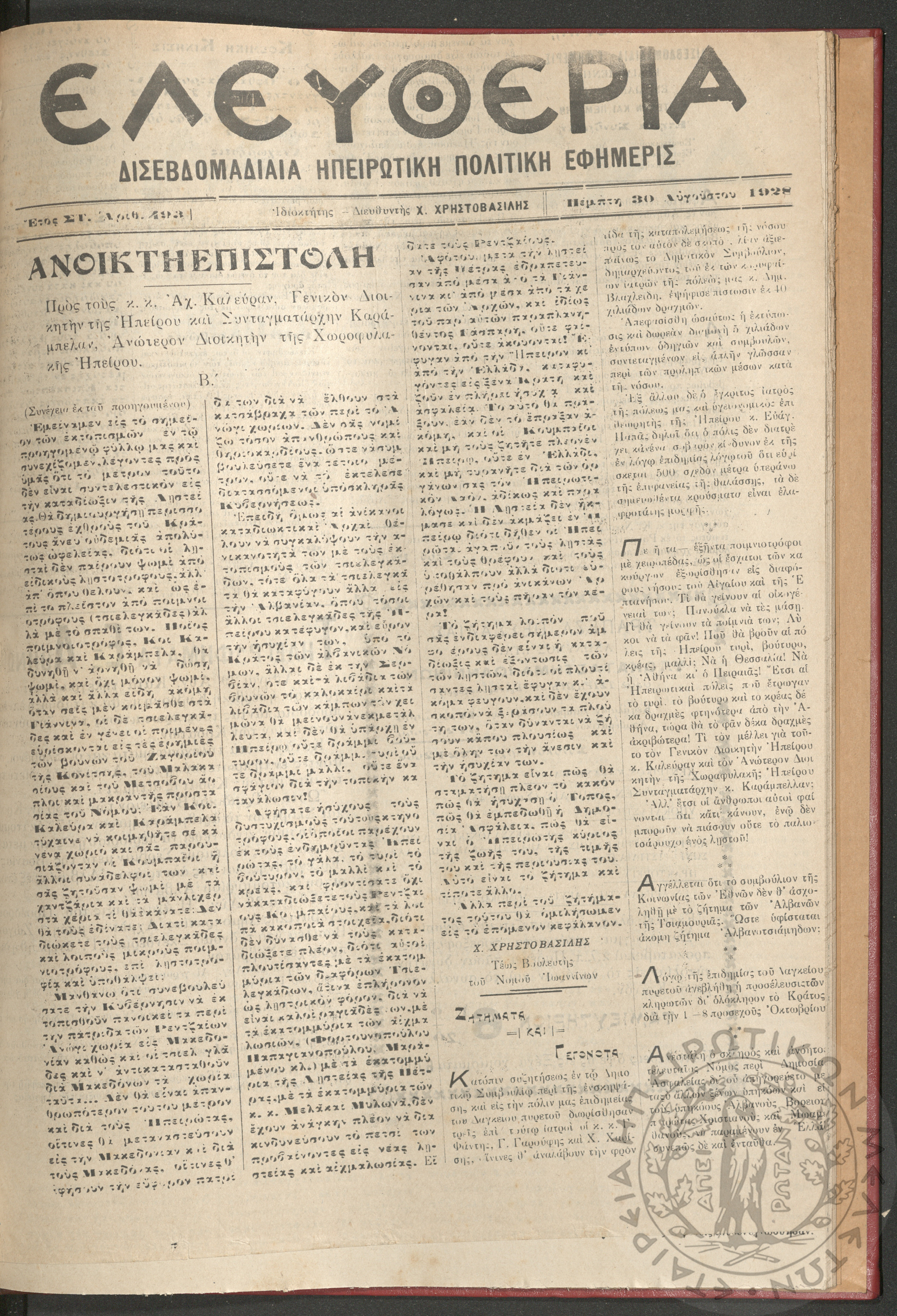 Ελευθερία: δισεβδομαδιαία Ηπειρωτική πολιτική εφημερίς, 1930, φ. 651