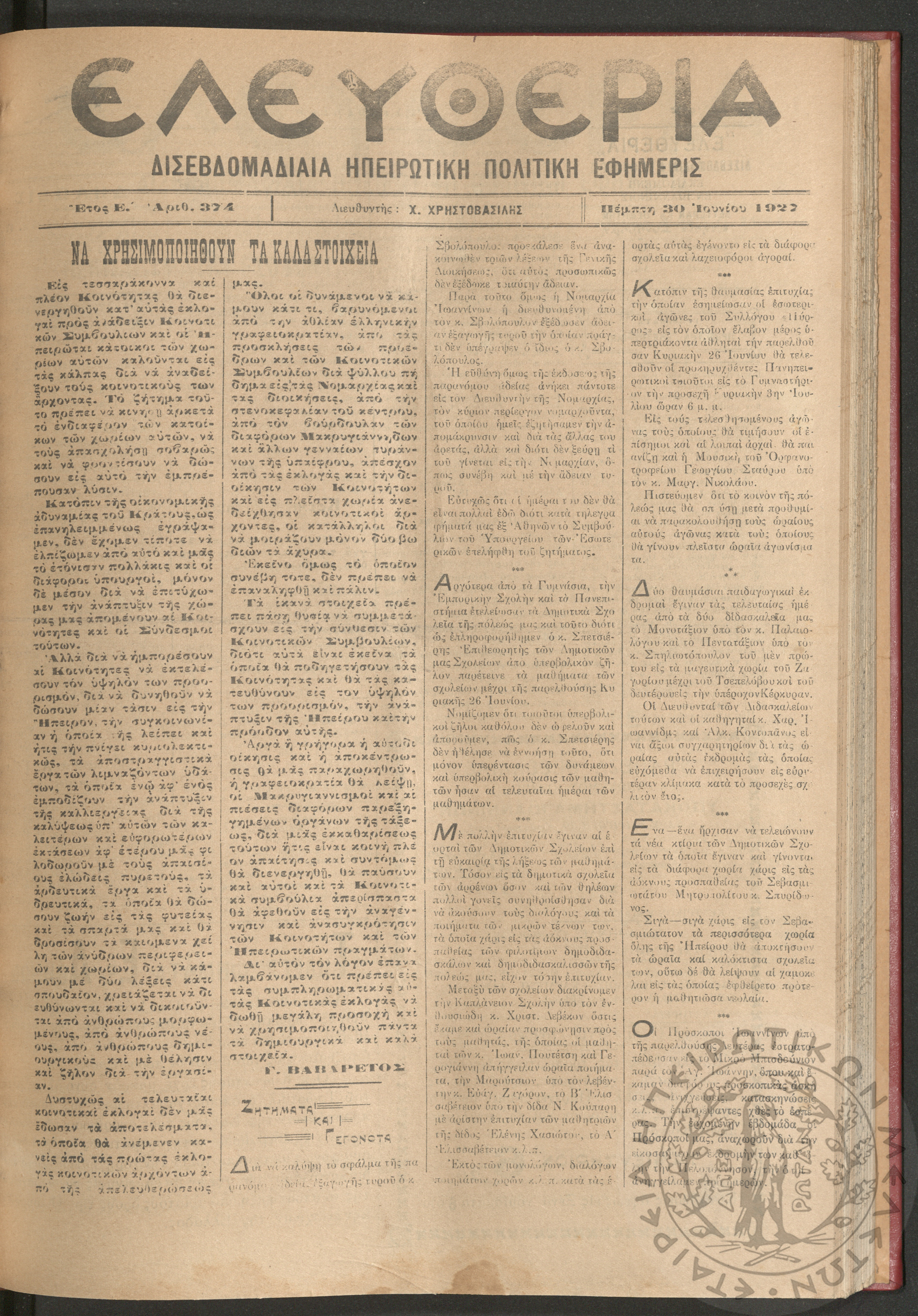 Ελευθερία: δισεβδομαδιαία Ηπειρωτική πολιτική εφημερίς, 1927, φ. 374