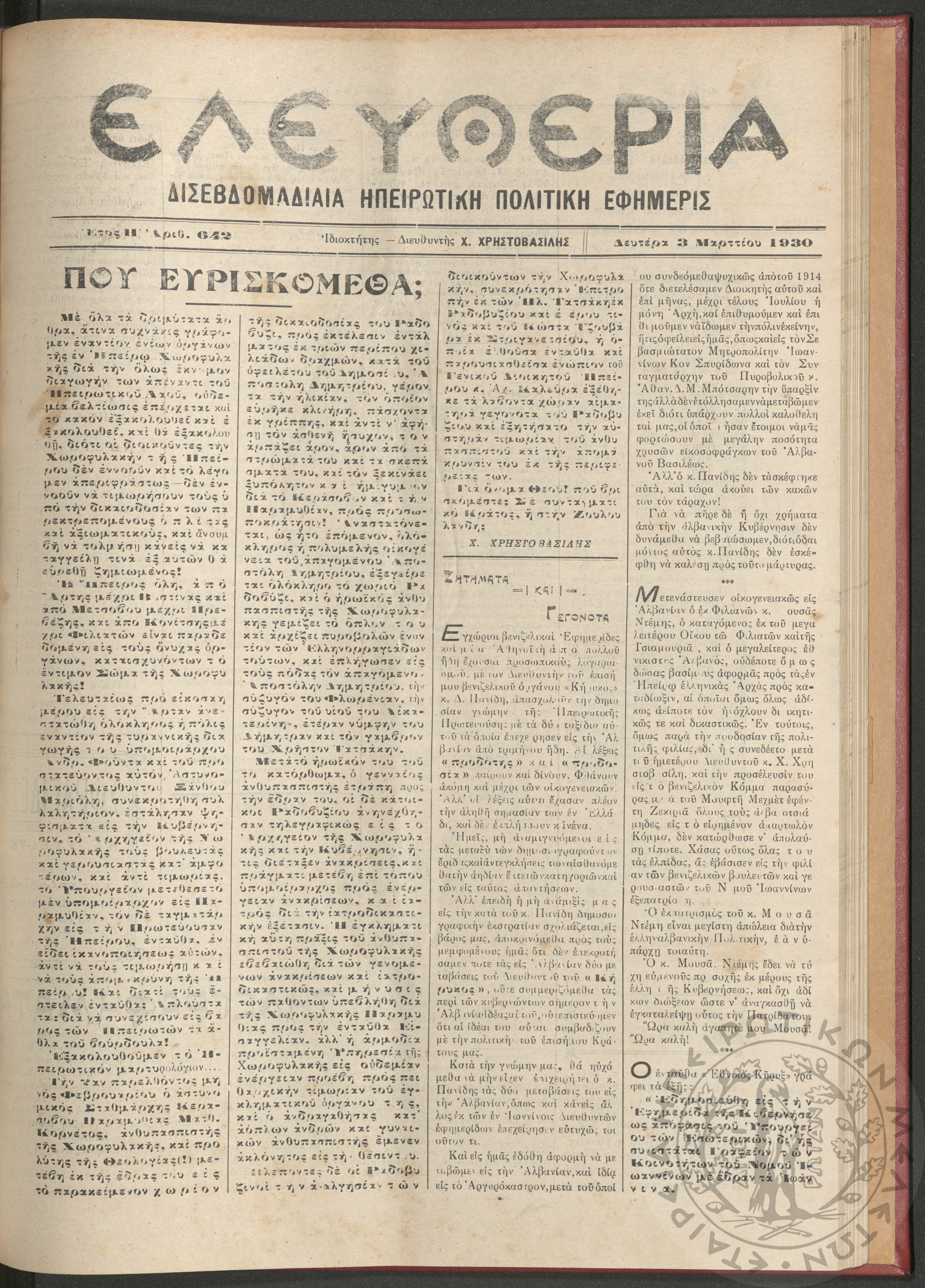 Ελευθερία: δισεβδομαδιαία Ηπειρωτική πολιτική εφημερίς, 1930, φ. 642