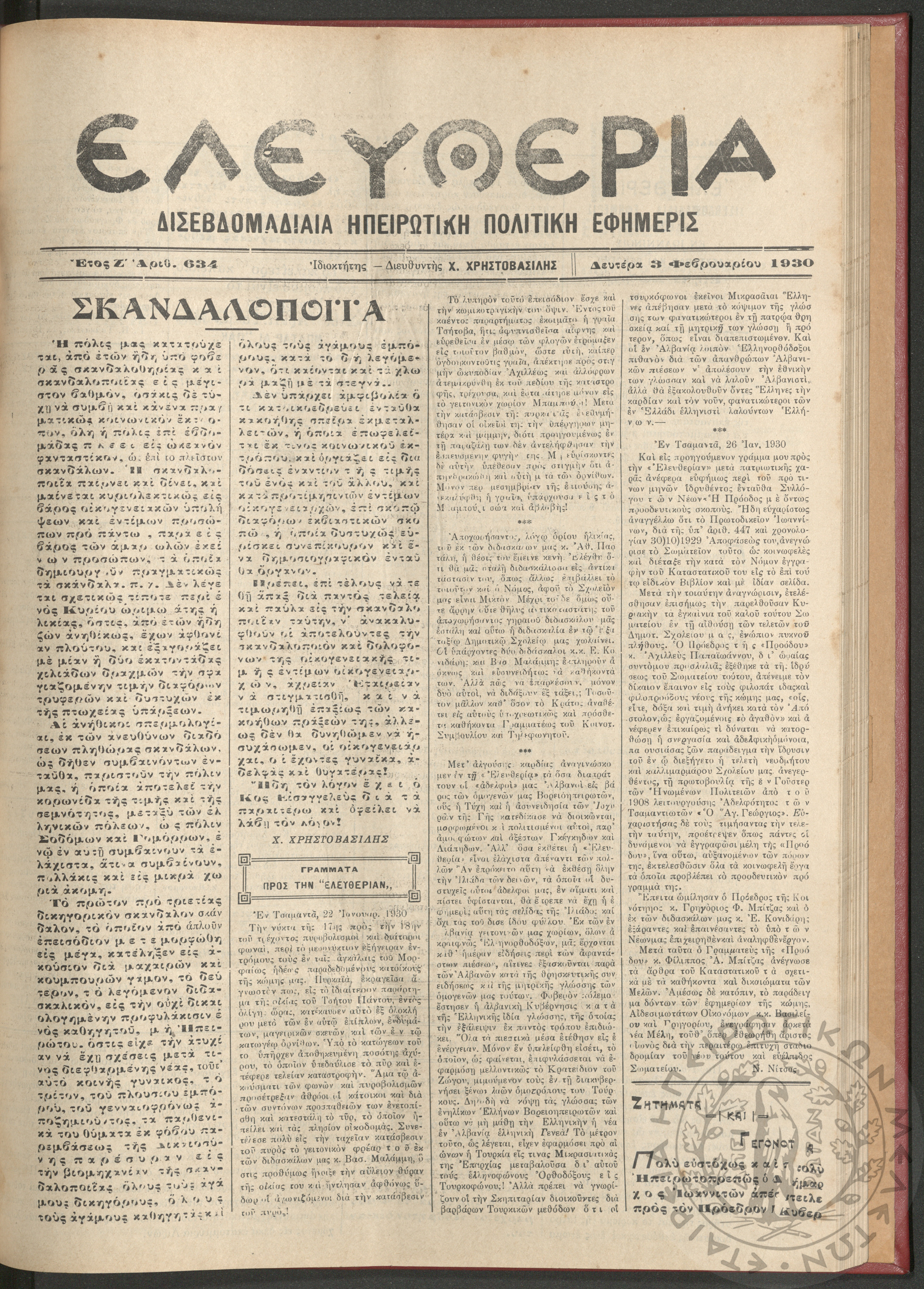 Ελευθερία: δισεβδομαδιαία Ηπειρωτική πολιτική εφημερίς, 1930, φ. 634