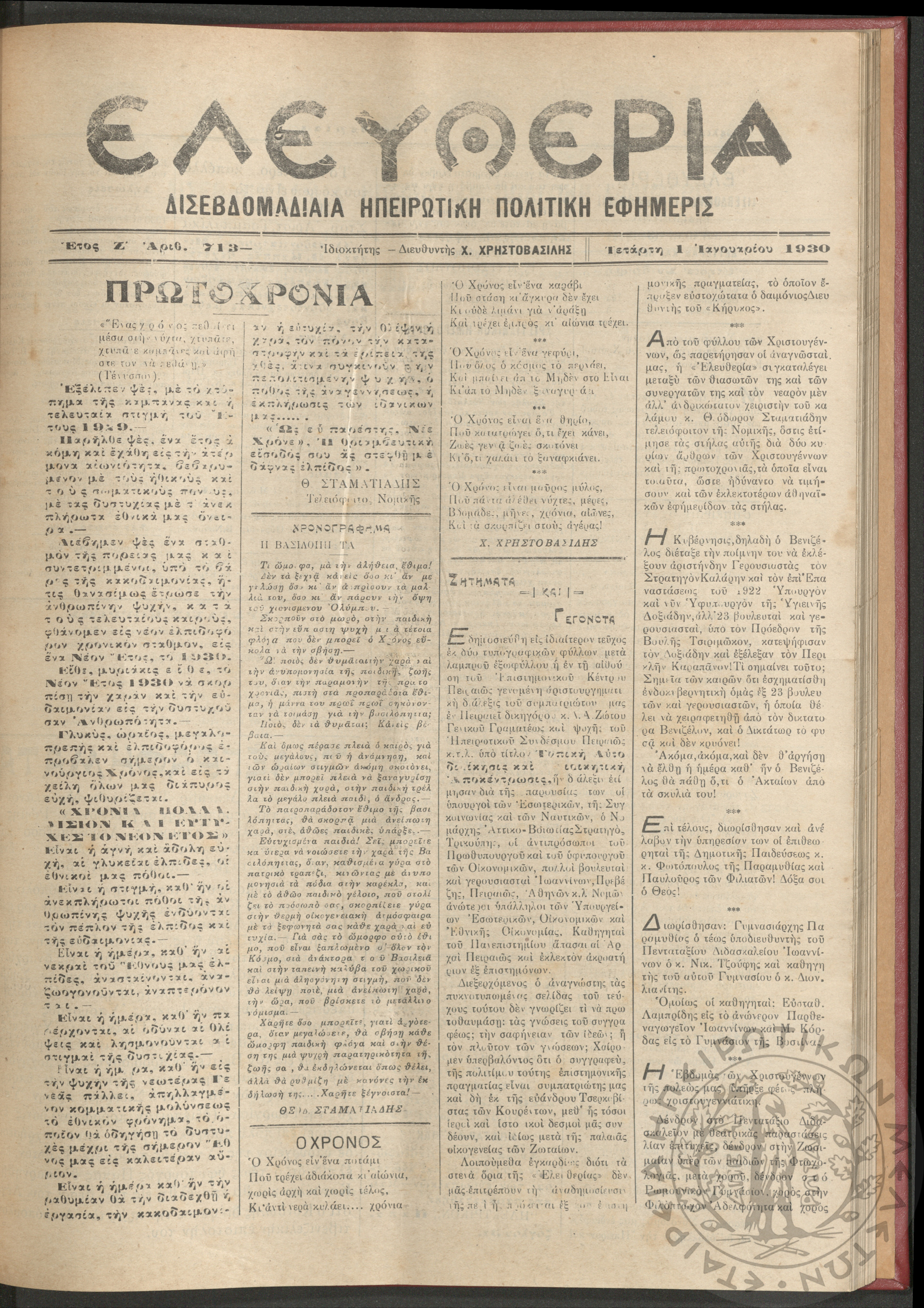 Ελευθερία: δισεβδομαδιαία Ηπειρωτική πολιτική εφημερίς, 1930, φ. 713