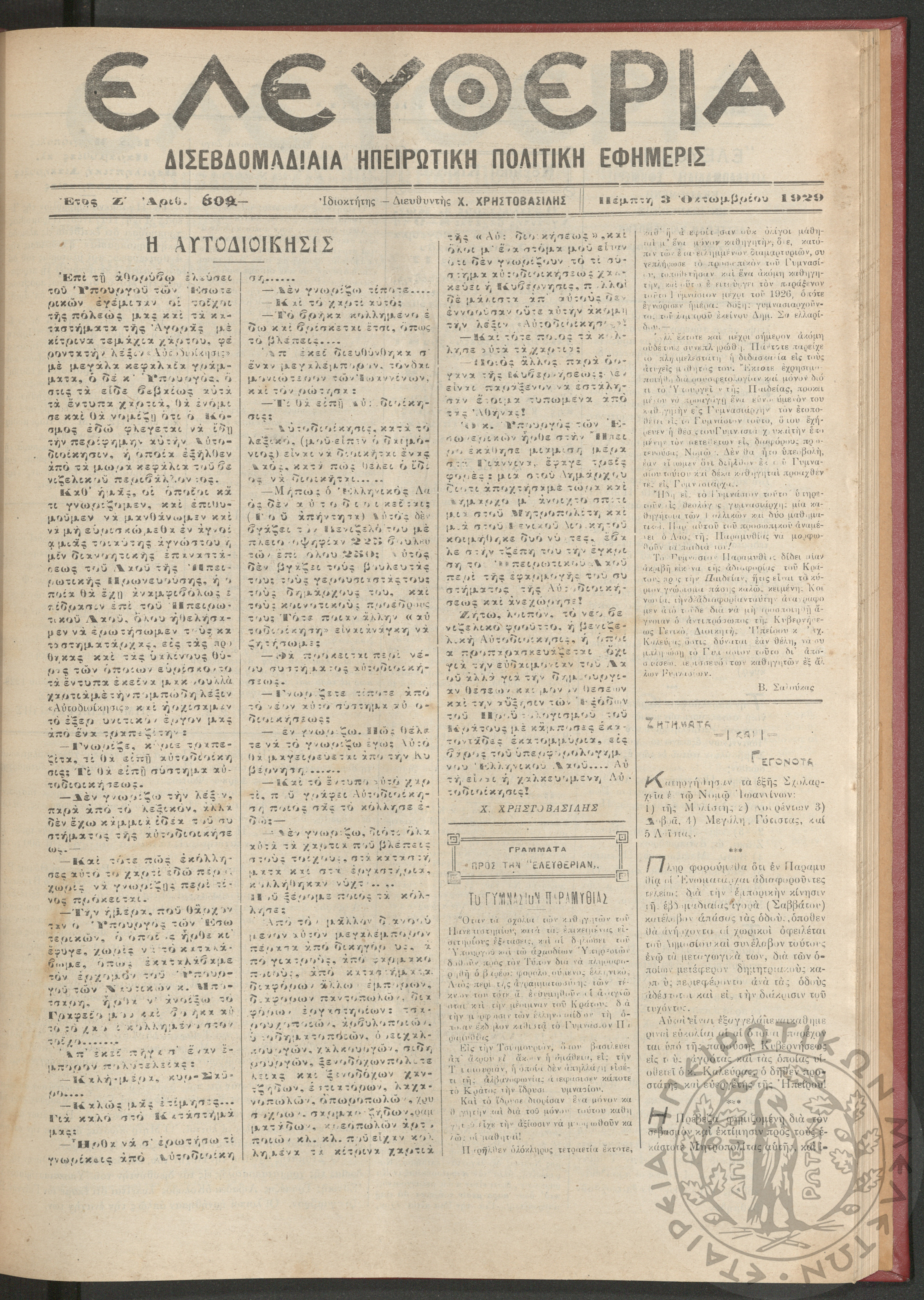 Ελευθερία: δισεβδομαδιαία Ηπειρωτική πολιτική εφημερίς, 1929, φ. 609