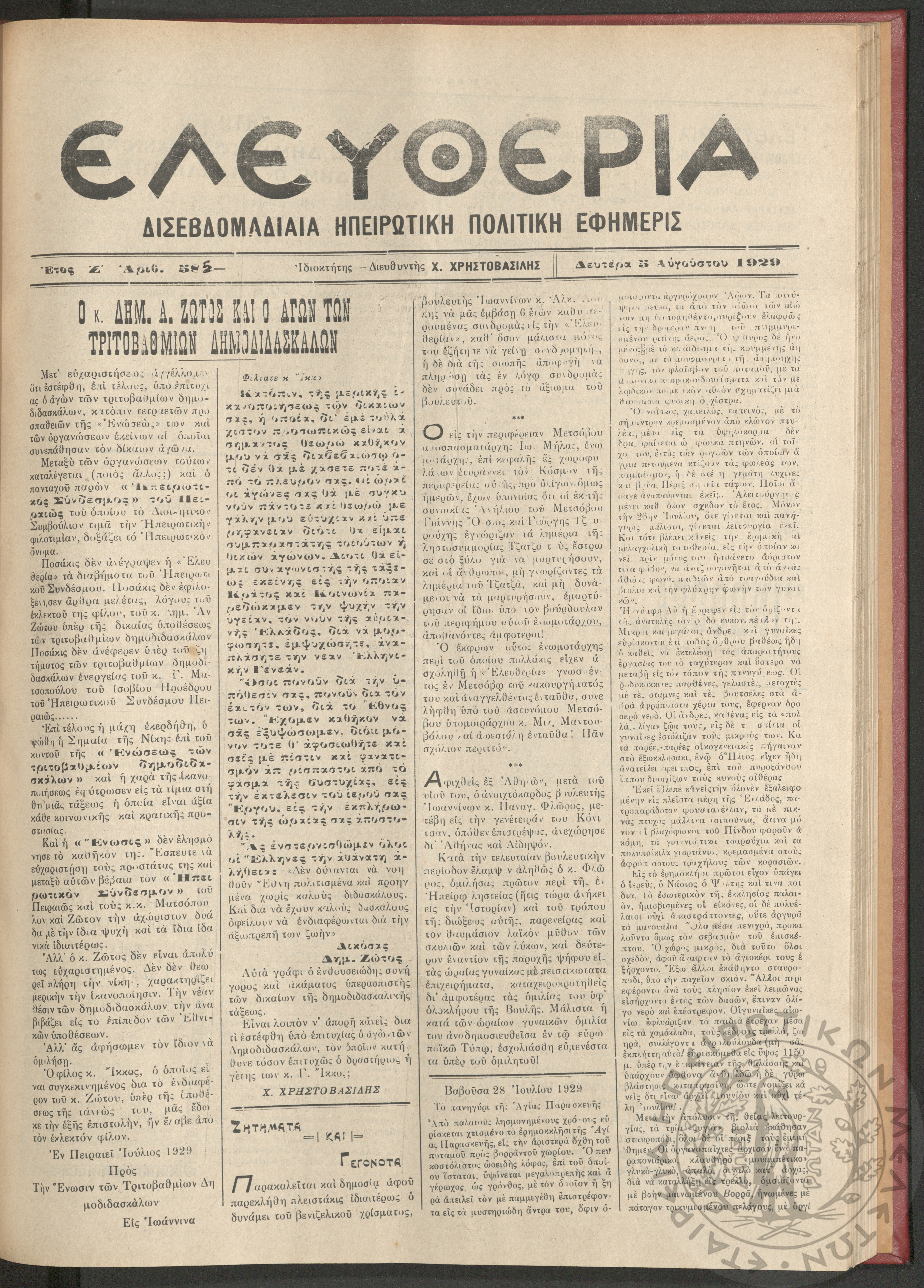 Ελευθερία: δισεβδομαδιαία Ηπειρωτική πολιτική εφημερίς, 1929, φ. 585