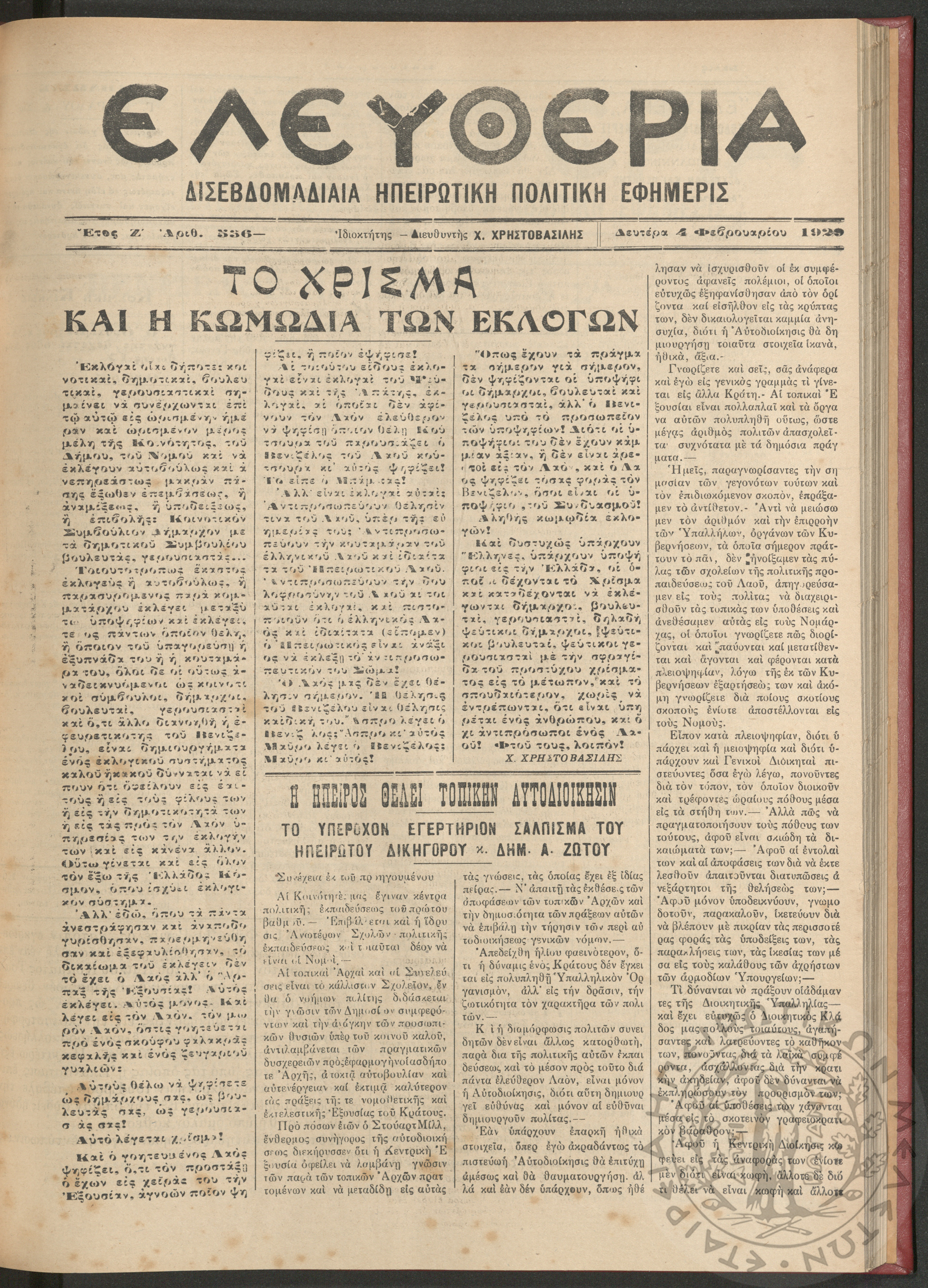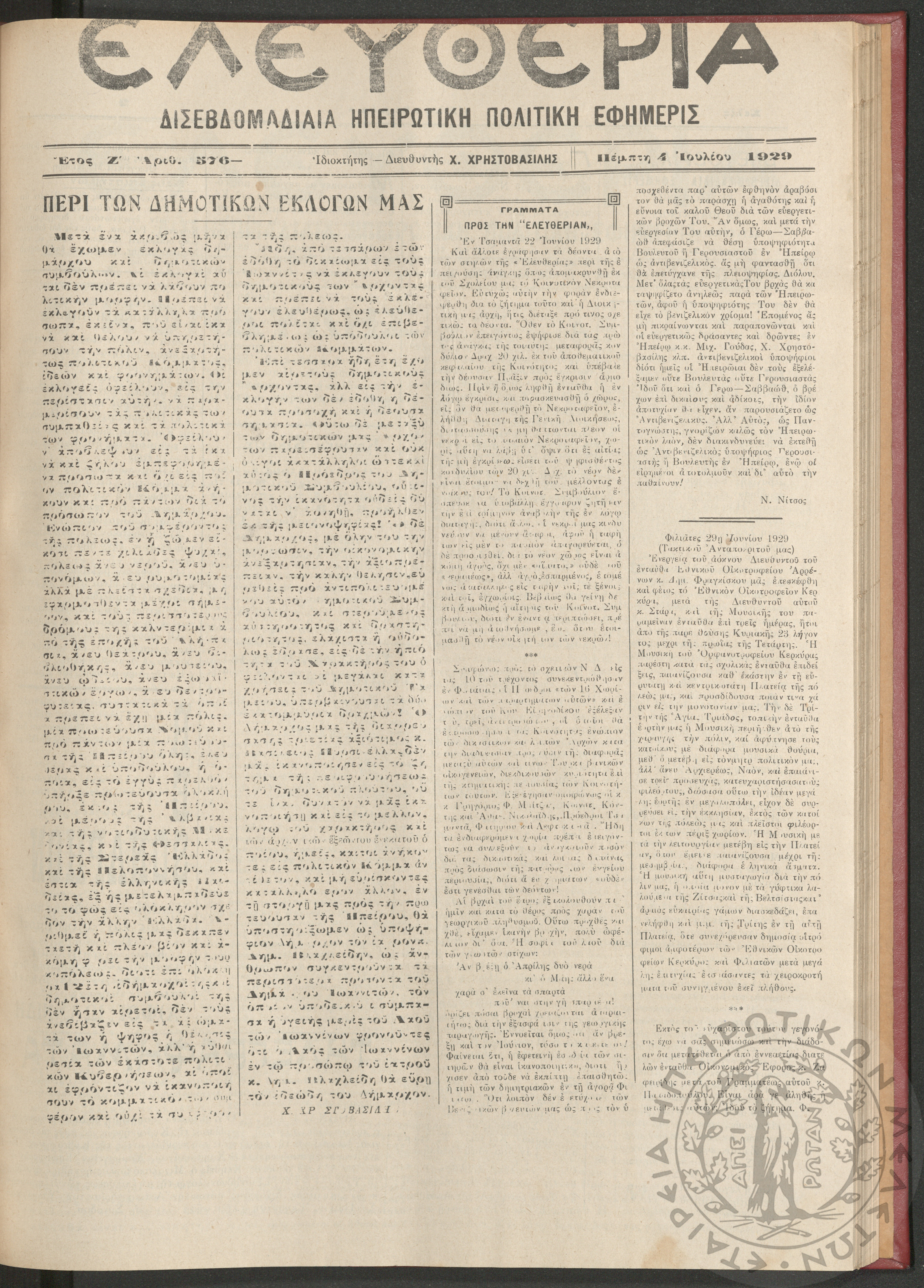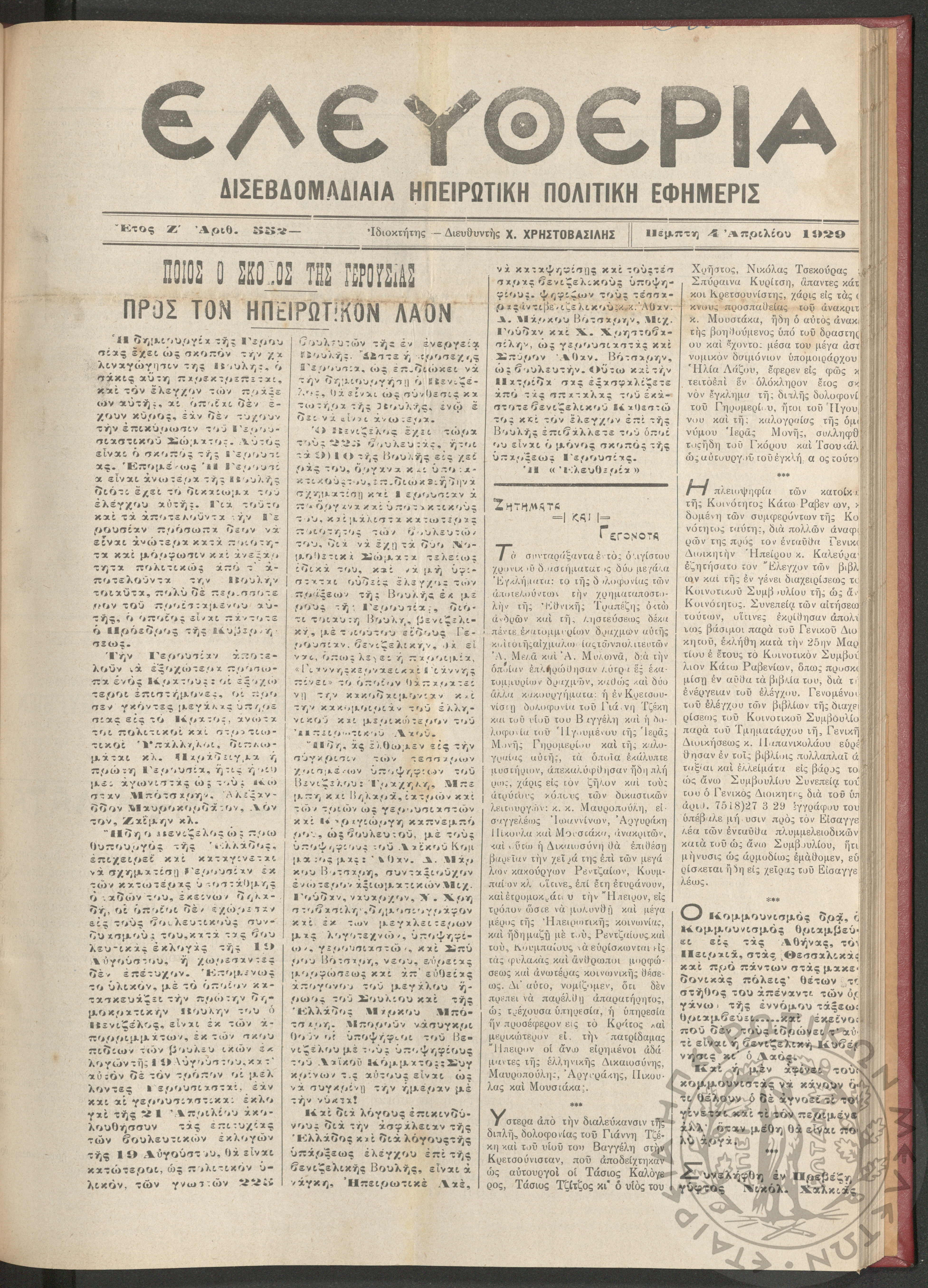 Ελευθερία: δισεβδομαδιαία Ηπειρωτική πολιτική εφημερίς, 1929, φ. 576